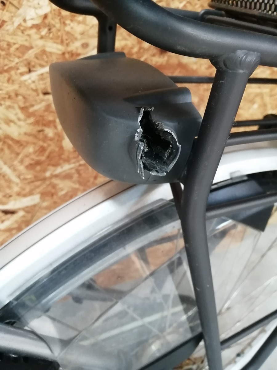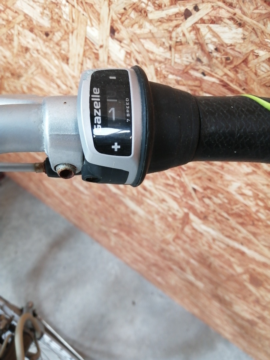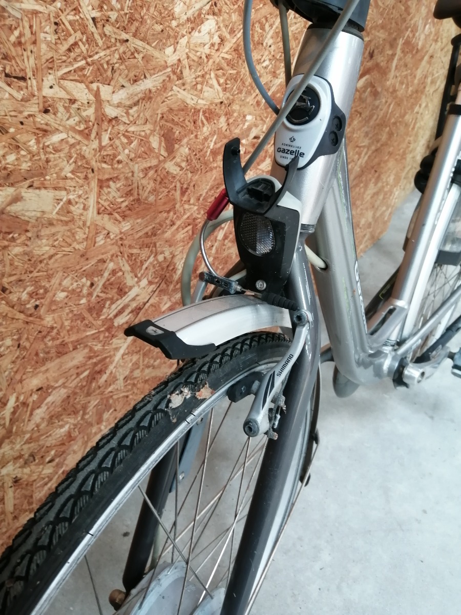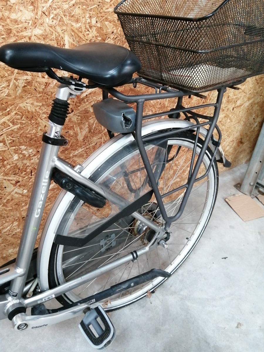 Gazelle el-cykel i grå / sølv - 28 tommer. 7 gear, men gear sidder fast. Stelnr. A1E27117. Den mangler batteri og oplader. Den er i stykker i låsen til batteriet. Den har brugsspor, en smule rust og trænger til et eftersyn. Brugt, hittegods