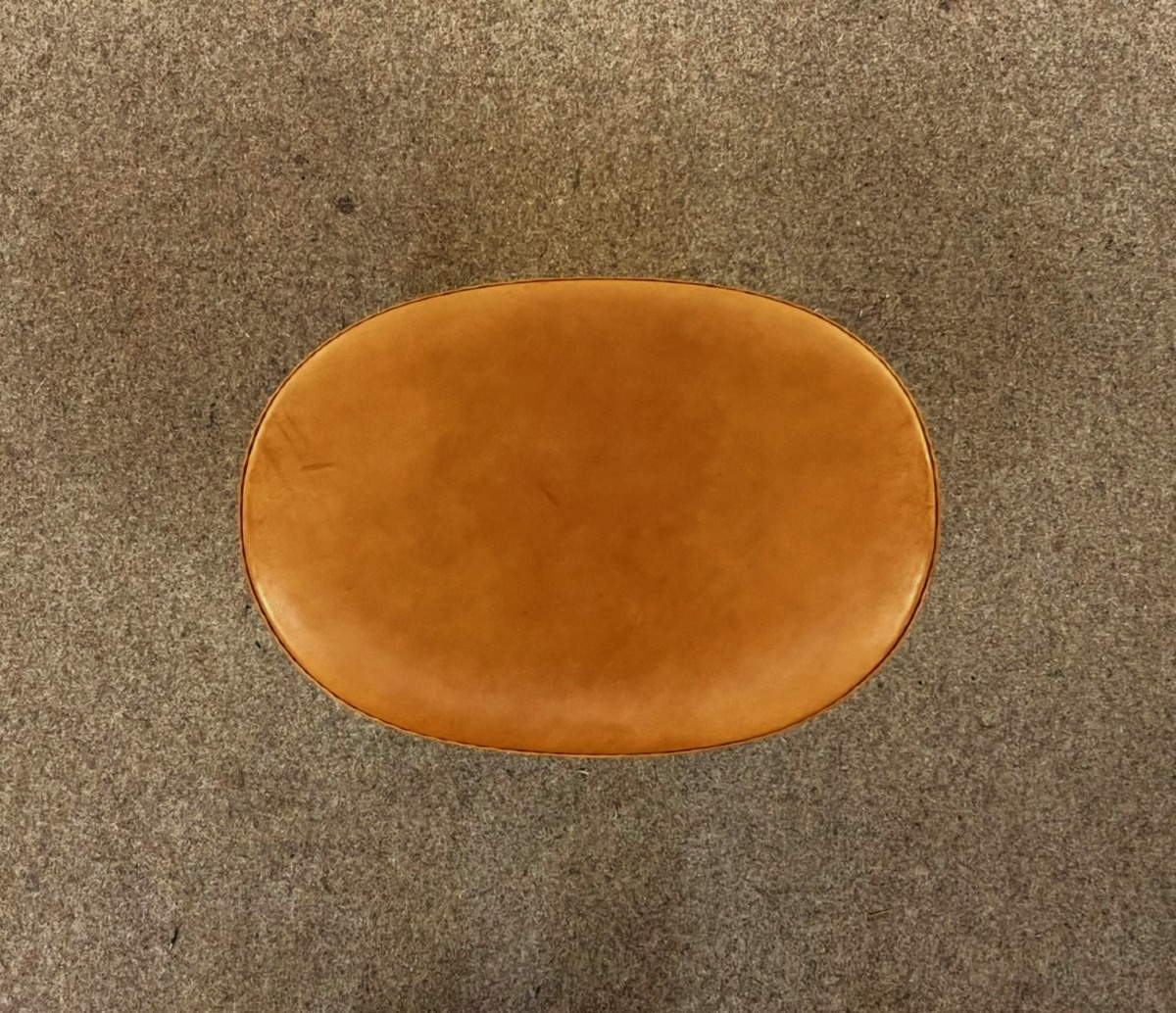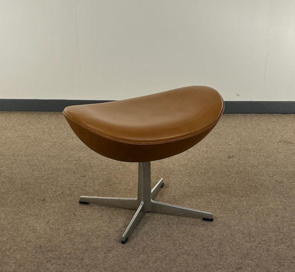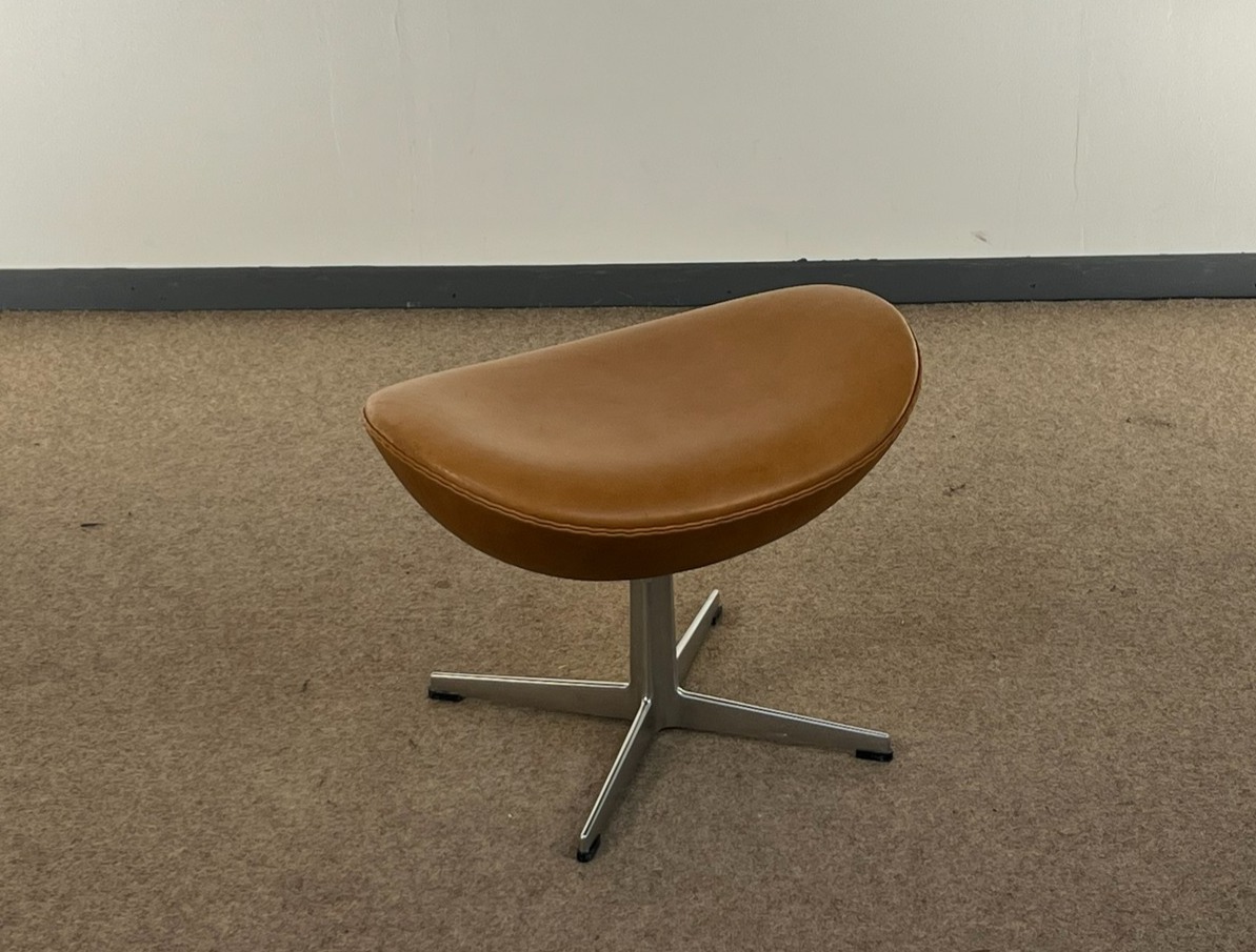 Arne Jacobsen 3127 fodskammel til ægget. Fremstillet i 2008 hos Fritz Hansen iflg. label. Cognacfarvet patineret læder. Har nyligt fået rens og pleje.