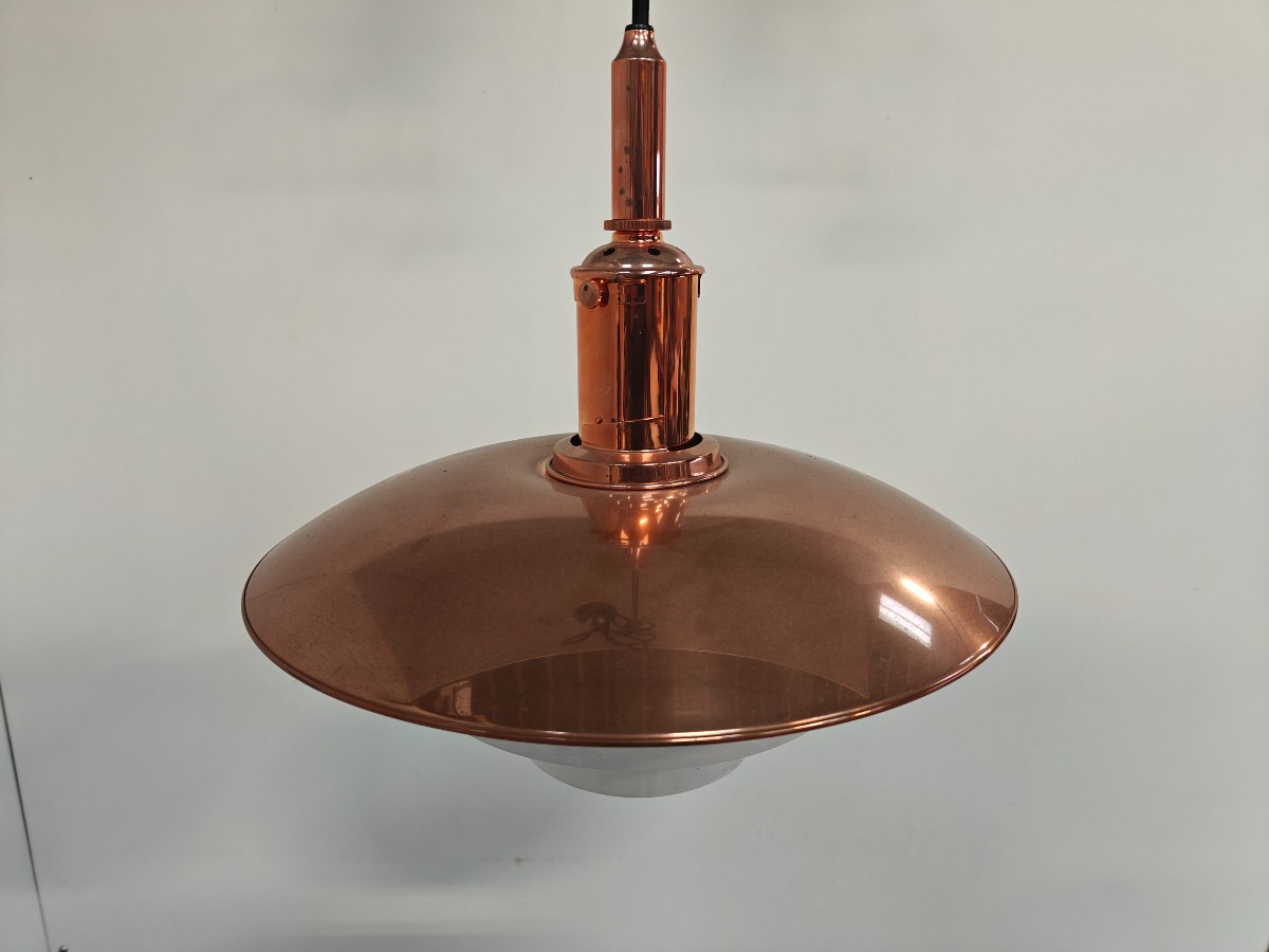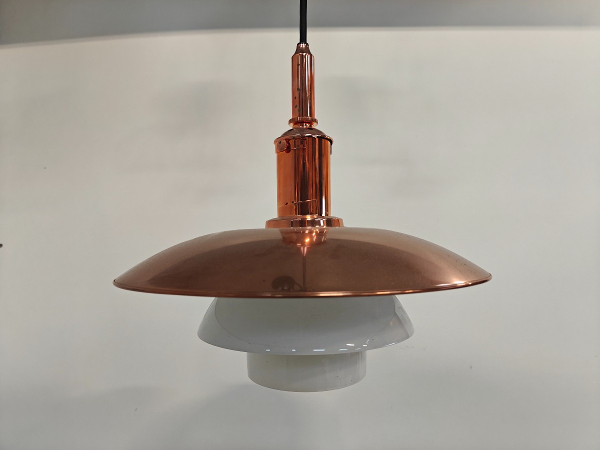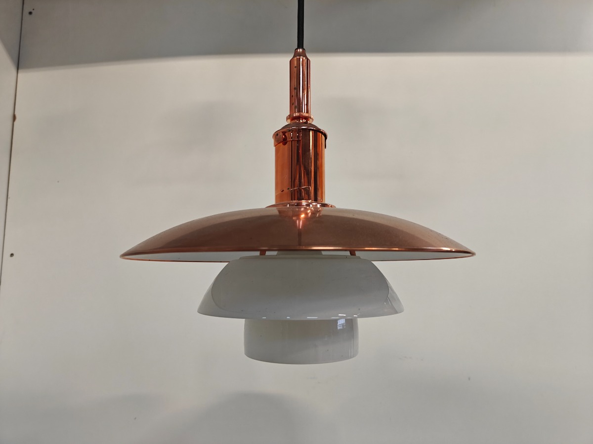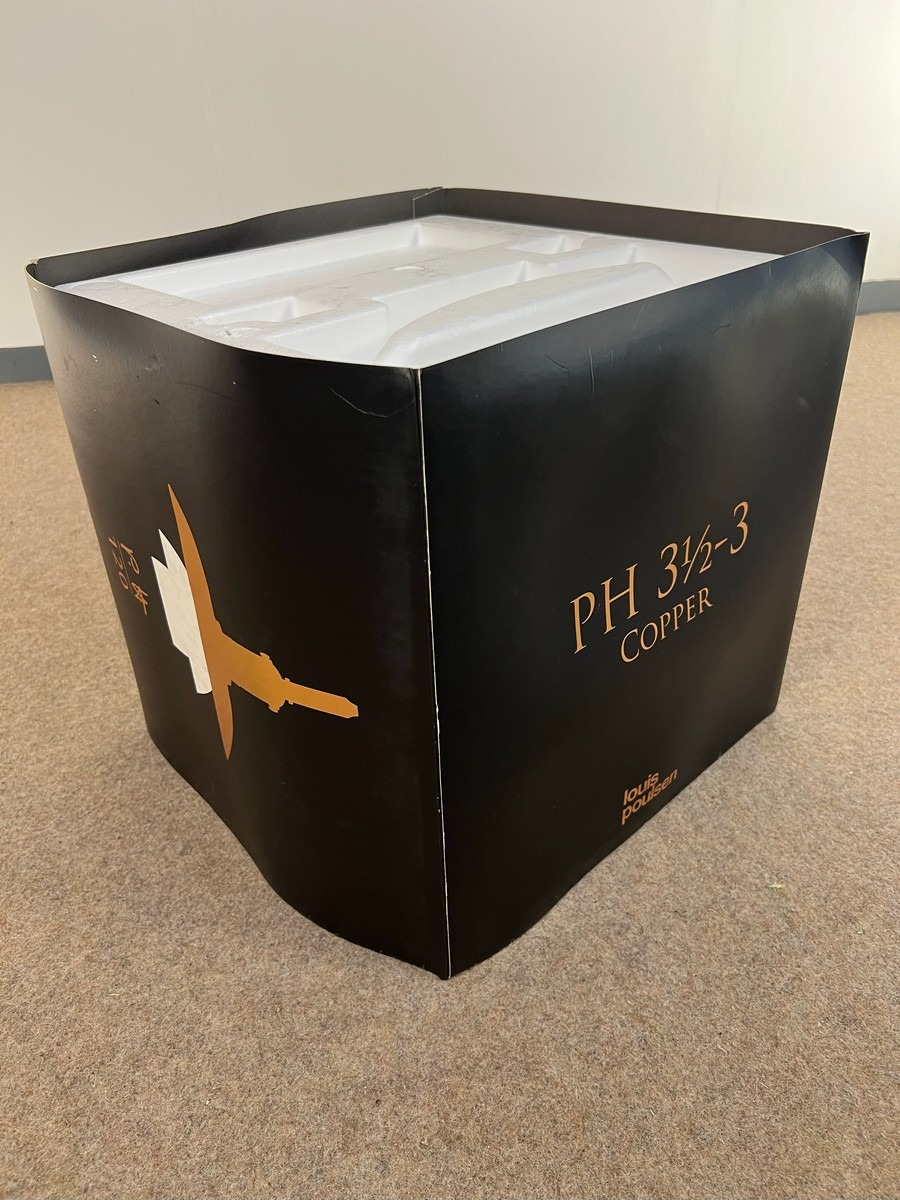 PH 3½ - 3 pendel af kobber. Limited edition. 120 års jubilæumsudgave. Fatningshus og overskærm af ubehandlet messing. Mellem og underskærm af opalglas. Udført hos Louis Poulsen. Lampen er nummereret. Begyndende patinereing af kobberdelene. Original kasse med sleve medfølger.