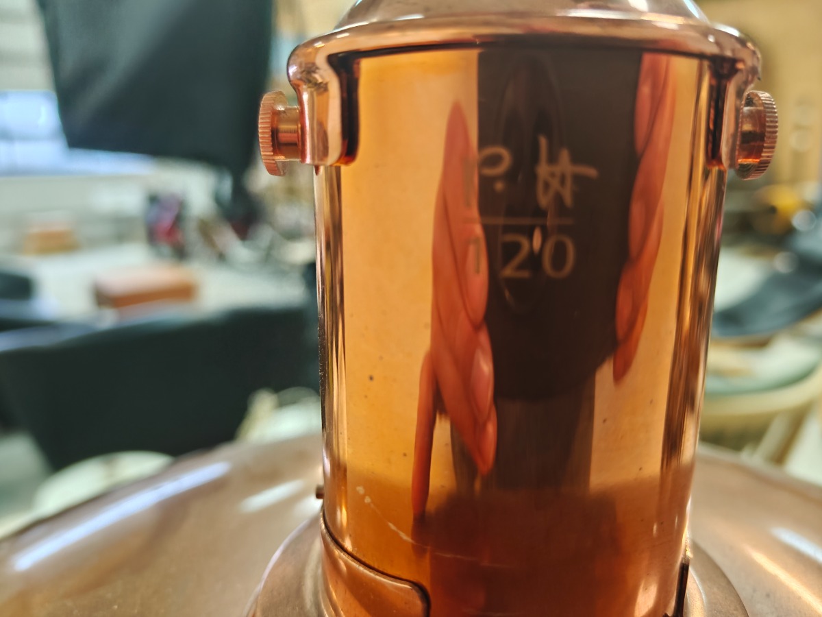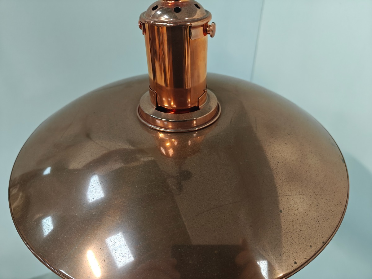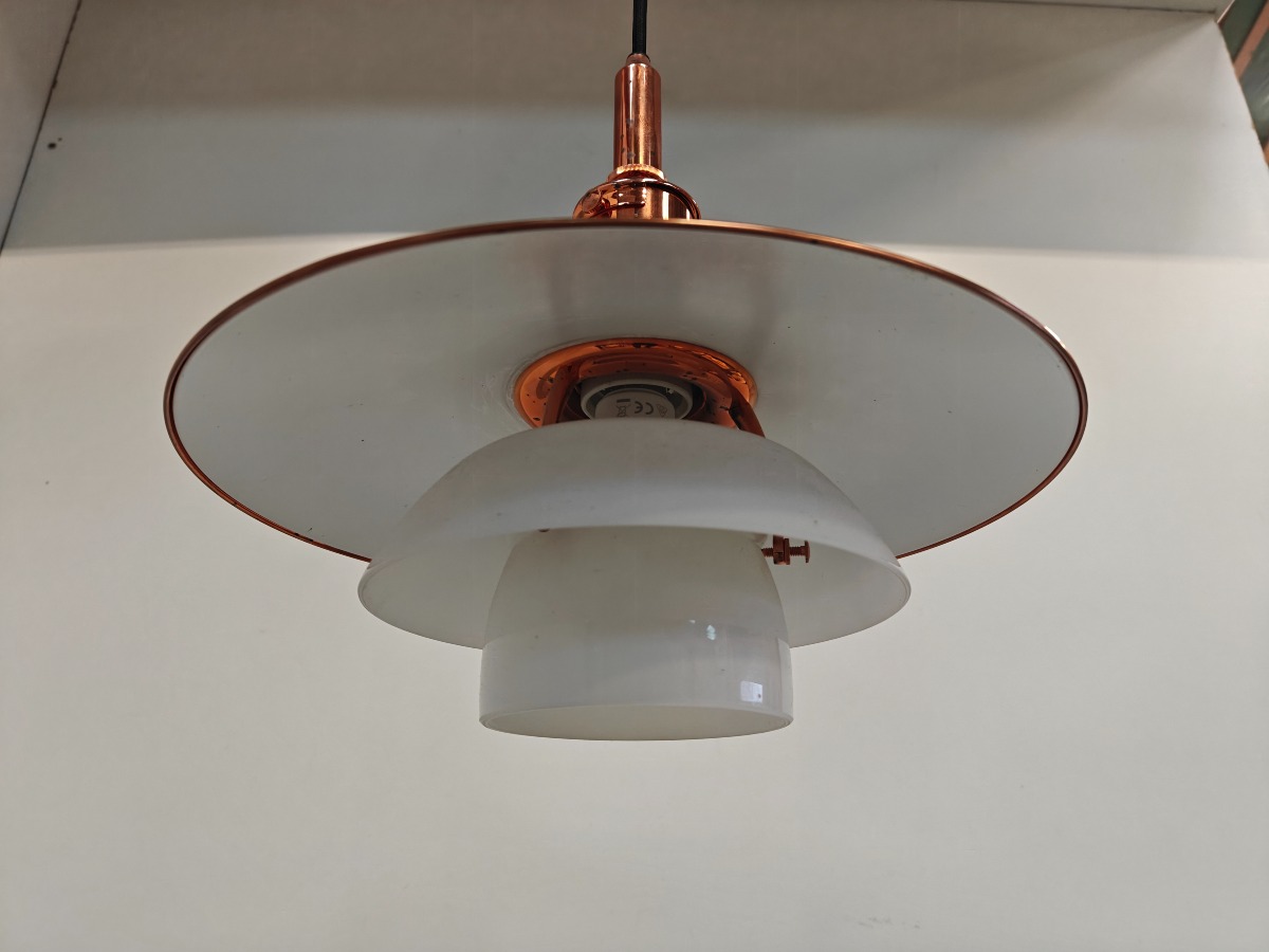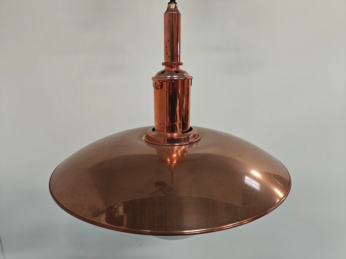 PH 3½ - 3 pendel af kobber. Limited edition. 120 års jubilæumsudgave. Fatningshus og overskærm af ubehandlet messing. Mellem og underskærm af opalglas. Udført hos Louis Poulsen. Lampen er nummereret. Begyndende patinereing af kobberdelene. Original kasse med sleve medfølger.