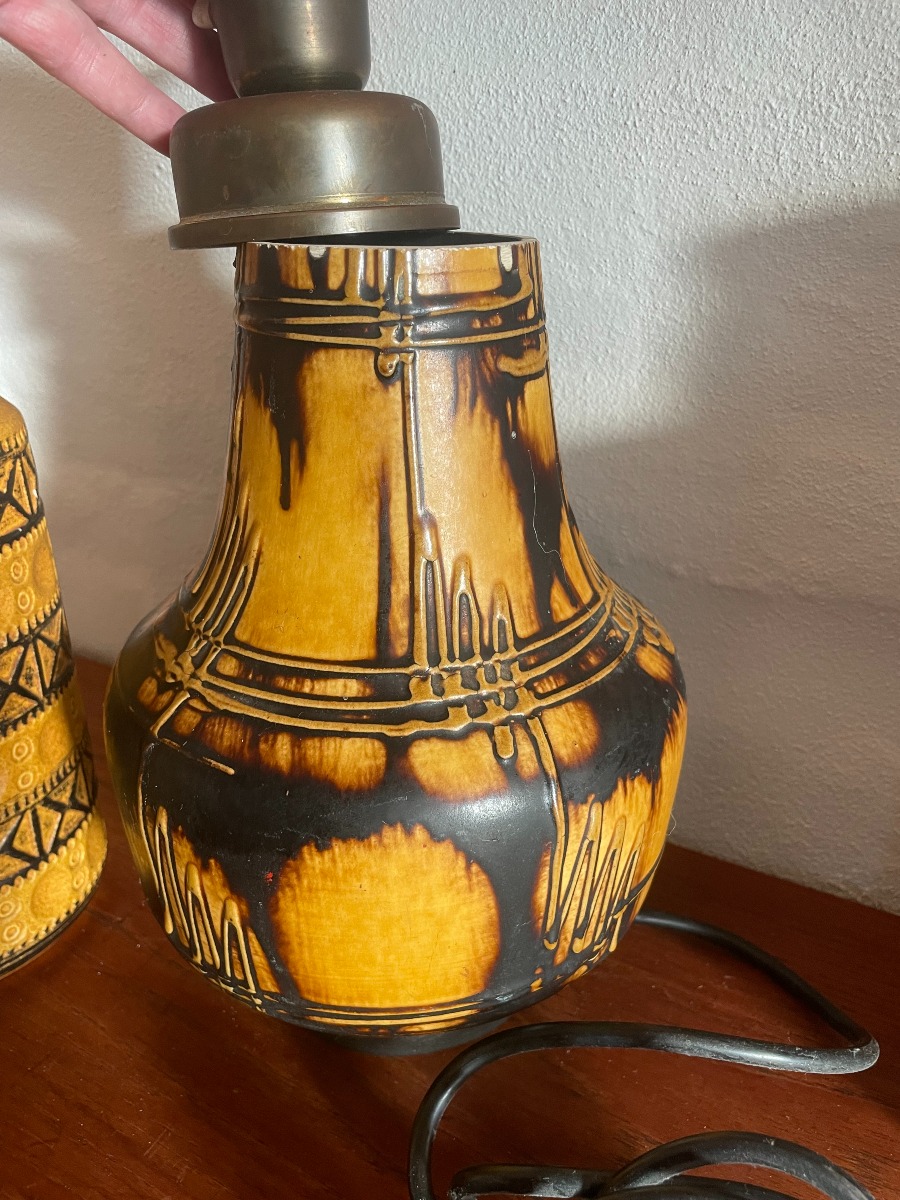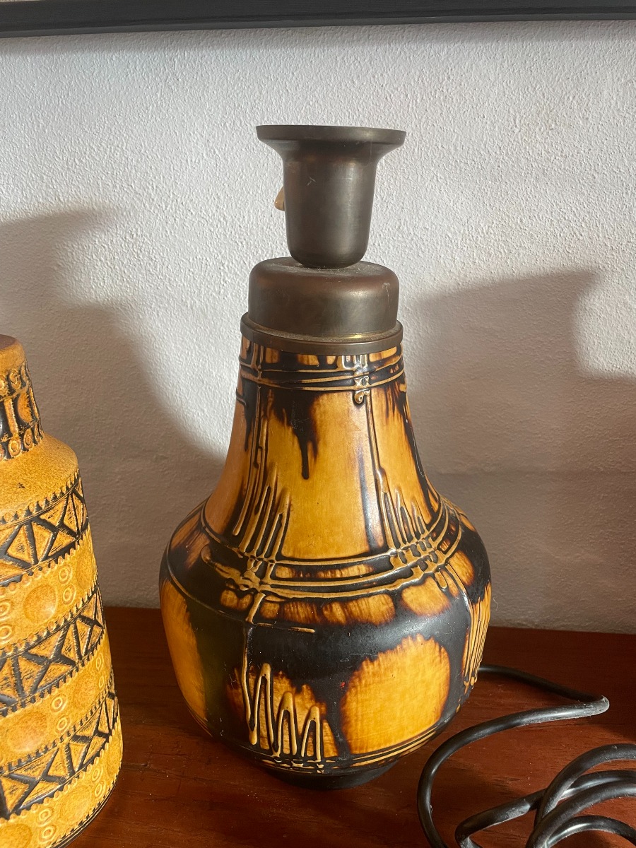 West Germany karry/brun med messing top. Model1038/35. Skal have lavet fatning, spændt fatningsstykket fast. Lille afslag ved fatningsstykket