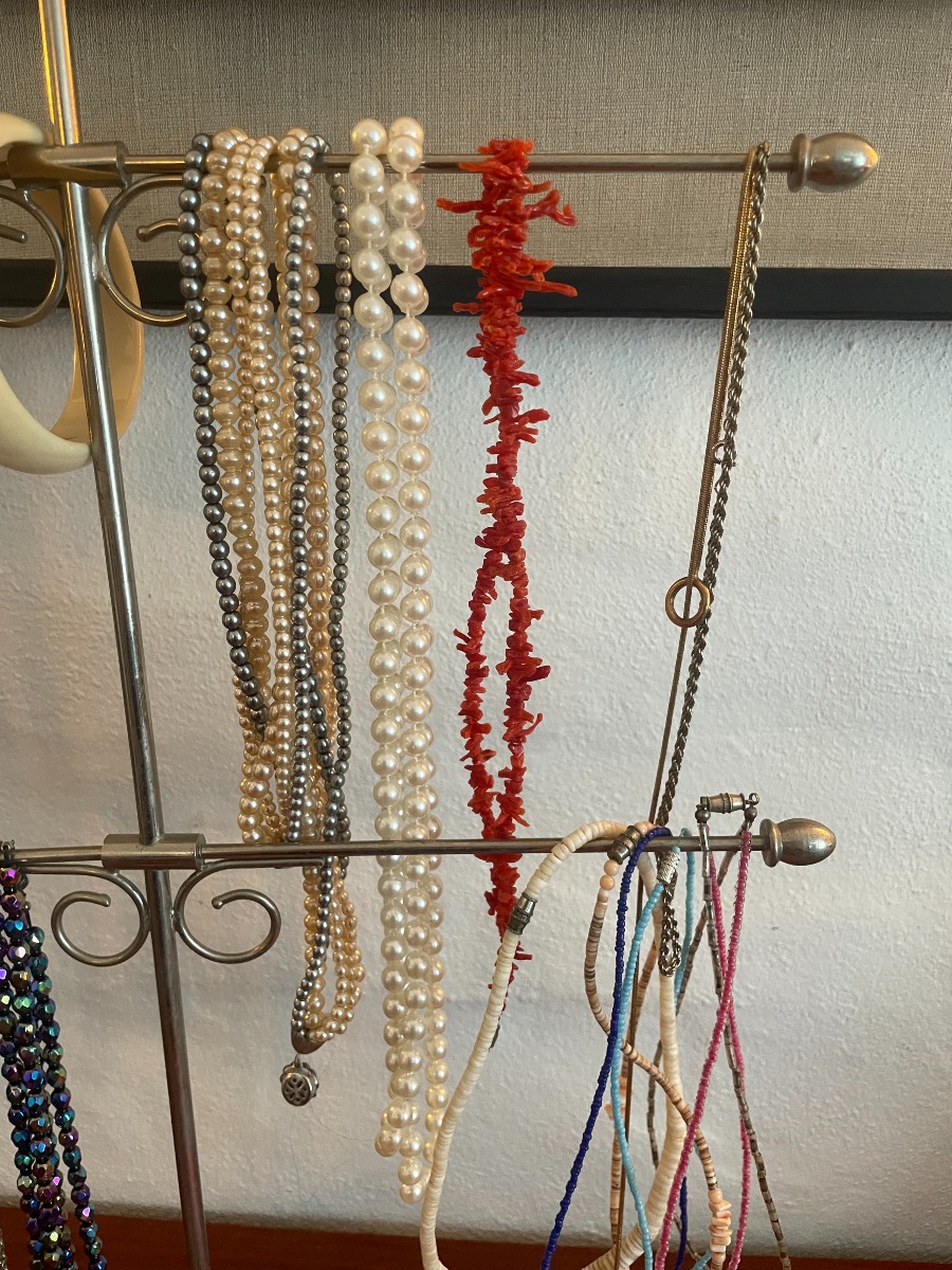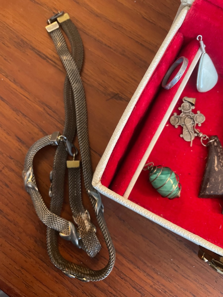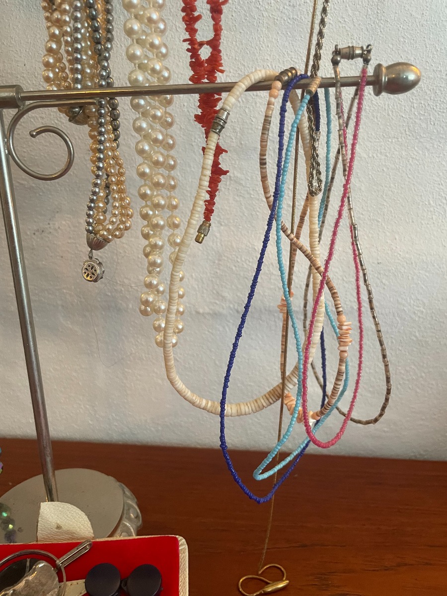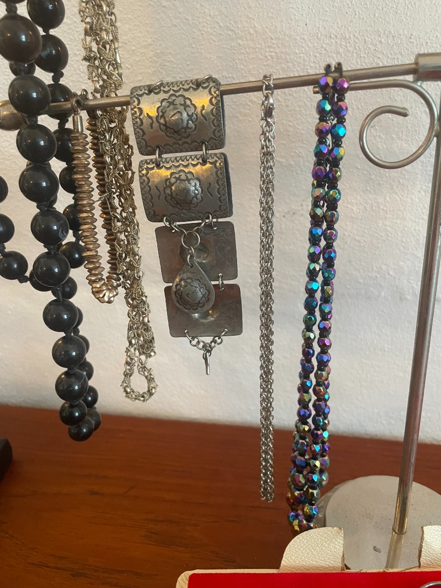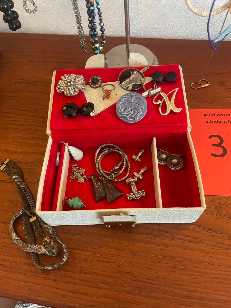 46 dele vintage/ældre smykker. En del skal have skiftet lås, enkelte skal limes. Smykkestativ og smykkeæske følger ikke med.