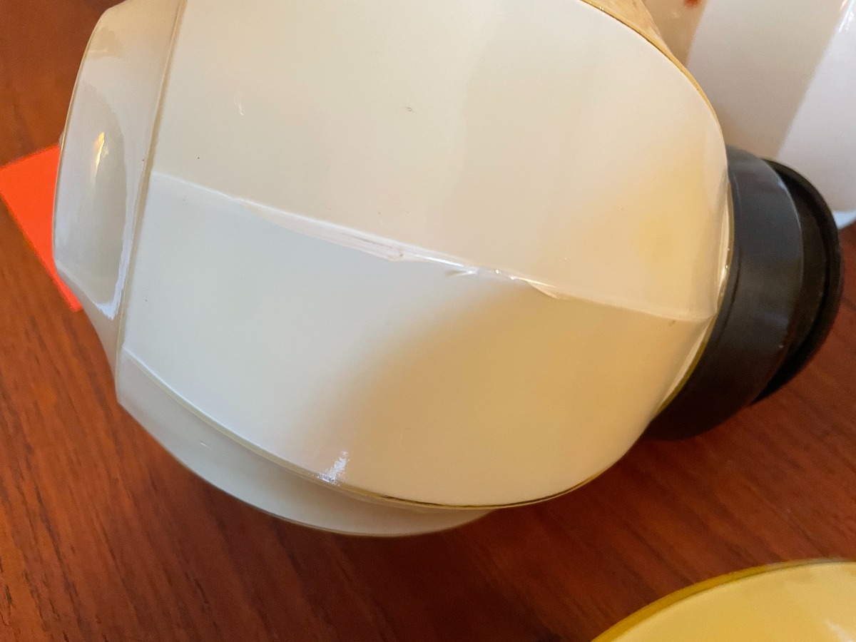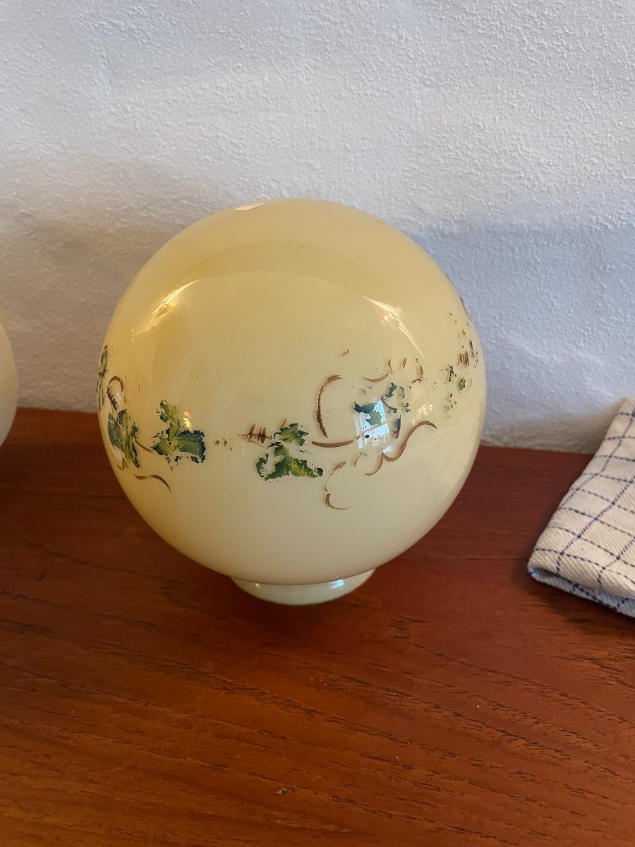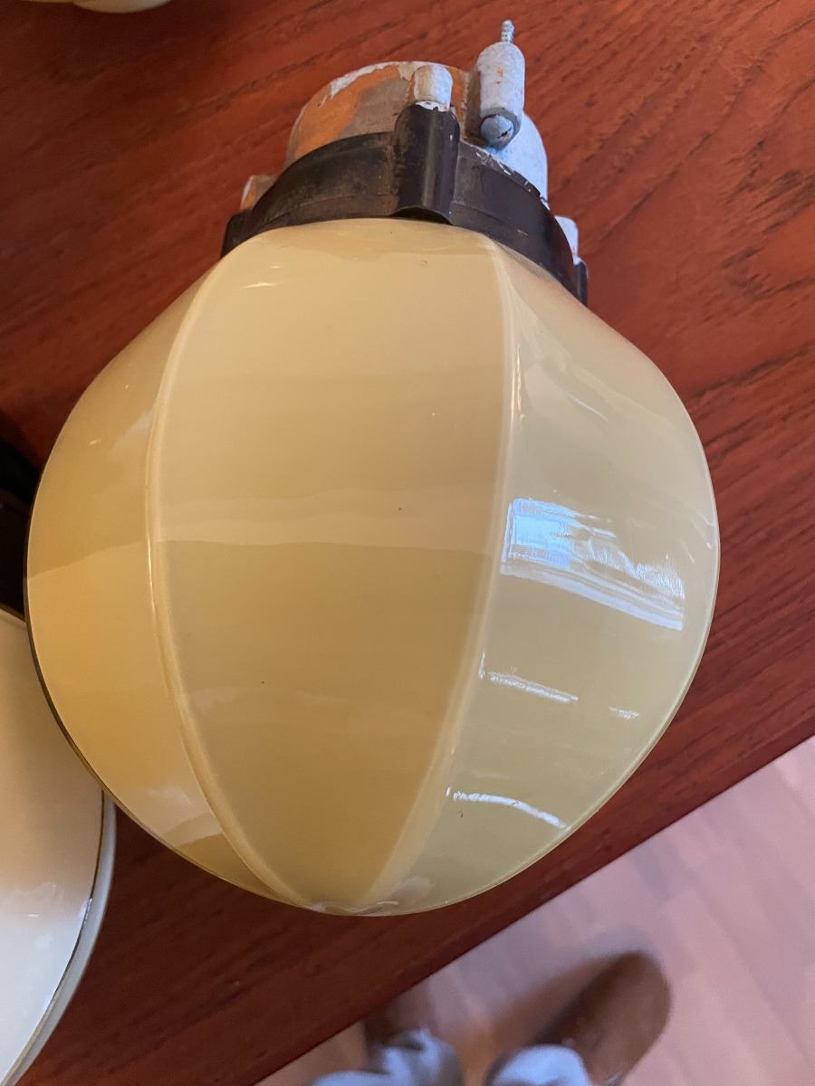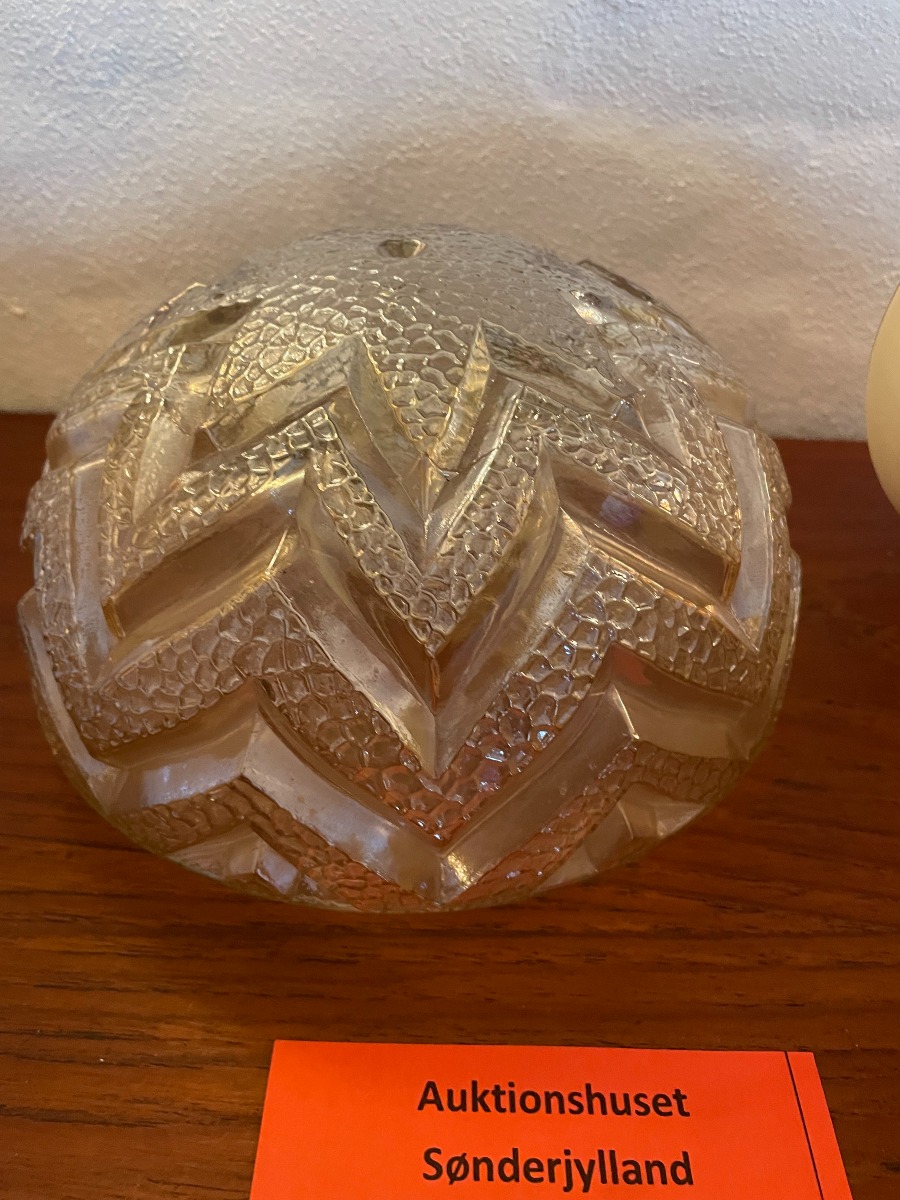 5 loftlamper, 2 med fatningshus. Alle med patina. En af lamperne, har en revne i glasset.