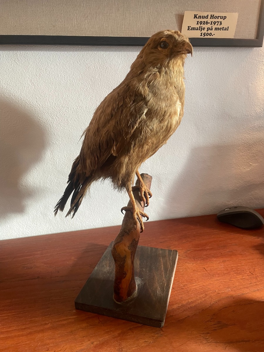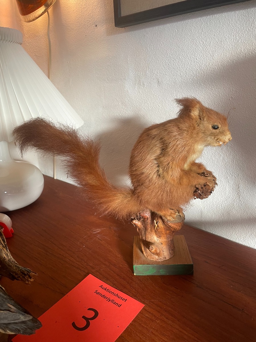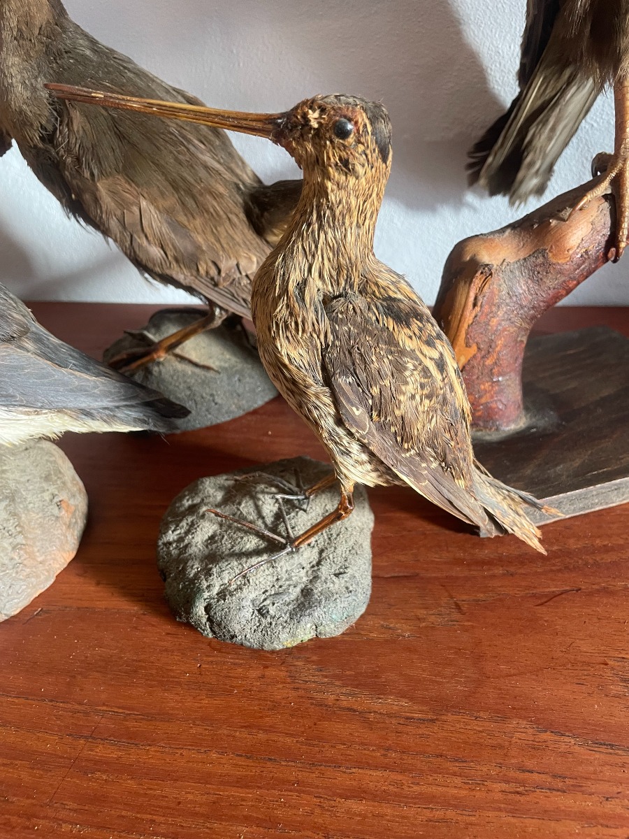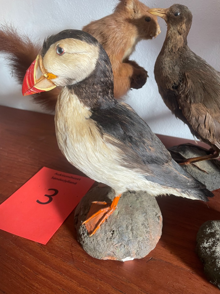 Søpapegøje, egern, Bekkasin, rørhane og musvåge. Dyrene har stået i rygerhjem, og er støvede. Dyrene er ældre, og der er en afskallning på søpapegøjens base.
