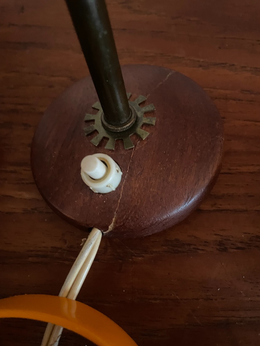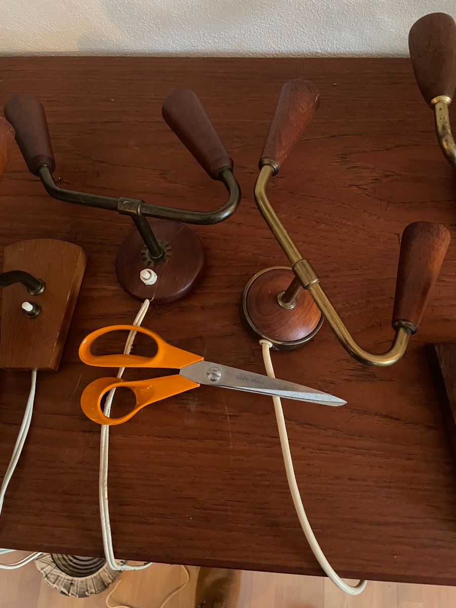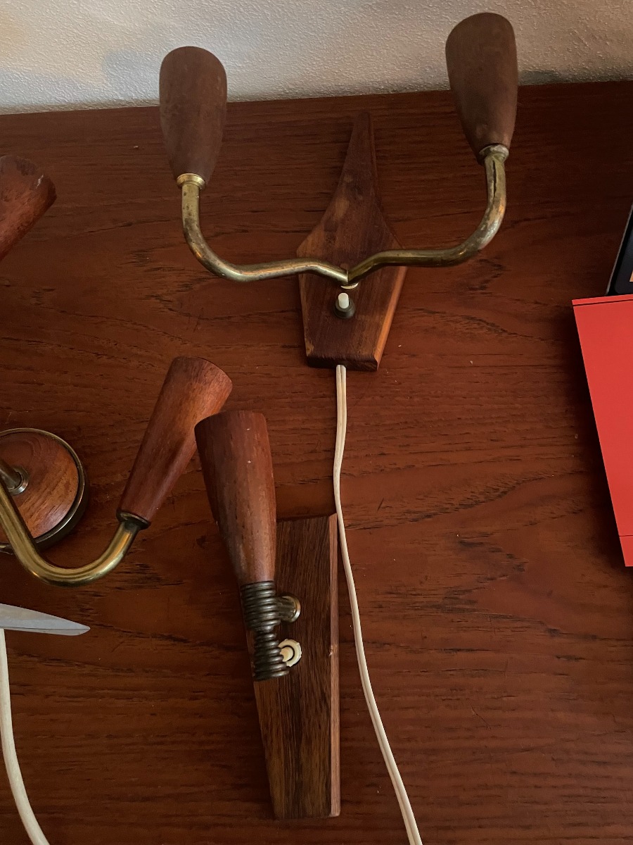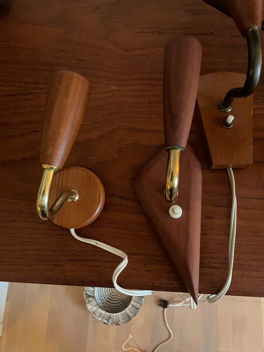 6 lampetter i teak og messing. 3 dobbelt lampetter og 3 enkelt lampetter. Forskellig grad af patia. 1 har en tørrevne. Der mangler stik på en og ledning på en anden. Lamperne er ikke efterset eller afprøvede.