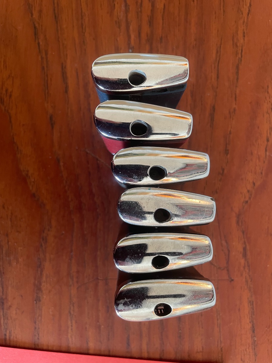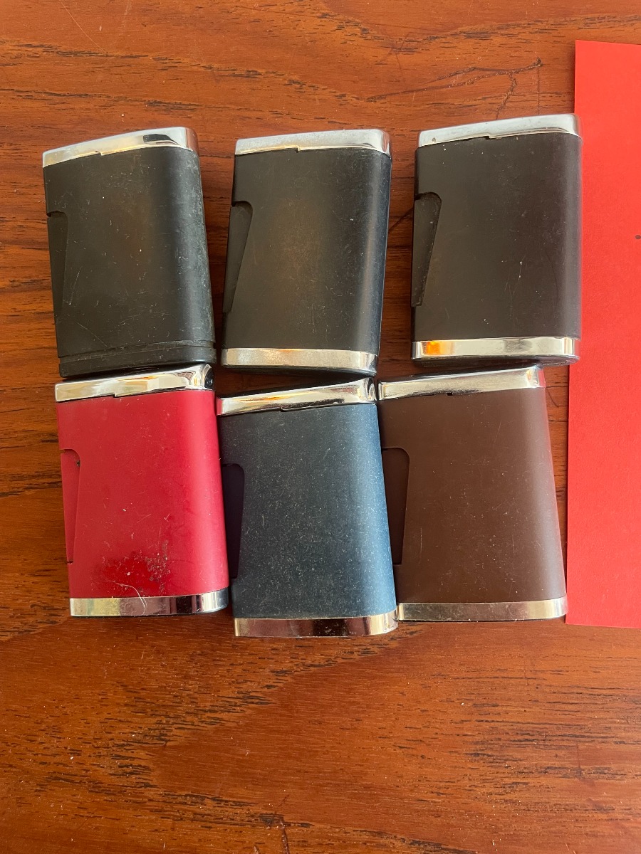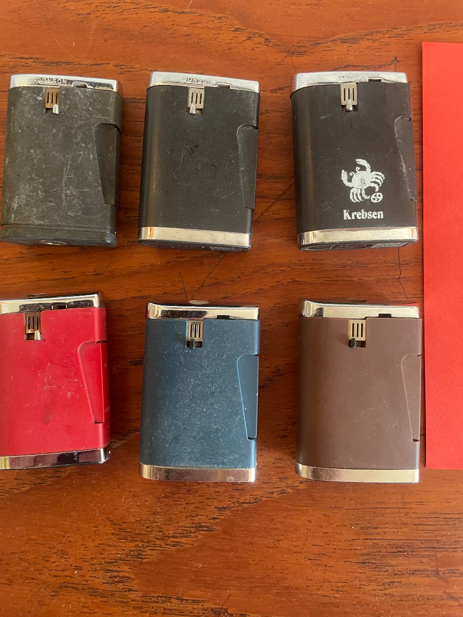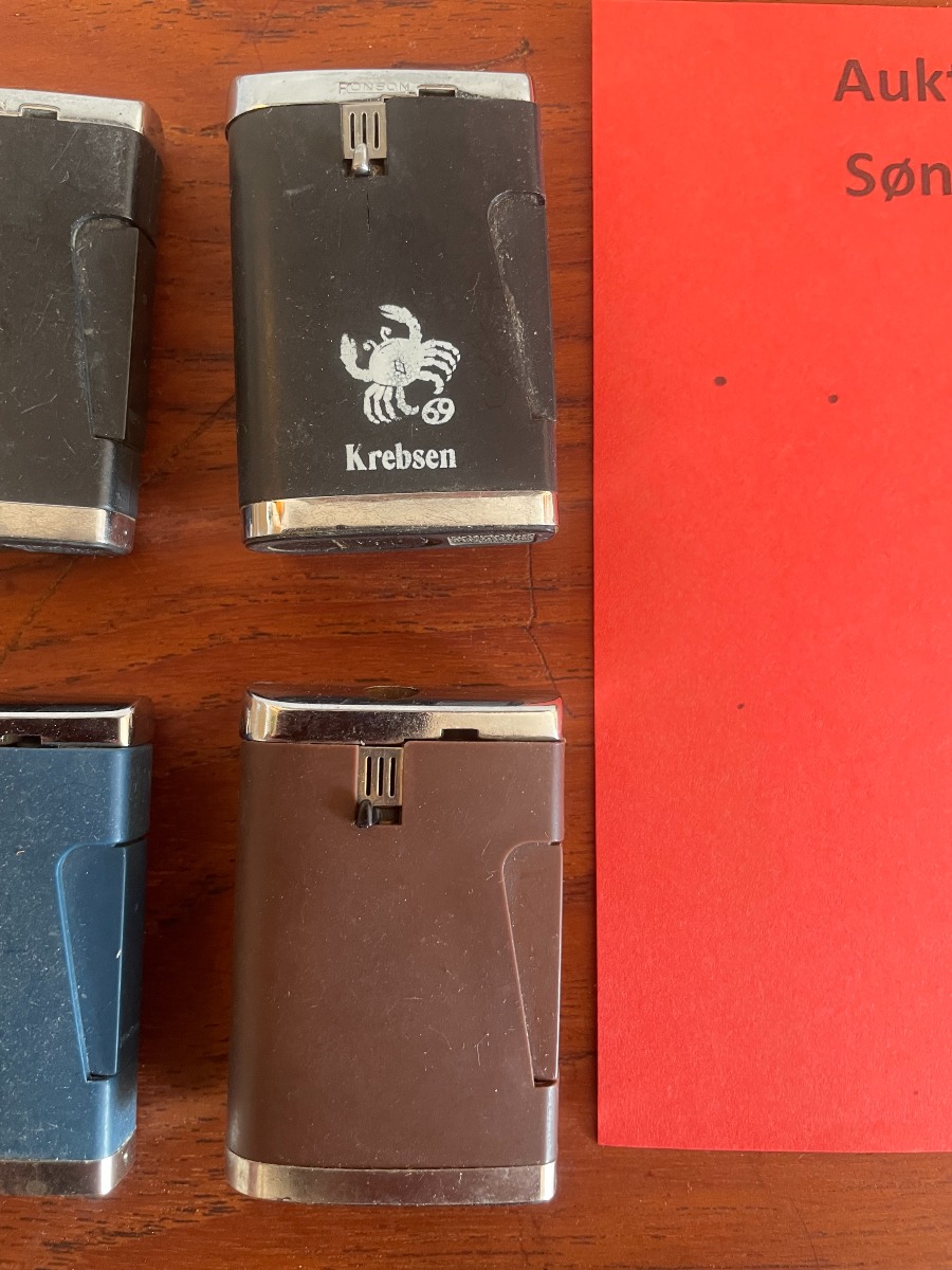 1 rød, 1 blå, 1 brun, 1 mørke brun, 1 sort, 1 sort med krebsens tegn. Diverse ridser og skrammer. Stand Ukendt.