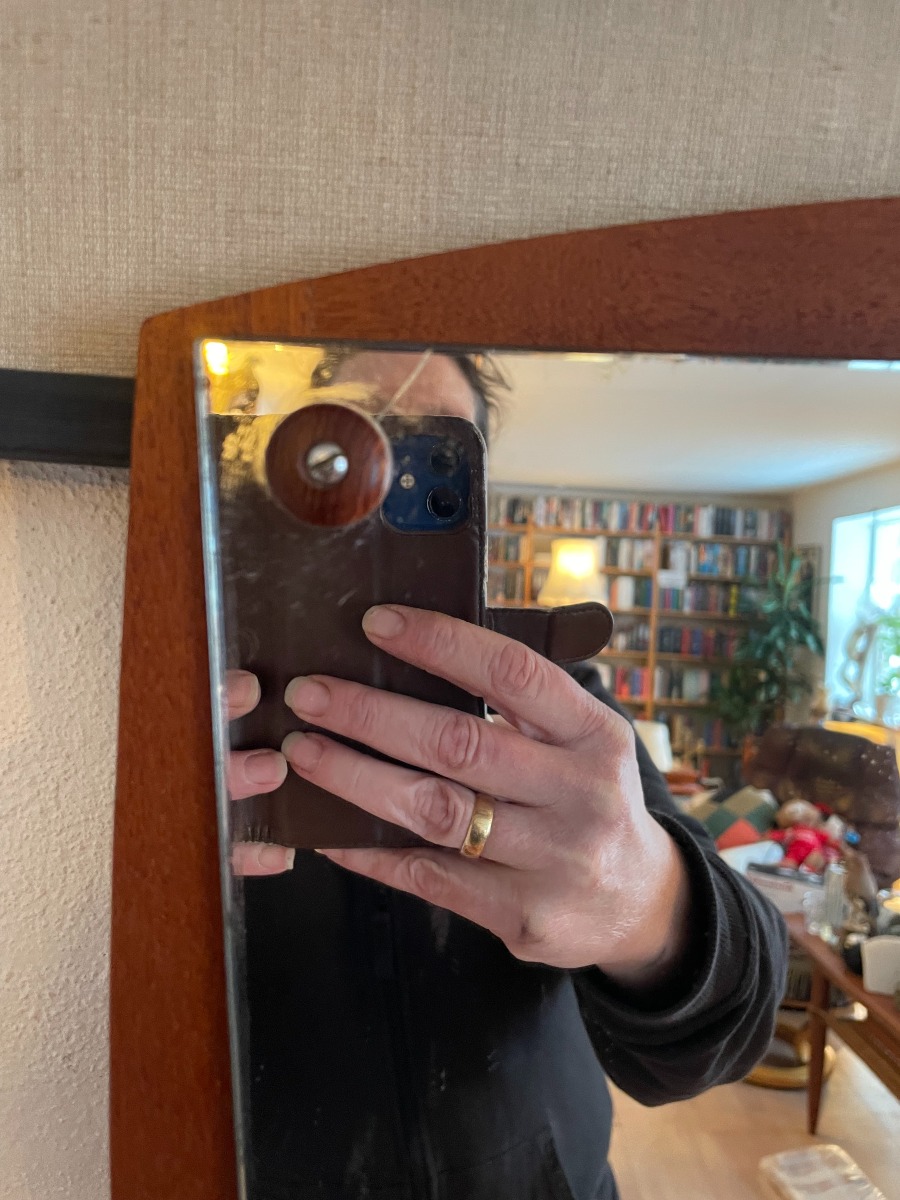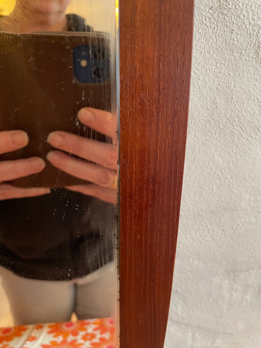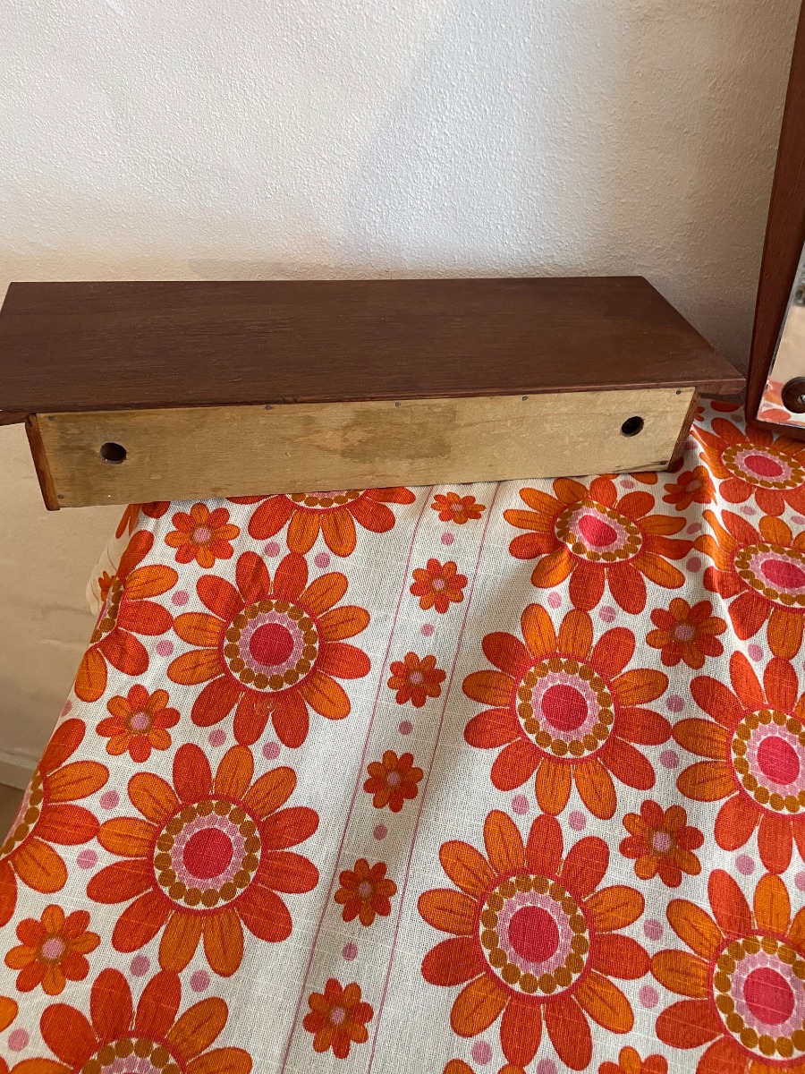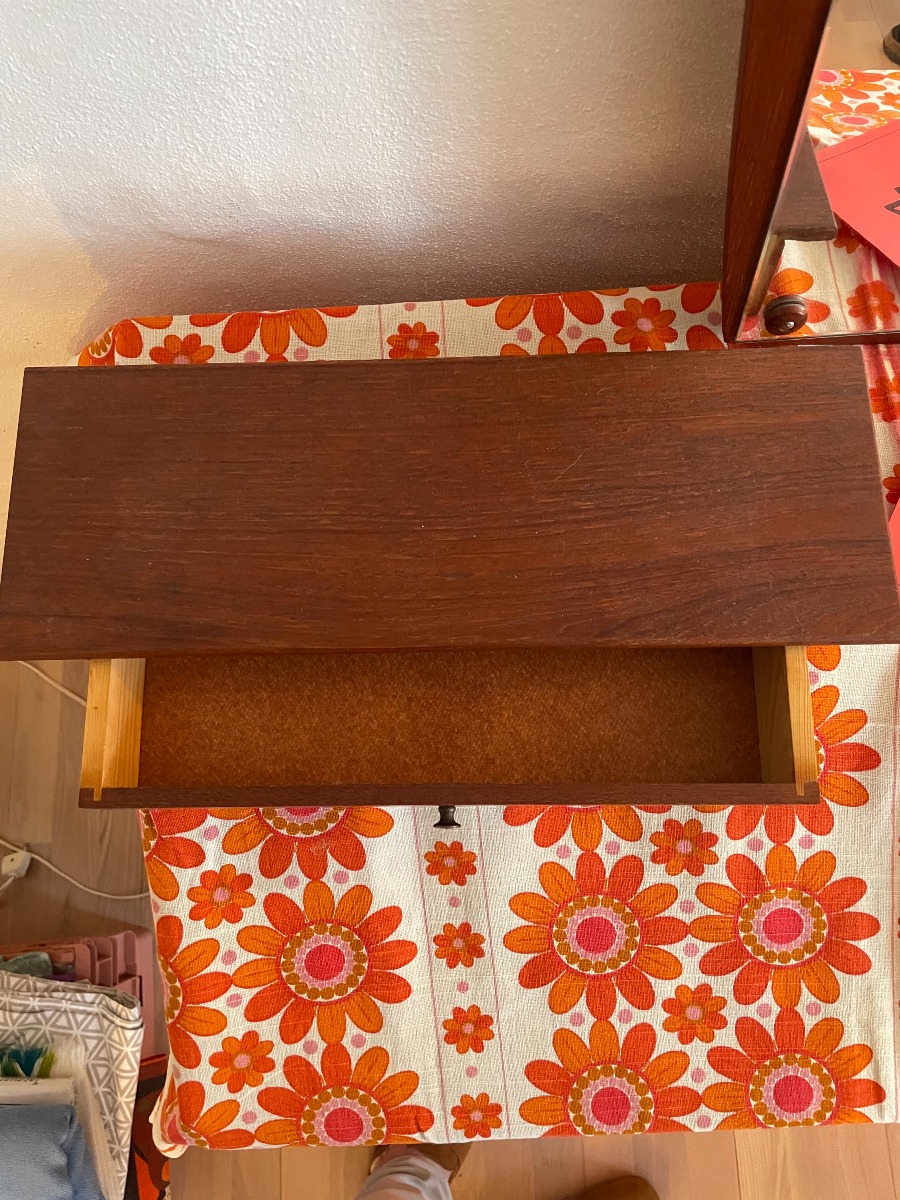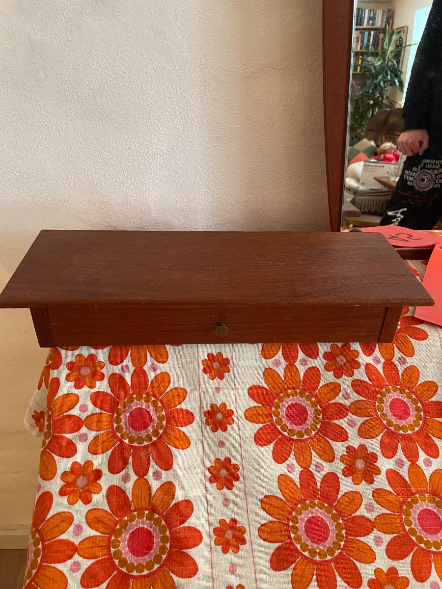 Entresæt af teak med skuffe og spejl. Spejlet har en lille revne i øverste venstre hjørne. Desuden lidt aldersrelateret slid. Skuffen er i pæn stand. Mål spejl: 67,5 x 39 cm. Mål Skuffe: 40 x 14 x 6 cm.
