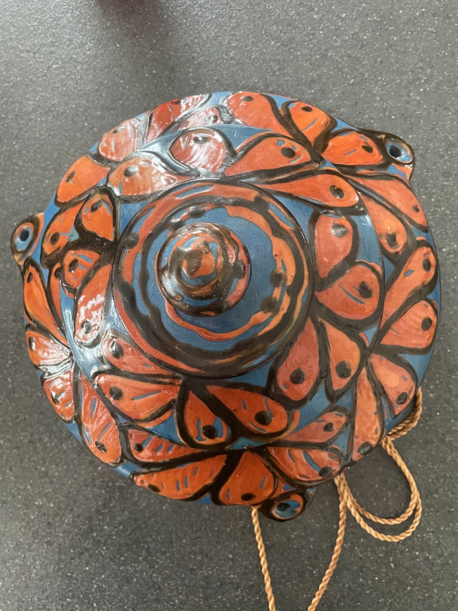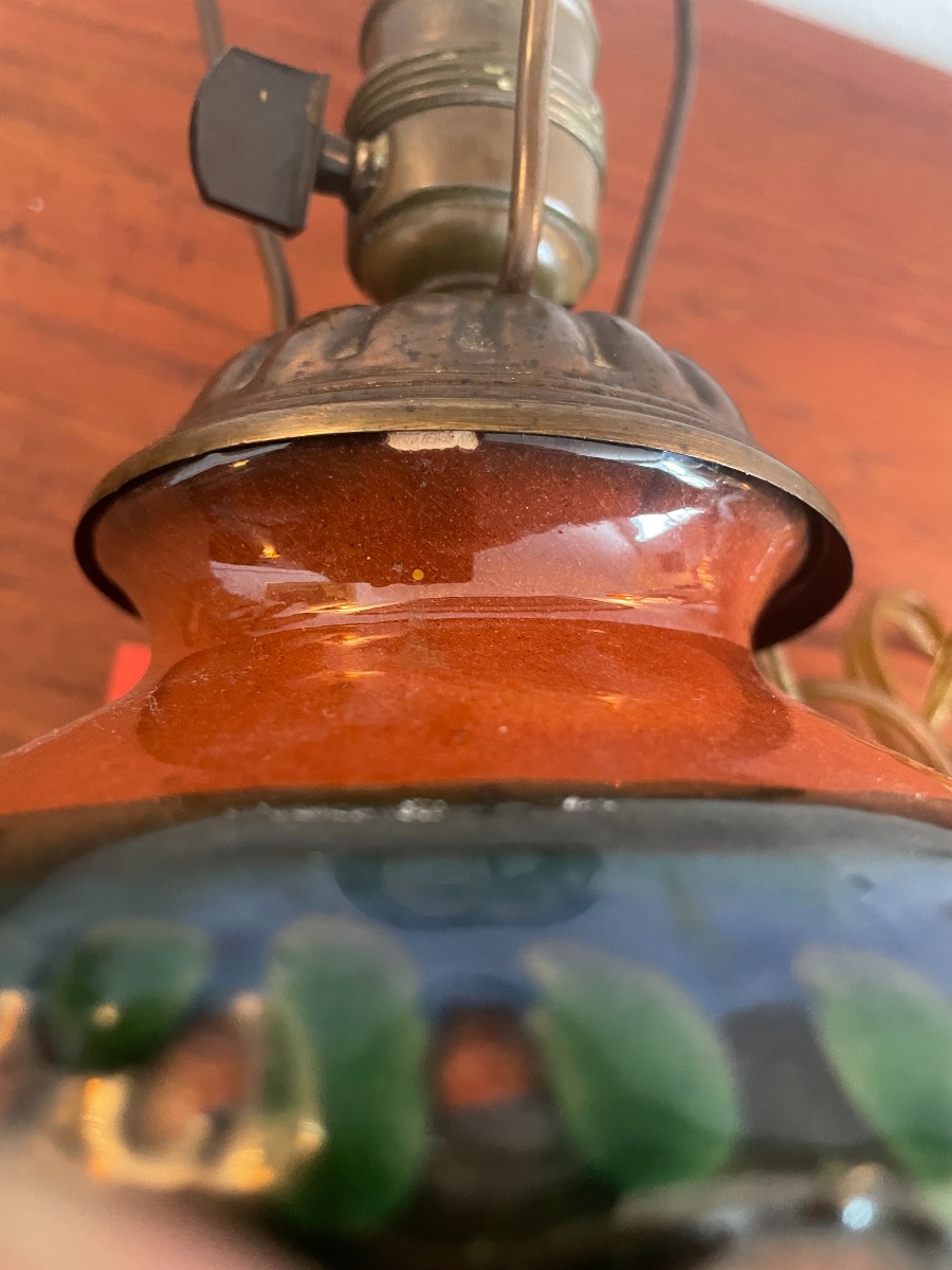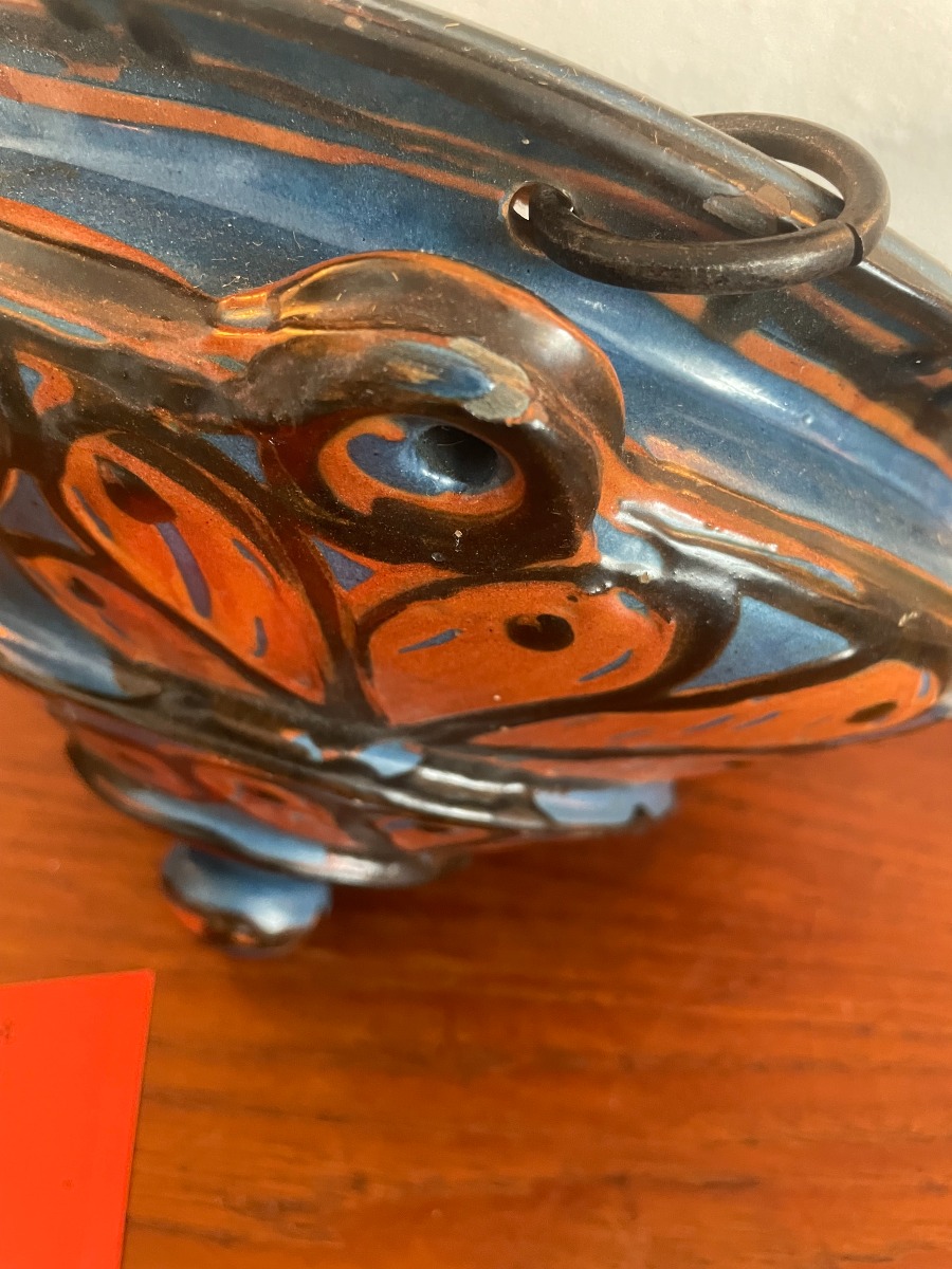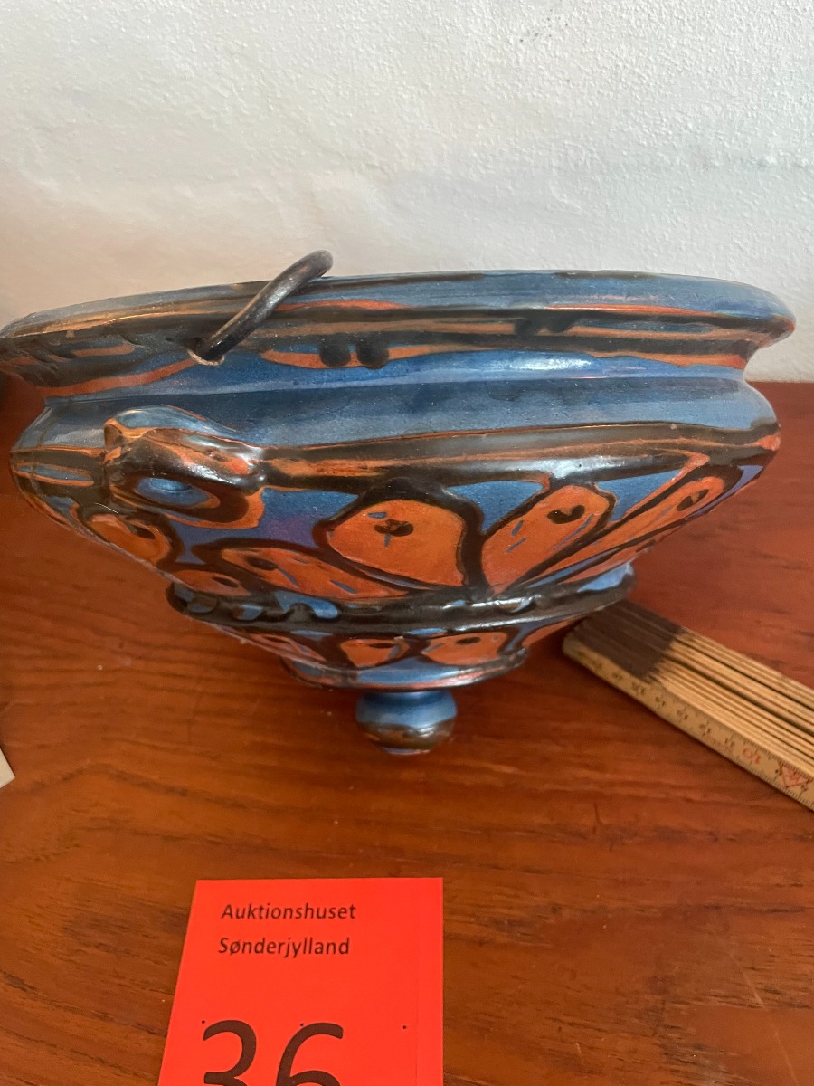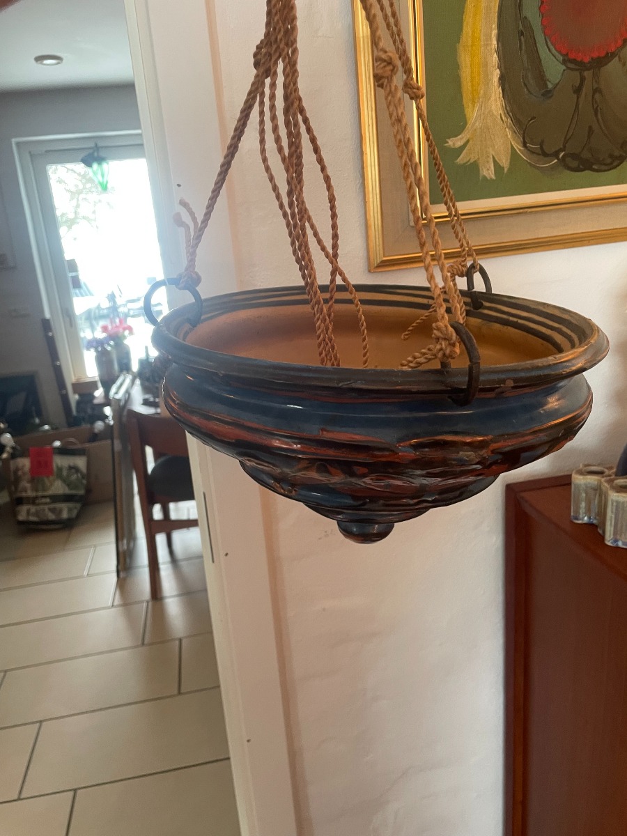 Herman Kähler ampel. Har lidt brugsspor, og lidt glasur afslag, men fremstår efter alderen i ret god stand. Højde 17cm Ø ca 30cm.