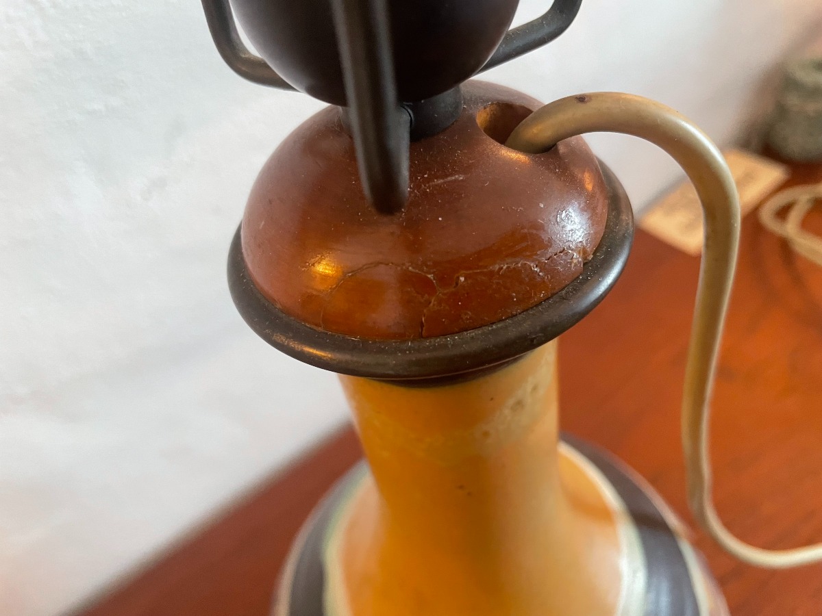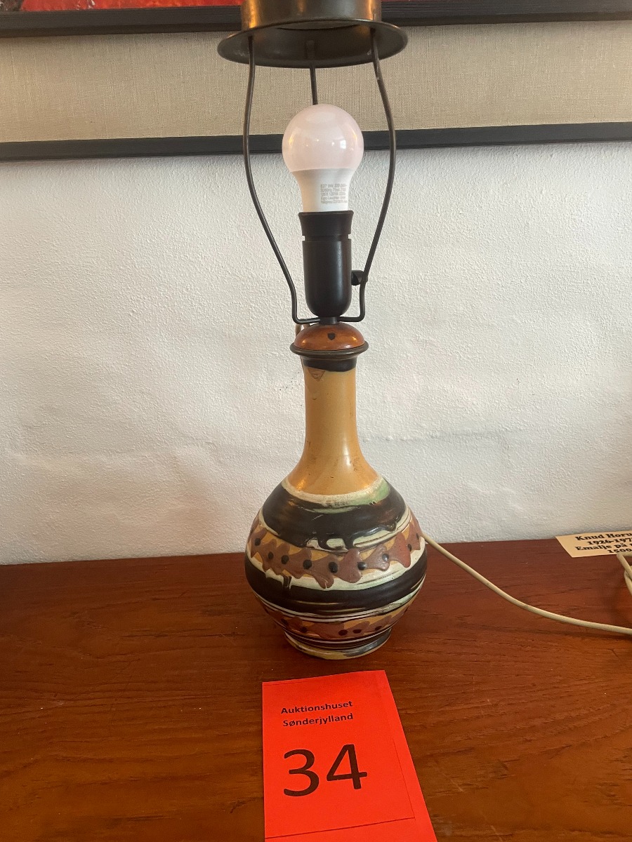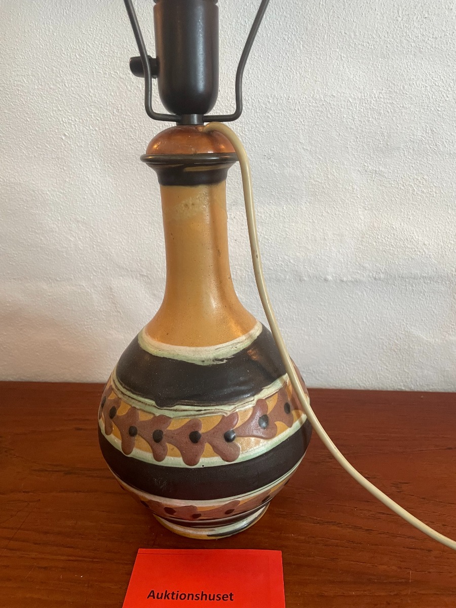 Herman Kähler. Bordlampe af keramik. Sign. med monogram under fod. Reperation ved sokkelfod. Glasur fejl. Højde inkl fatning 36 cm. Højde uden fatning ca 27,5 cm.
