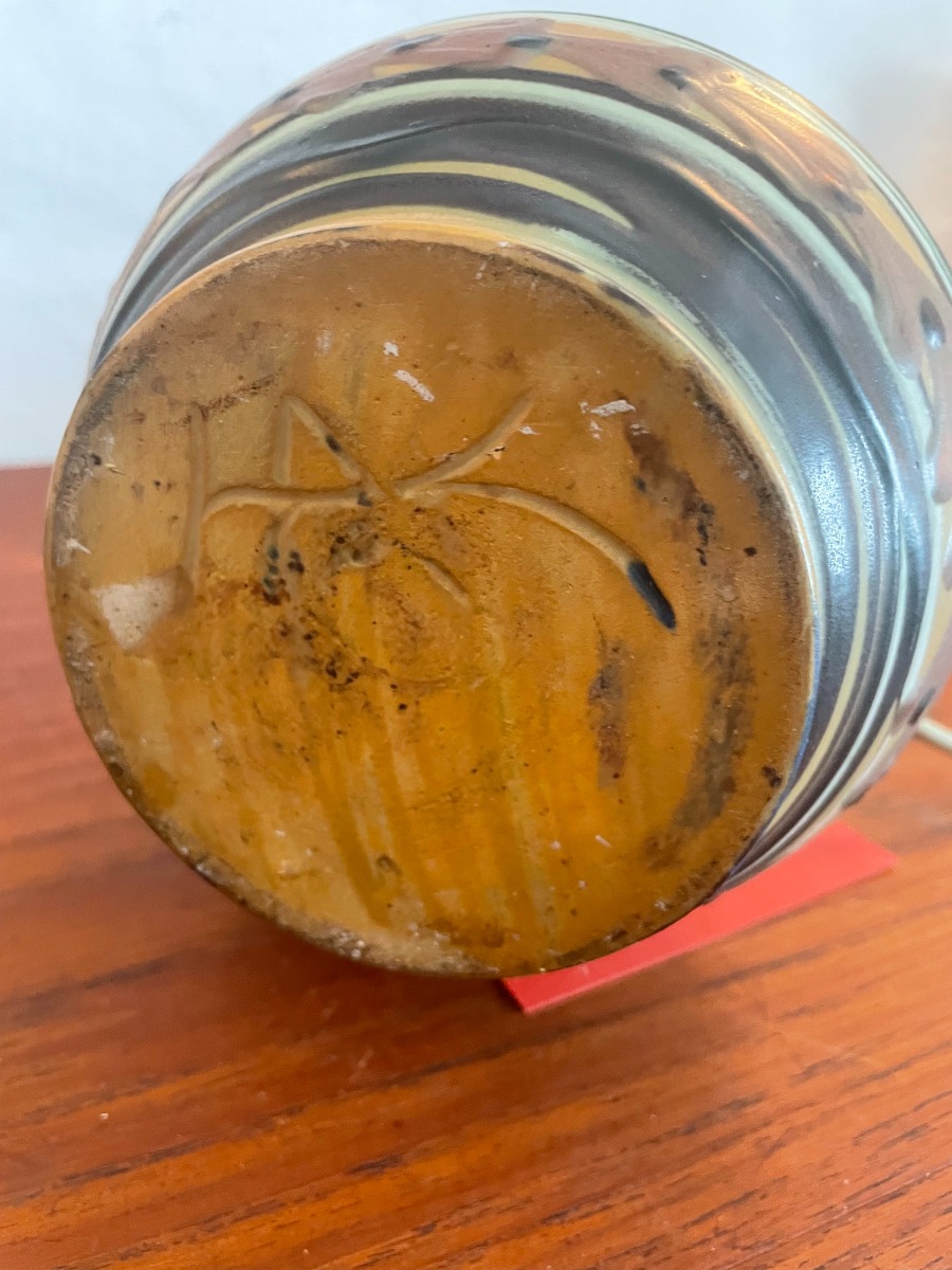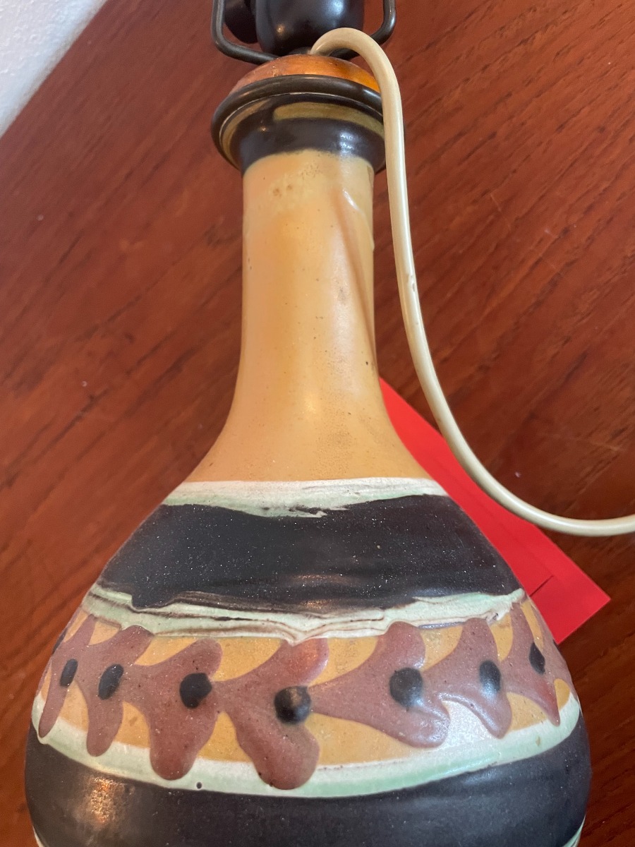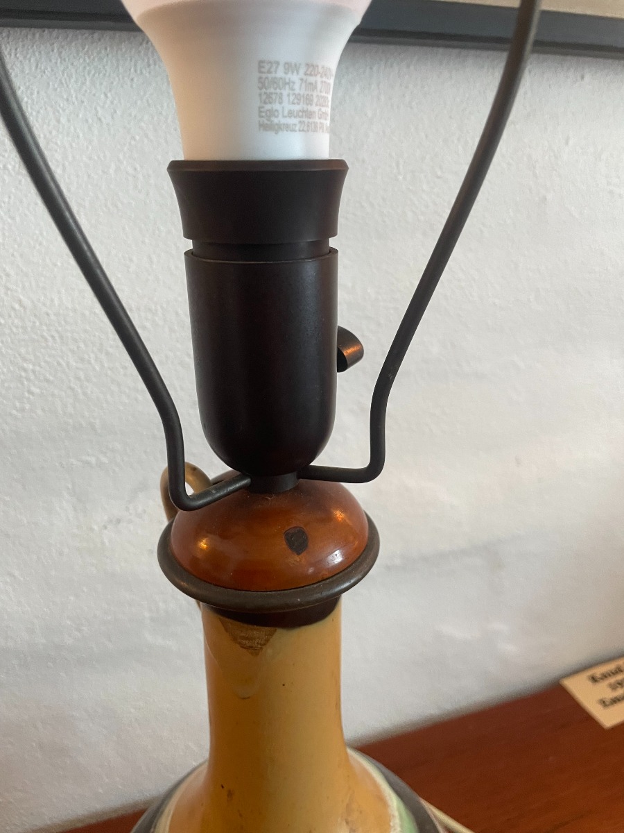 Herman Kähler. Bordlampe af keramik. Sign. med monogram under fod. Reperation ved sokkelfod. Glasur fejl. Højde inkl fatning 36 cm. Højde uden fatning ca 27,5 cm.