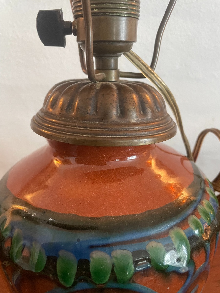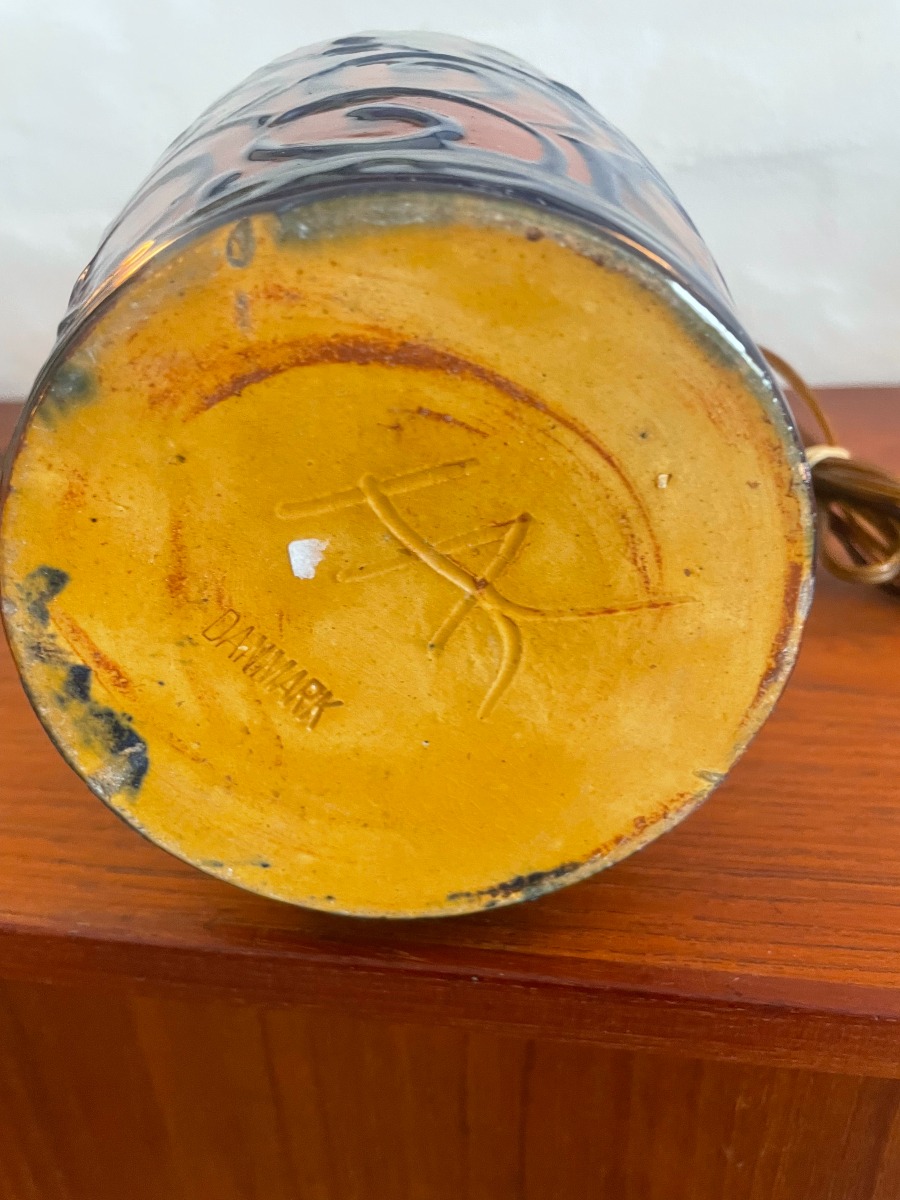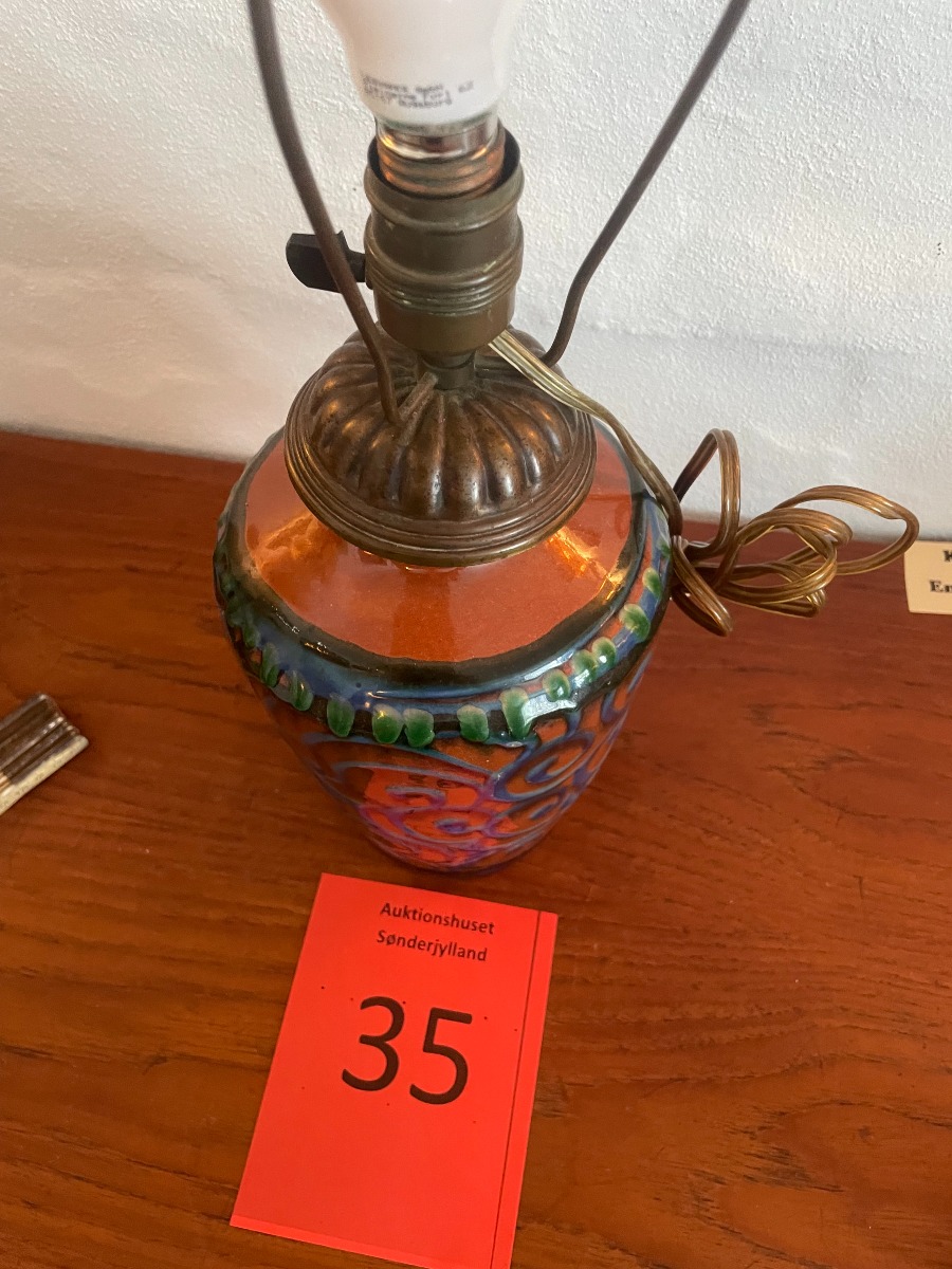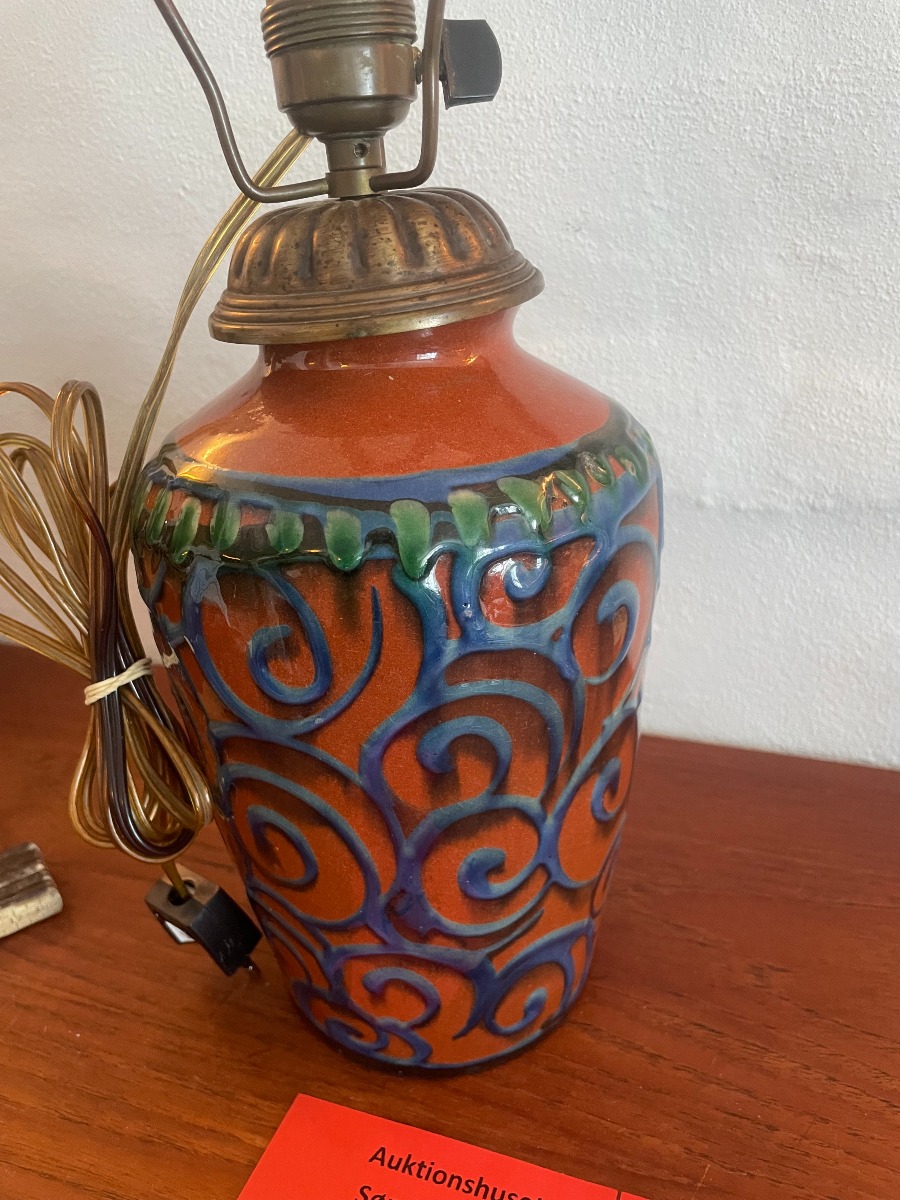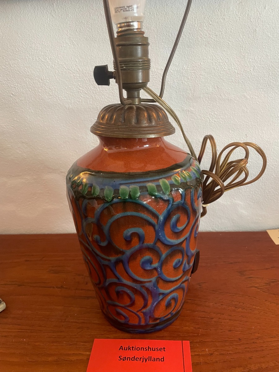 Herman Kähler bordlampe. Lille afslag under fatningsdelen. Få aldersrelaterede brugsspor. Fatning i messing. Højde med fatning: ca 33 cm. Højde uden fatning:ca 24 cm.