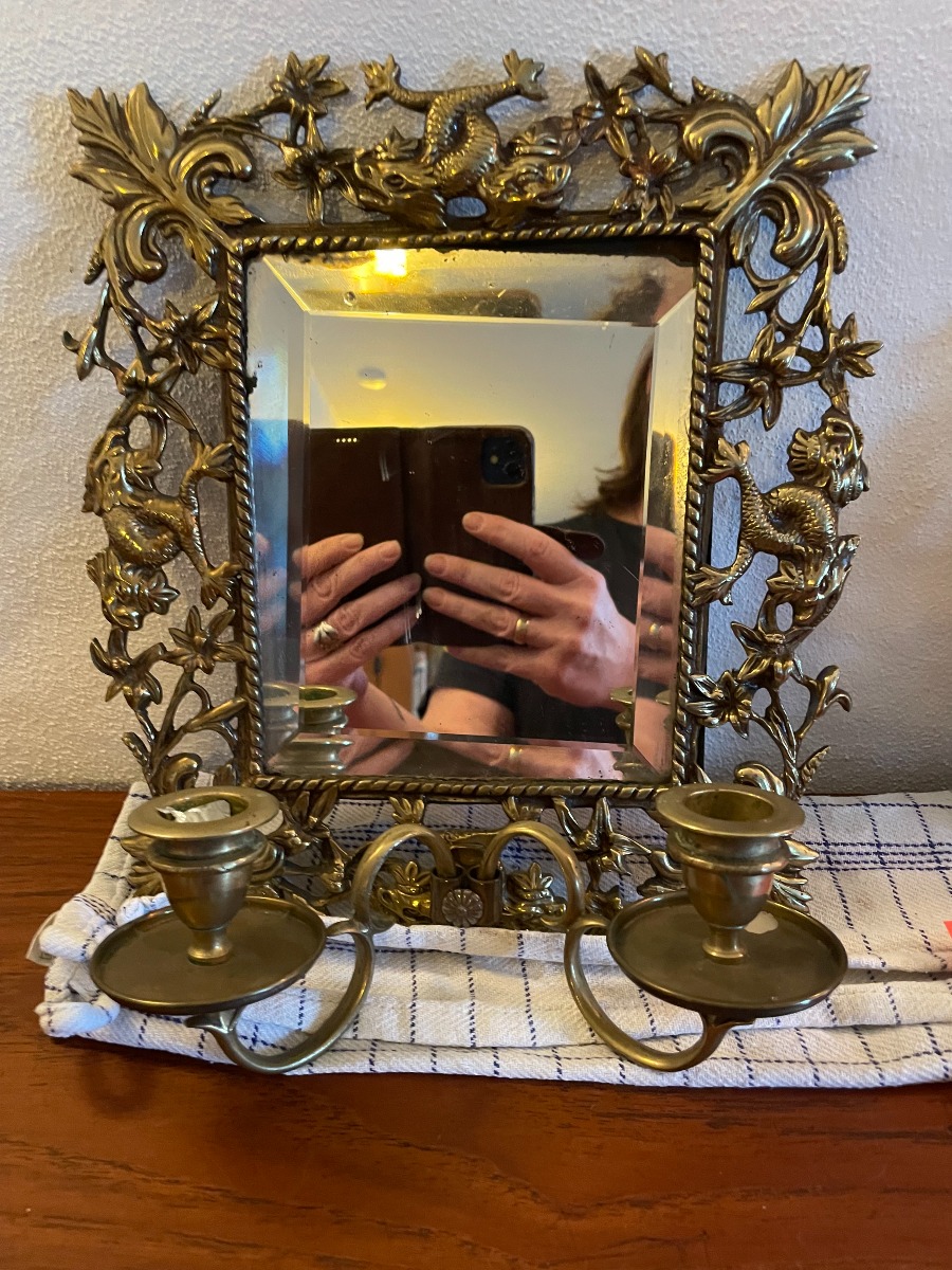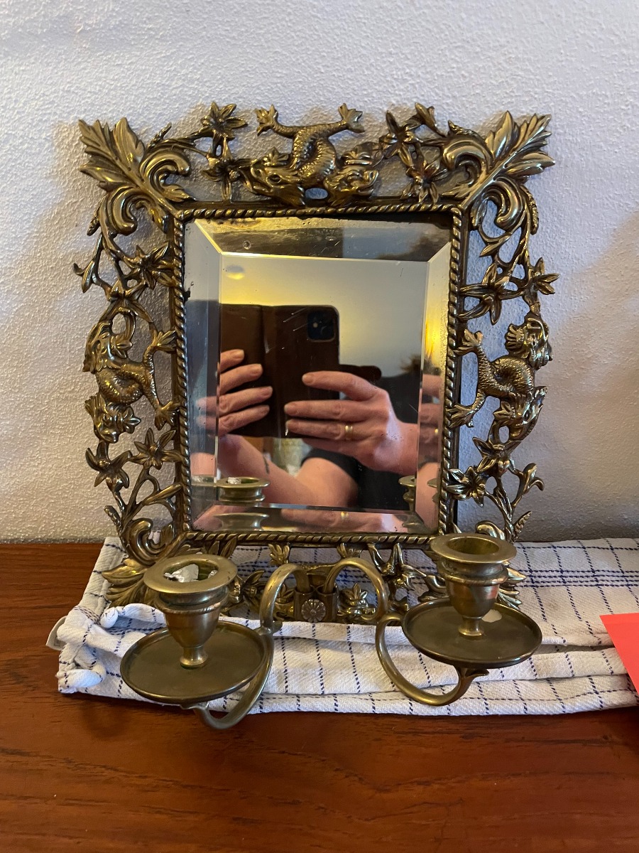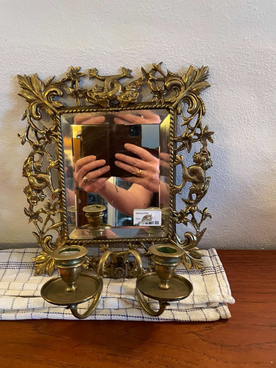 Par spejllampetter af messing med 2 lysarme. Støbt med bl.a. drager. H: 26 H: 29cm. Fremstår i pæn stand, med patina og spor svarende til alderen.