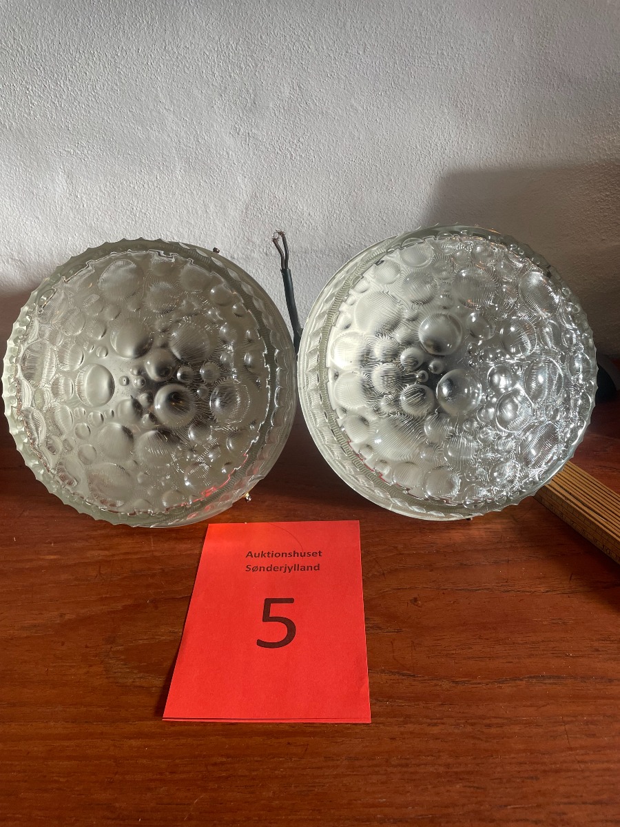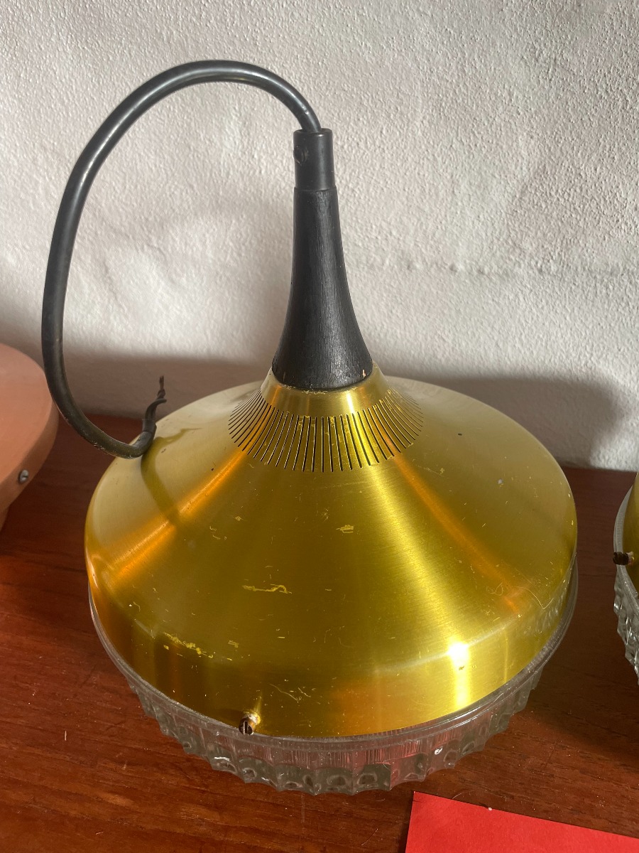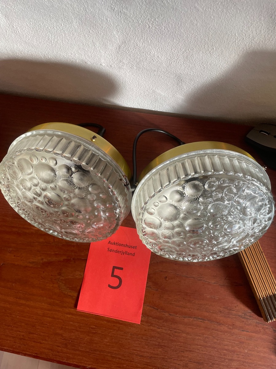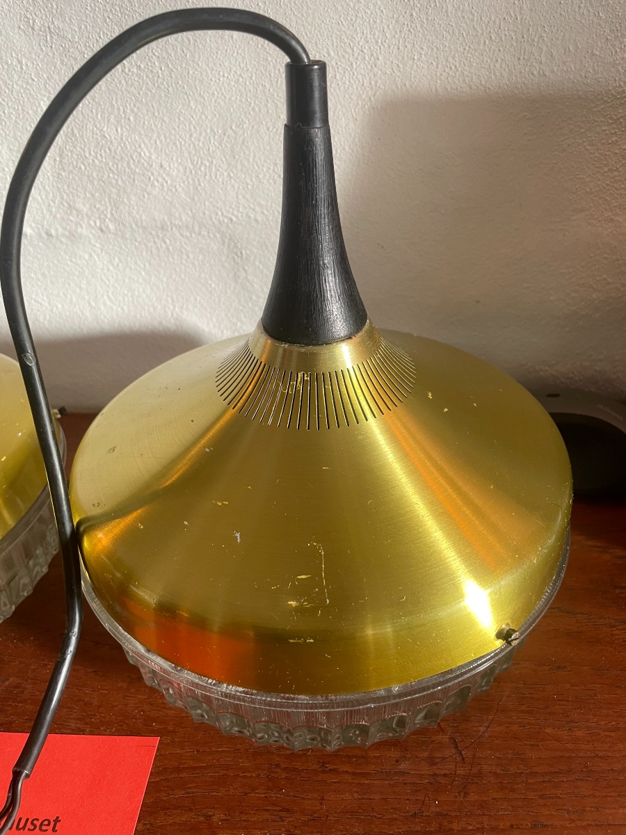 Diverse småridser på messing. Malingsafslag på træ. Afslag på glas, på den ene oppe ved sammenskruningen. Ø ca 20cm.