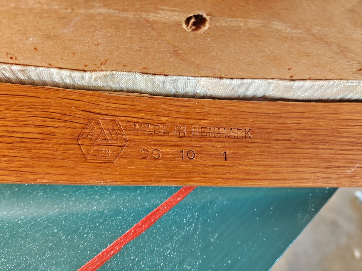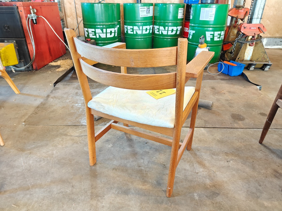 FDB Møbler armstol af eg. sæde med senere monteret lyst stof. Stemplet og dateret på stel.