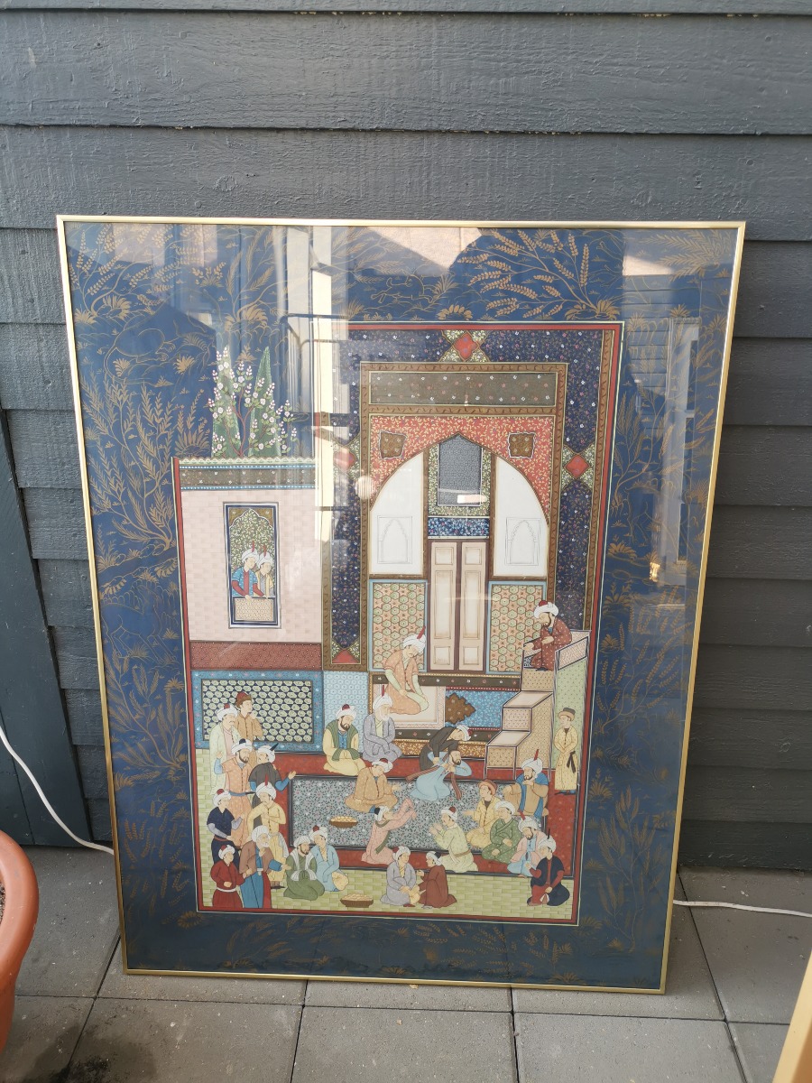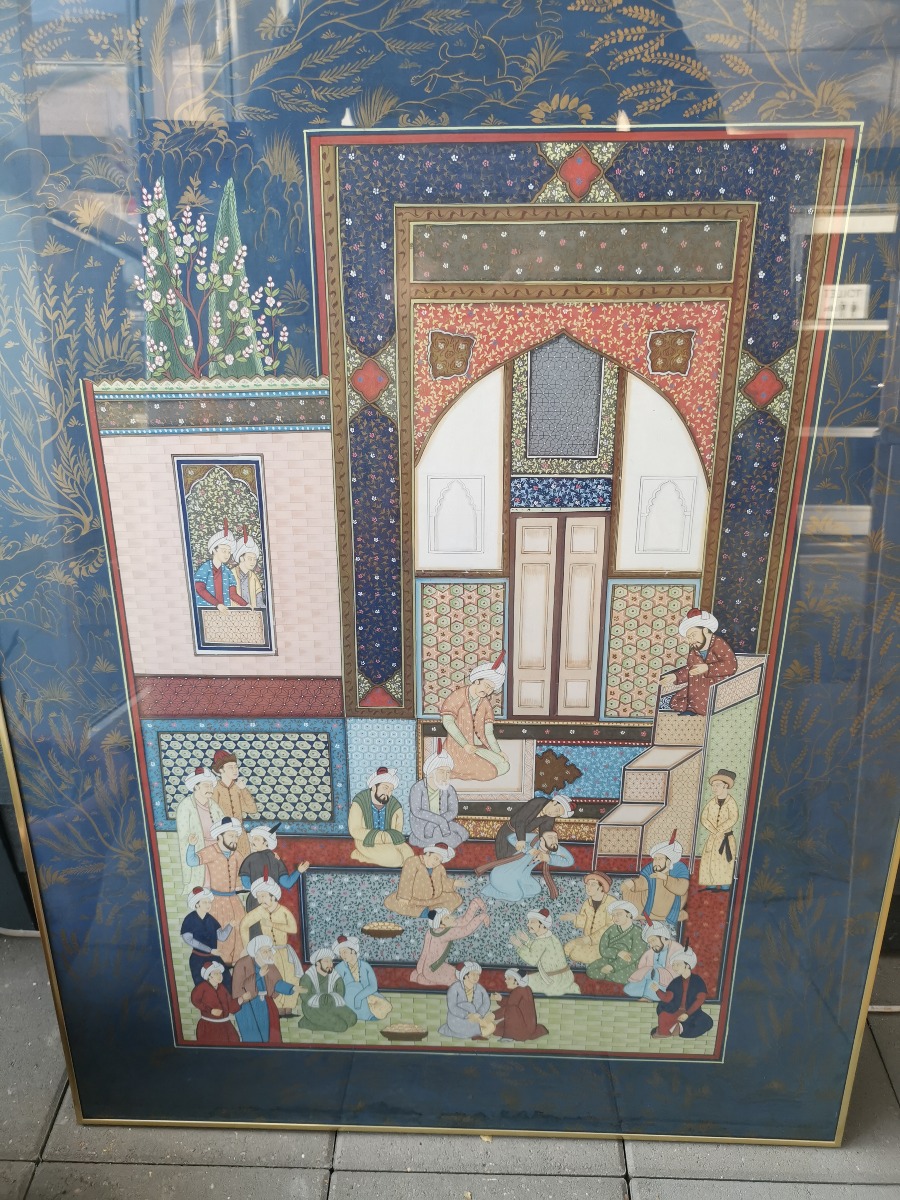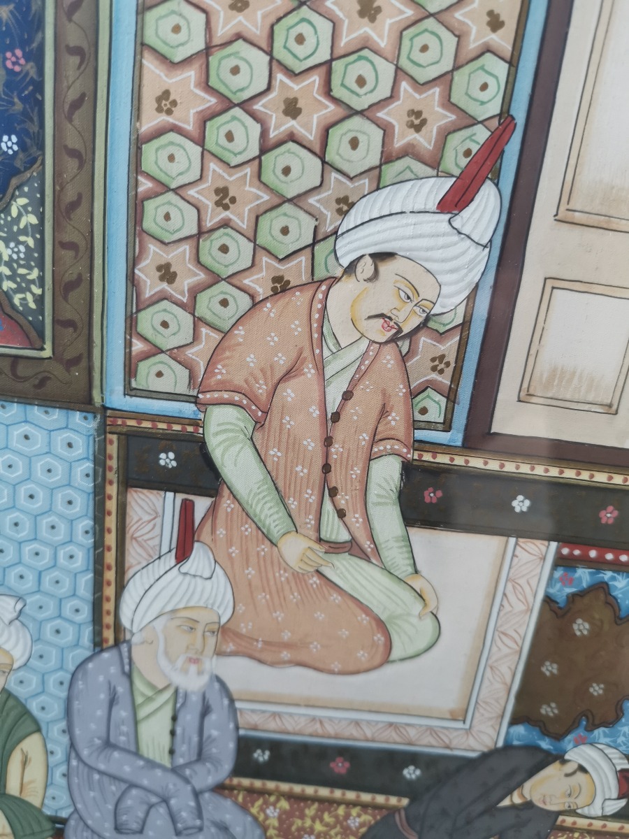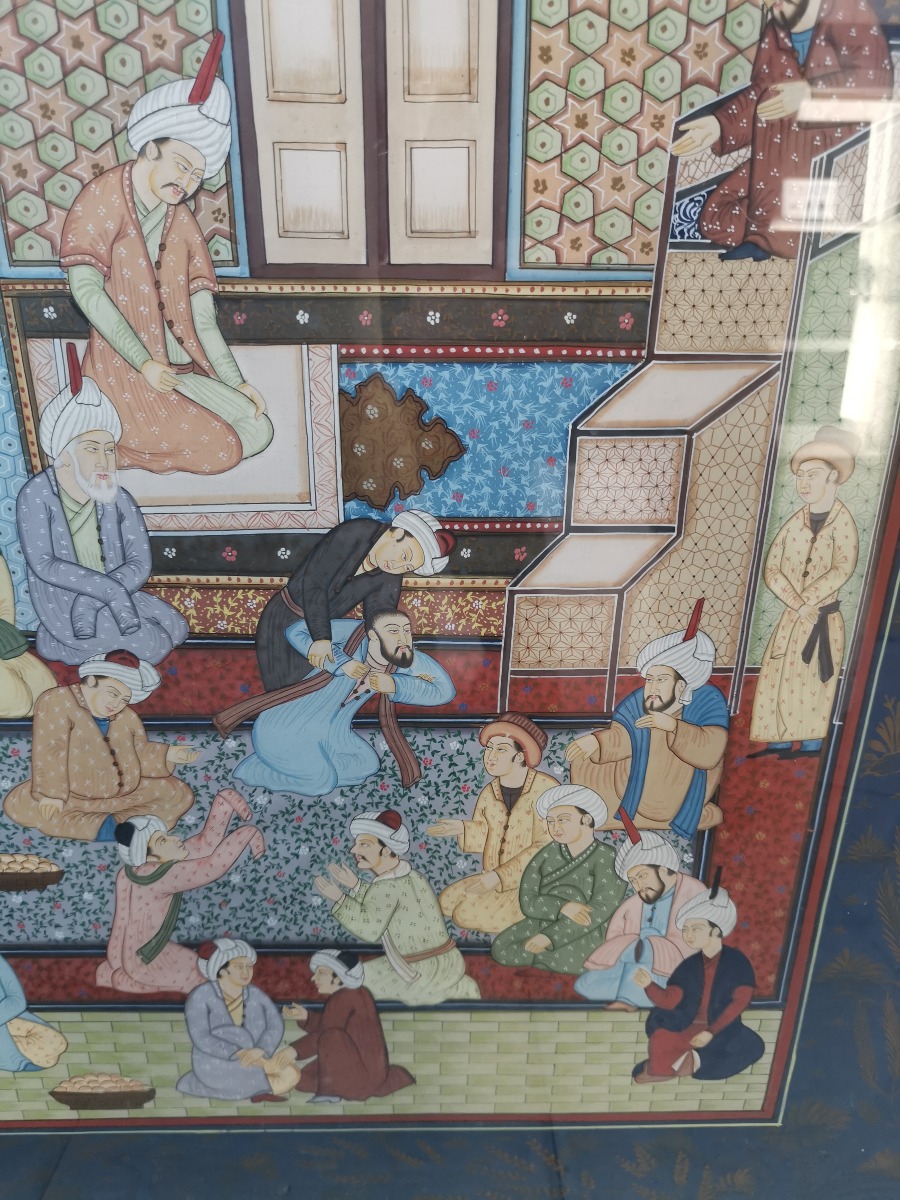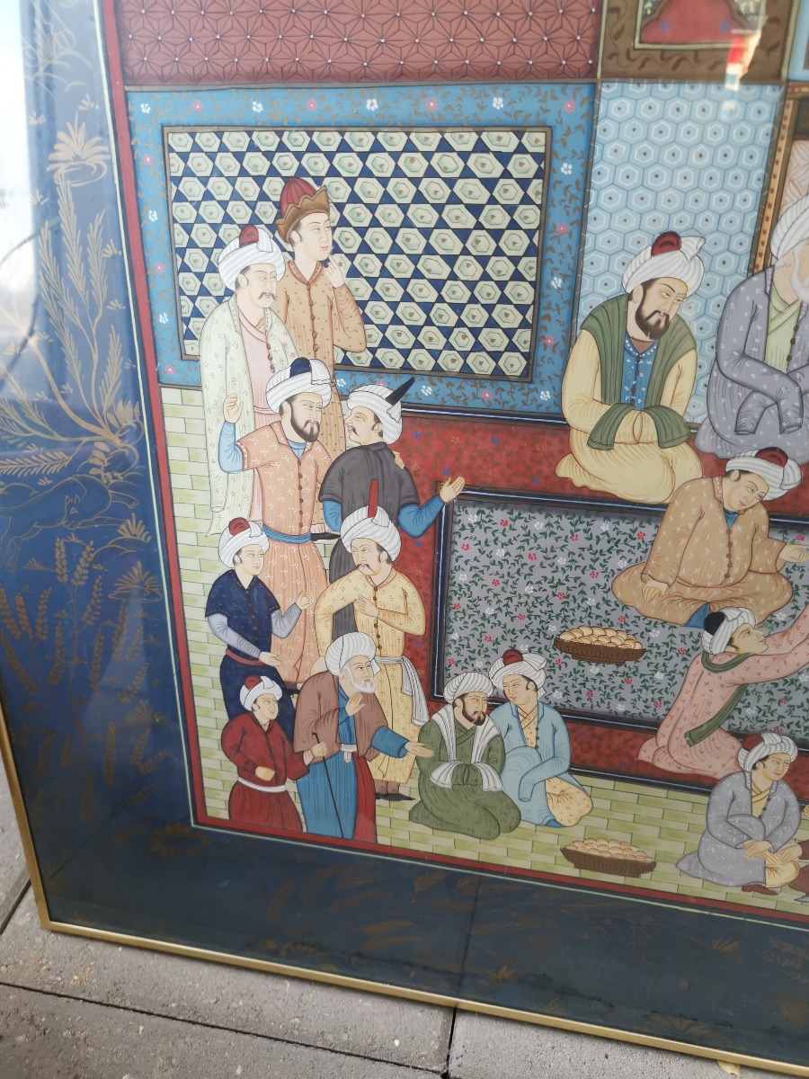 Orientalsk motiv på silke, opspændt på plade. Rigt detaljeret. 105 x 78 cm.