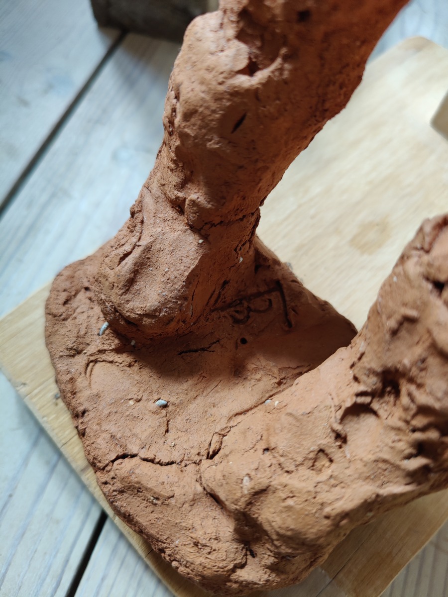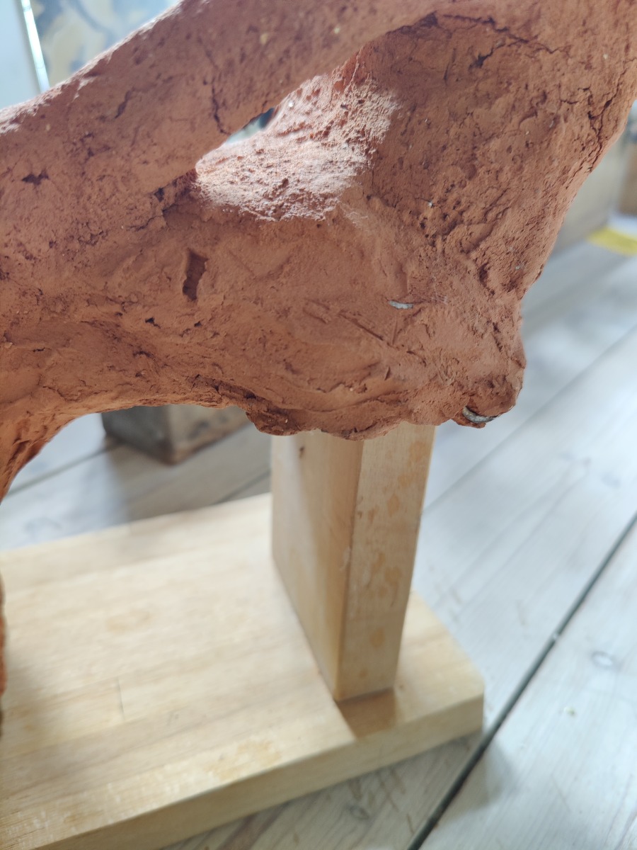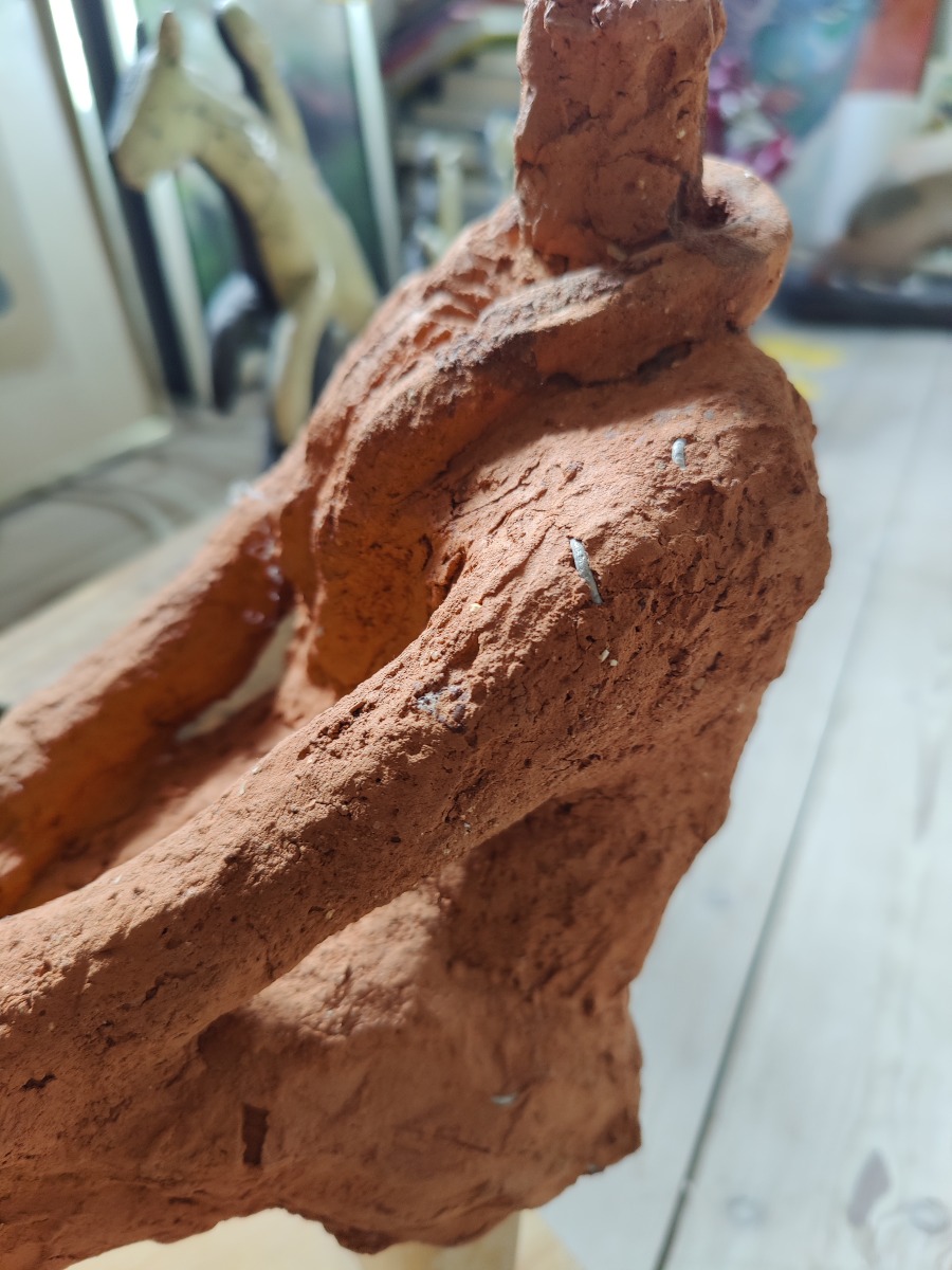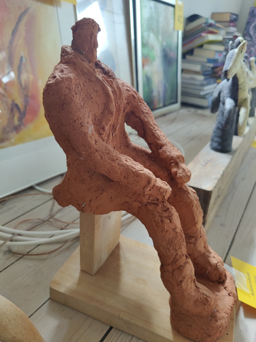 Ubk. kunstner. Siddende mand. Modelleret på metalskelet. Sokkel af træ. 40 x 28 x 16 cm. Umiddelbart ikke signeret.