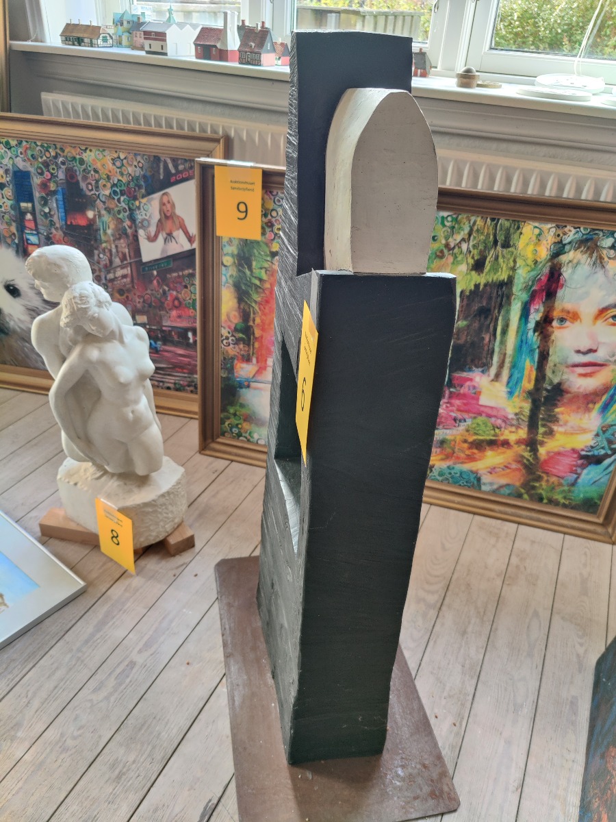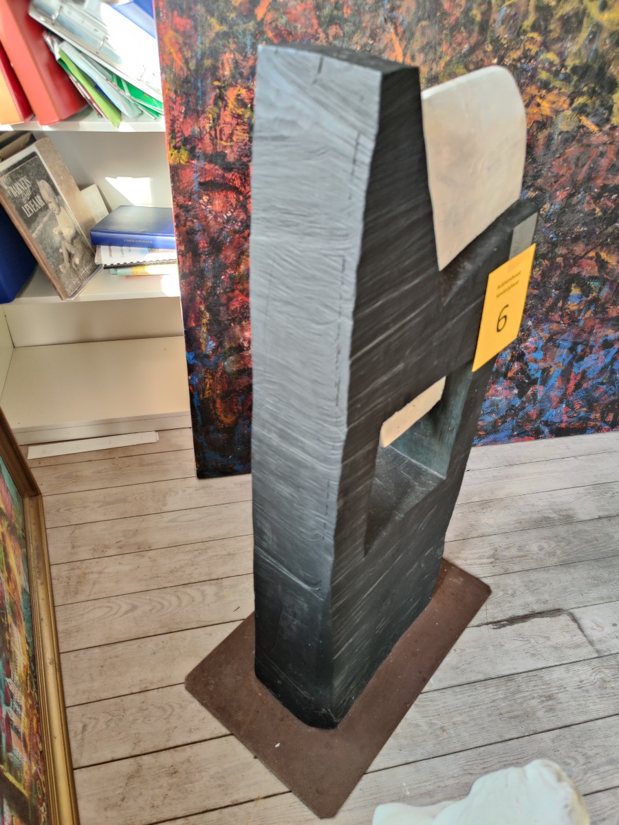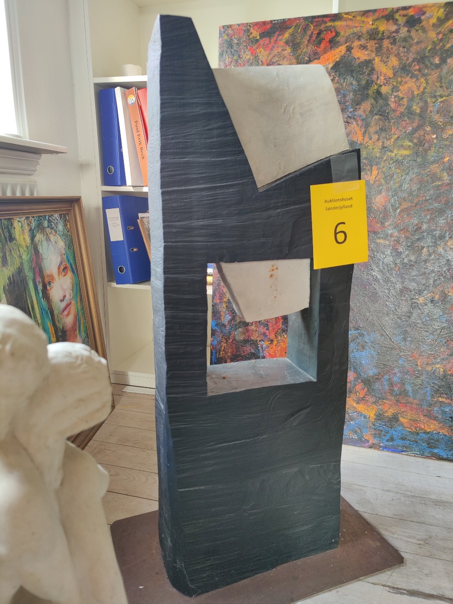Ubk. kunstner skulptur af træ, bemalet i sort og hvid. Monteret på jernplade. 100x40x14 cm.