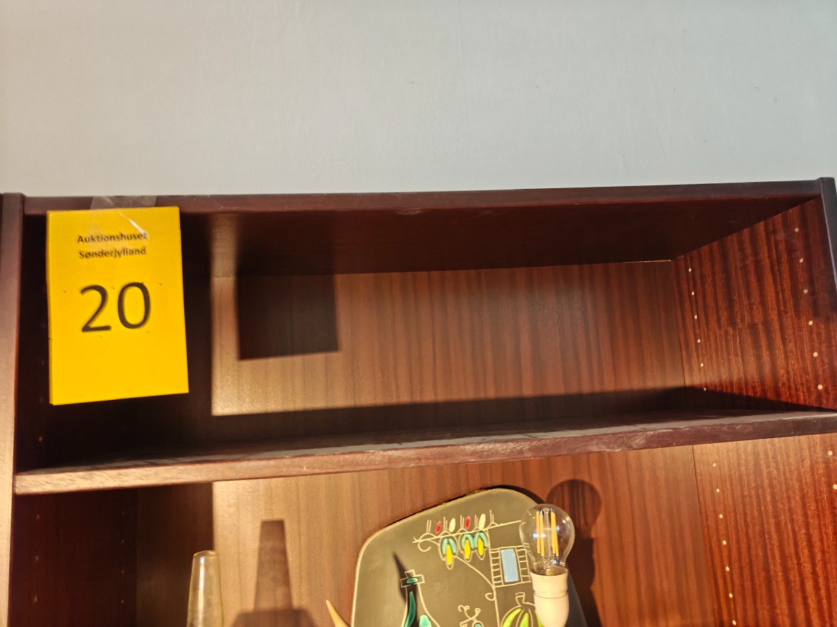 3 reolsektioner, mahognifineret. 5 regulerbare hylder. 210 x 75 x 30 cm.