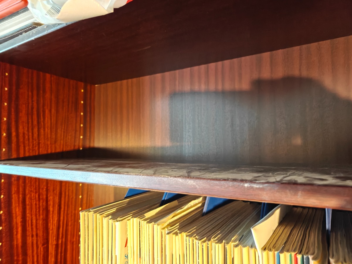 2 reolsektioner, mahognifineret. 5 regulerbare hylder. 210 x 75 x 30 cm.