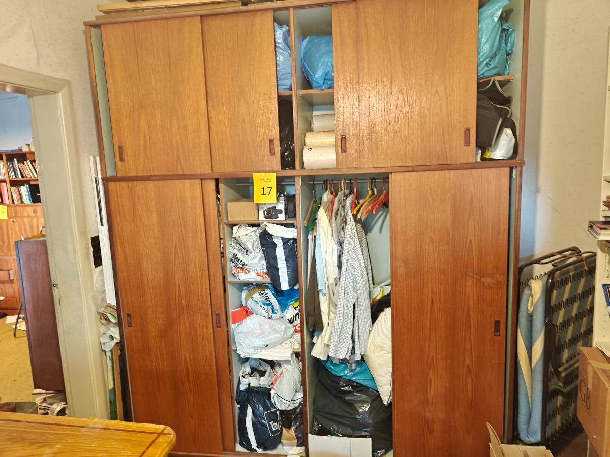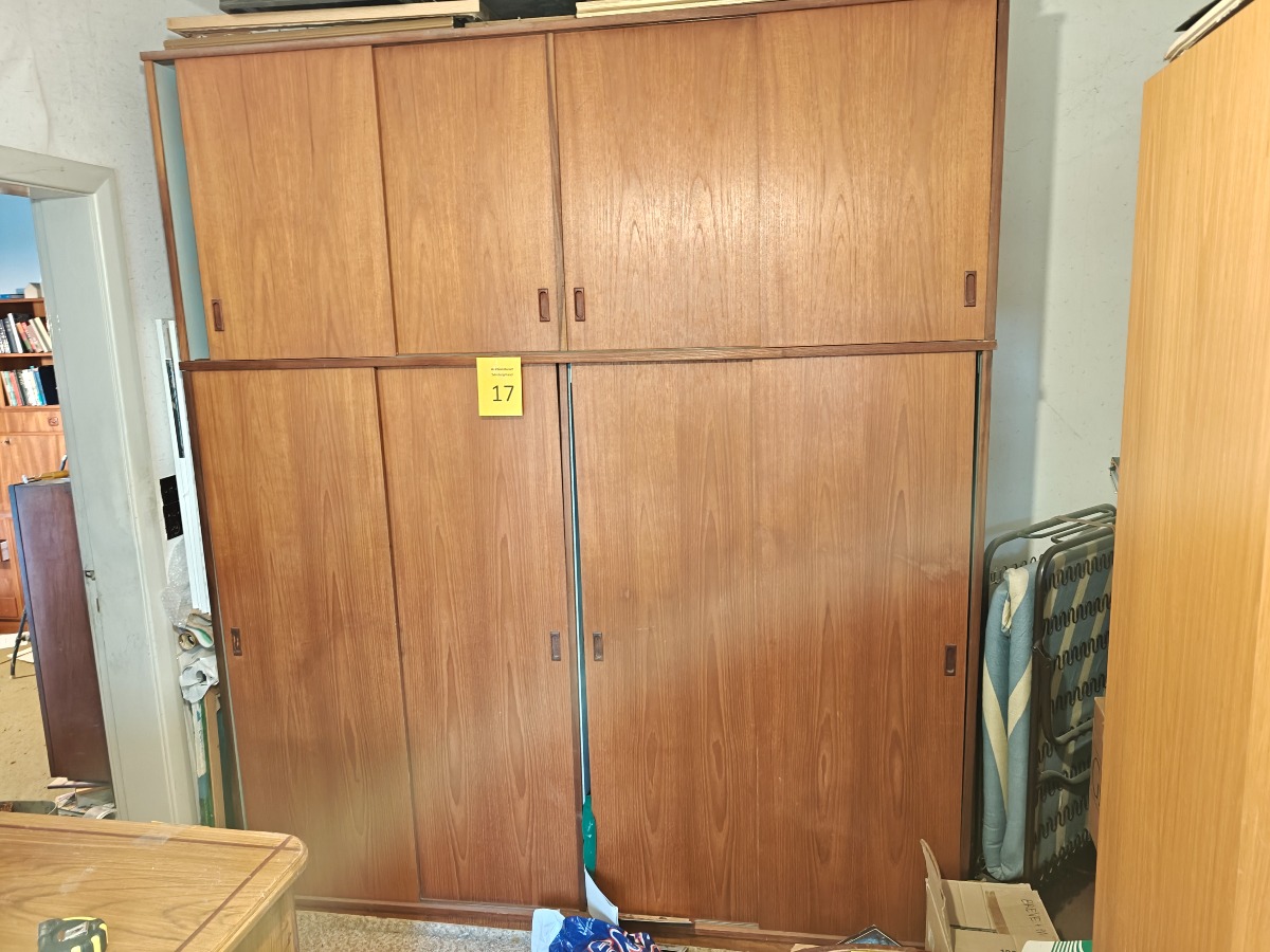 4-fløjet klædeskab af fineret teak. Front med skydelåger. 230 x 200 x 60 cm.