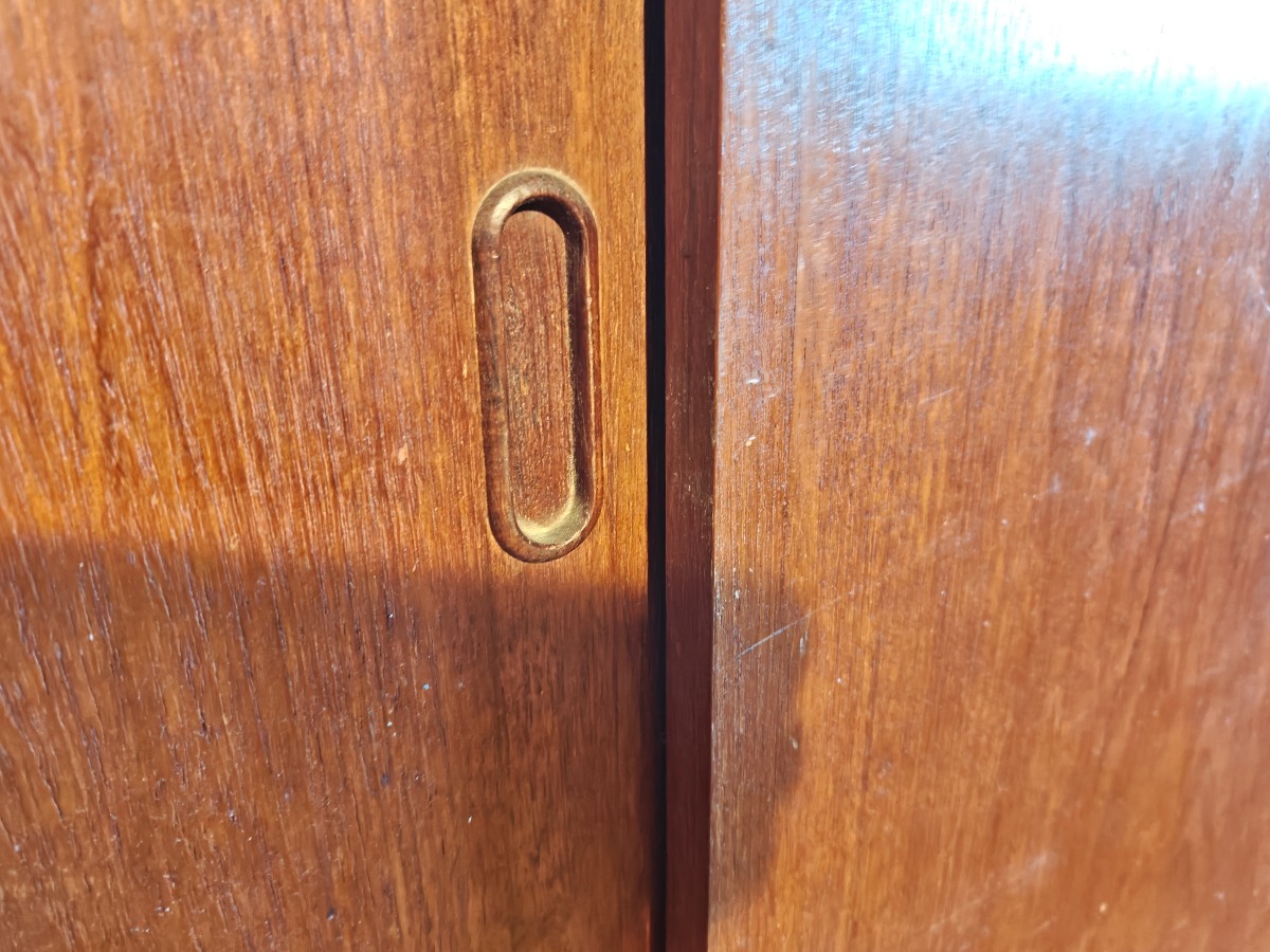 Høj skænk af teak med 3 skydelåger i front med indlagte greb. H. 125, B. 150, D. 45 cm. Fremstår med almindelige brugsspor.