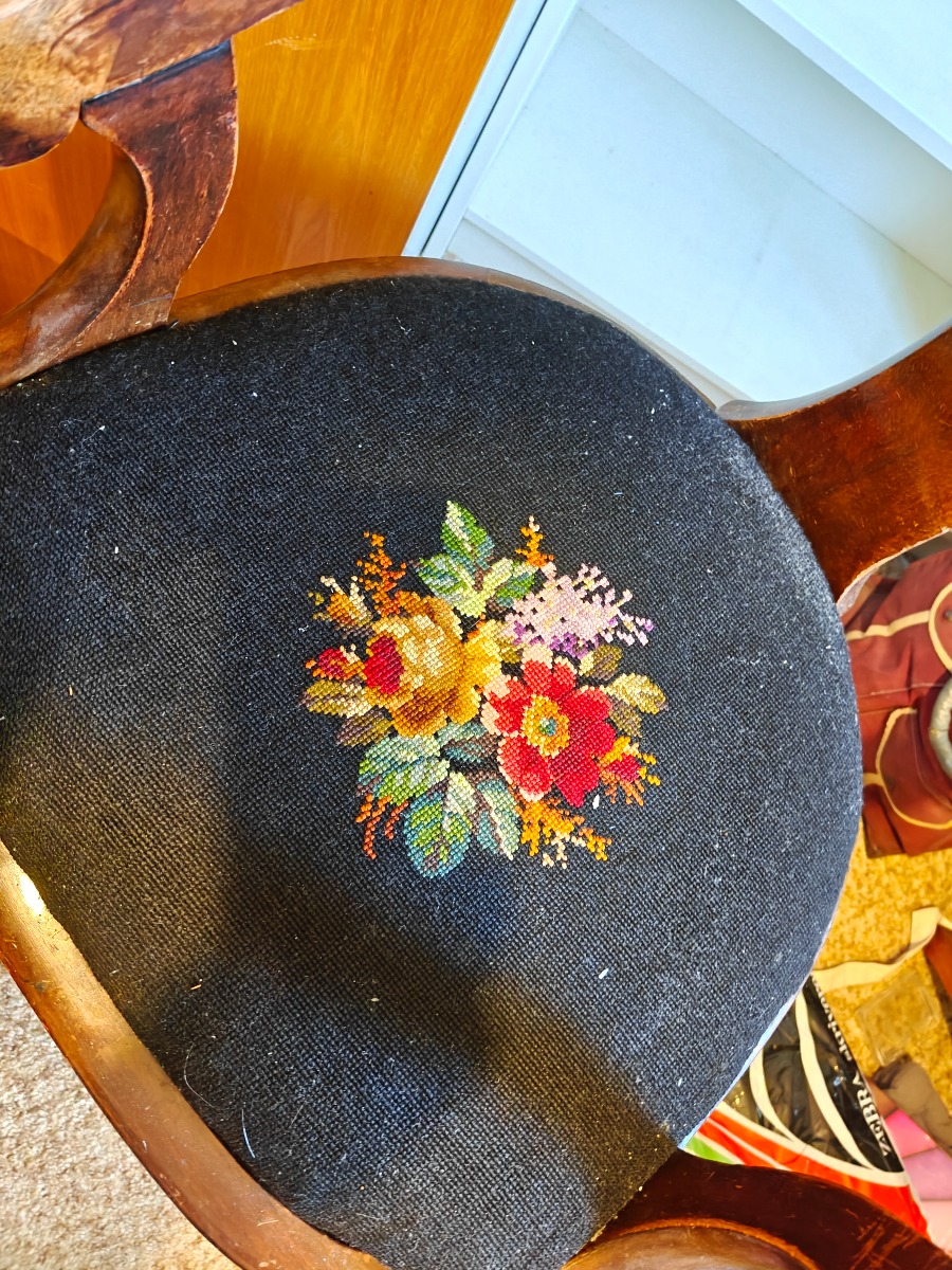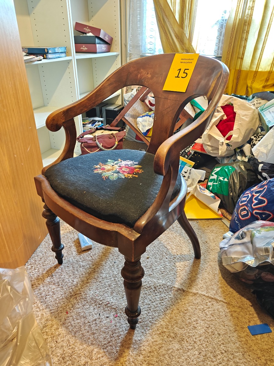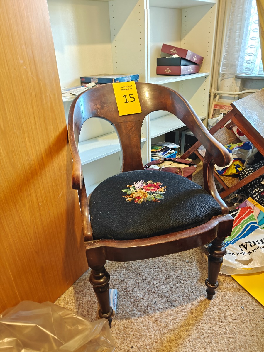 Mahogni armstol med broderet sæde med floralt motiv.