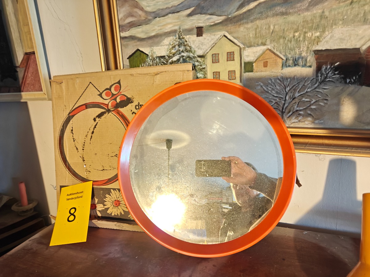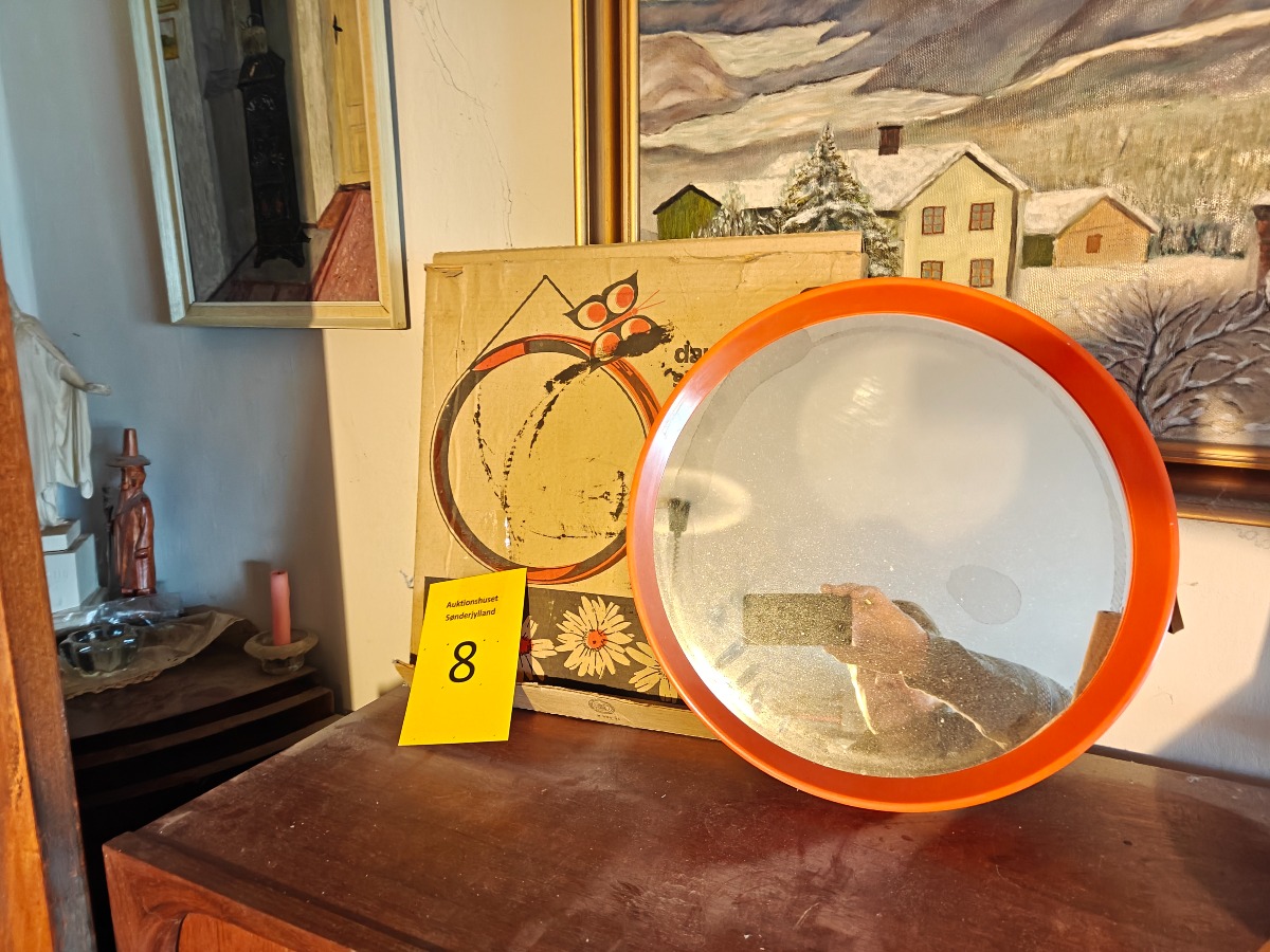 Silkeborg Spejlindustri, rundt spejl af orange plast. Ø. 40 cm. Original embalage medfølger.