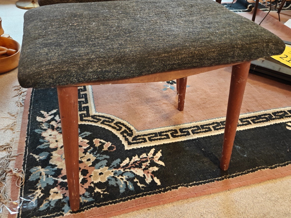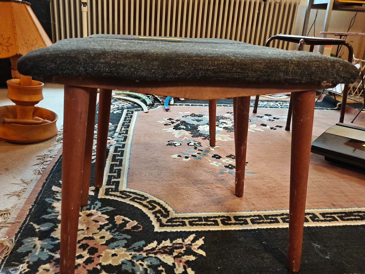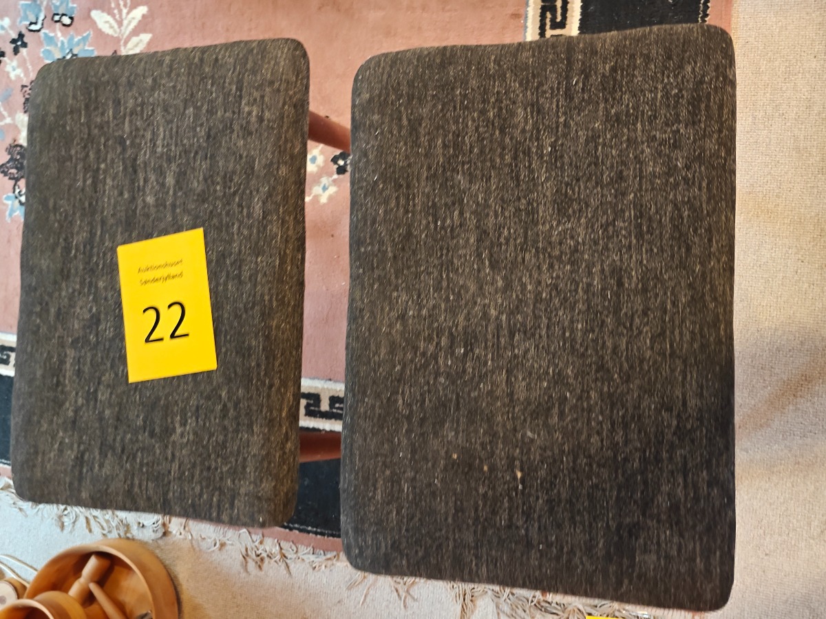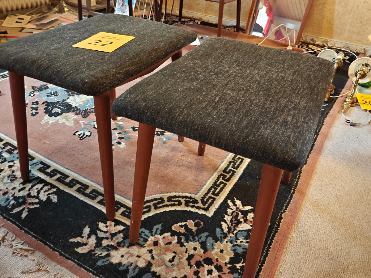 2 skamler. Polstret sæde med stel af teak eller bejdset bøg.