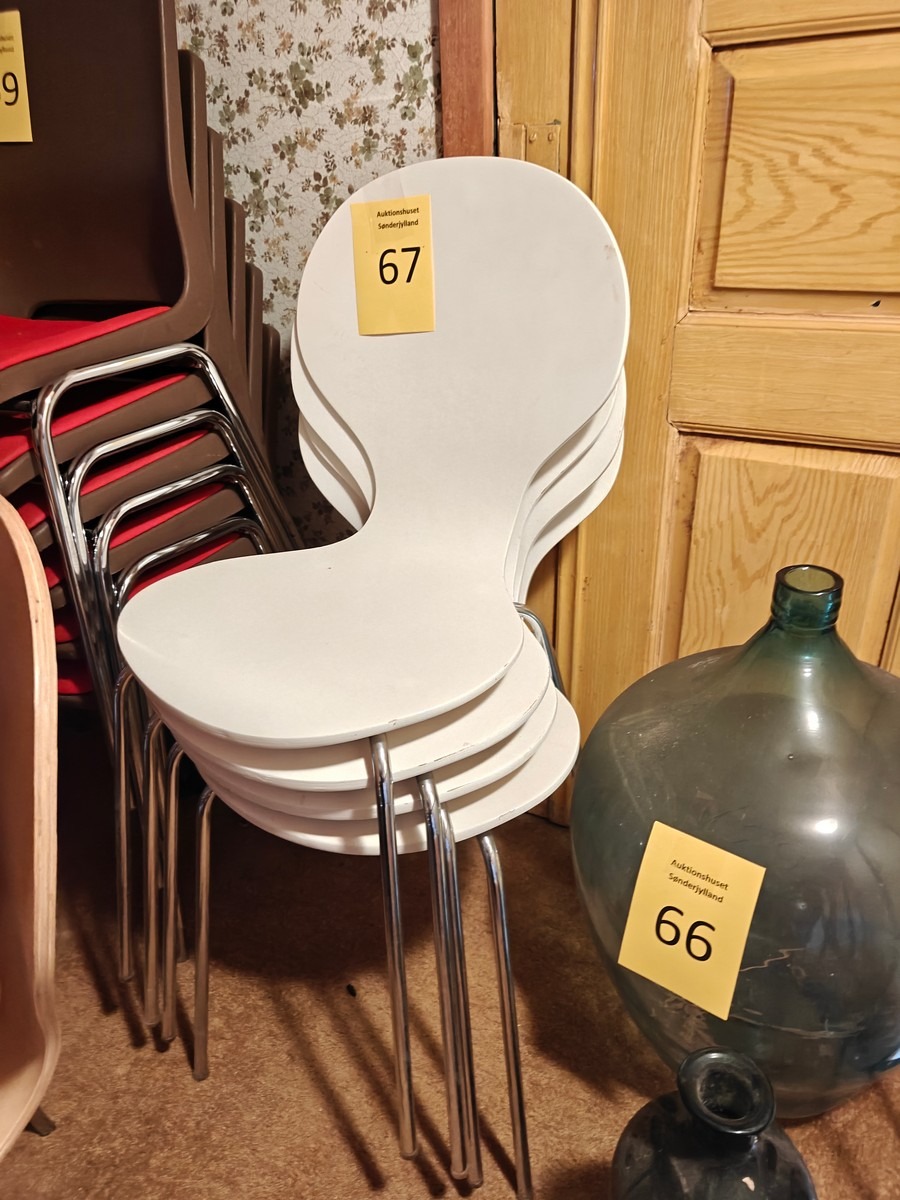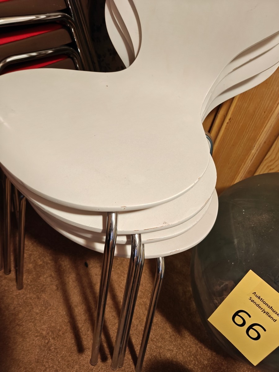 4 hvide skalstole med sæder af formspændt finer. Med mindre brugsspor.