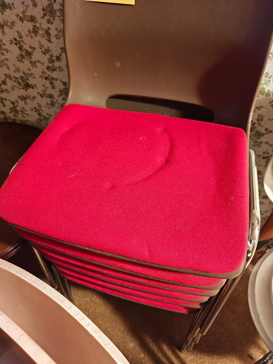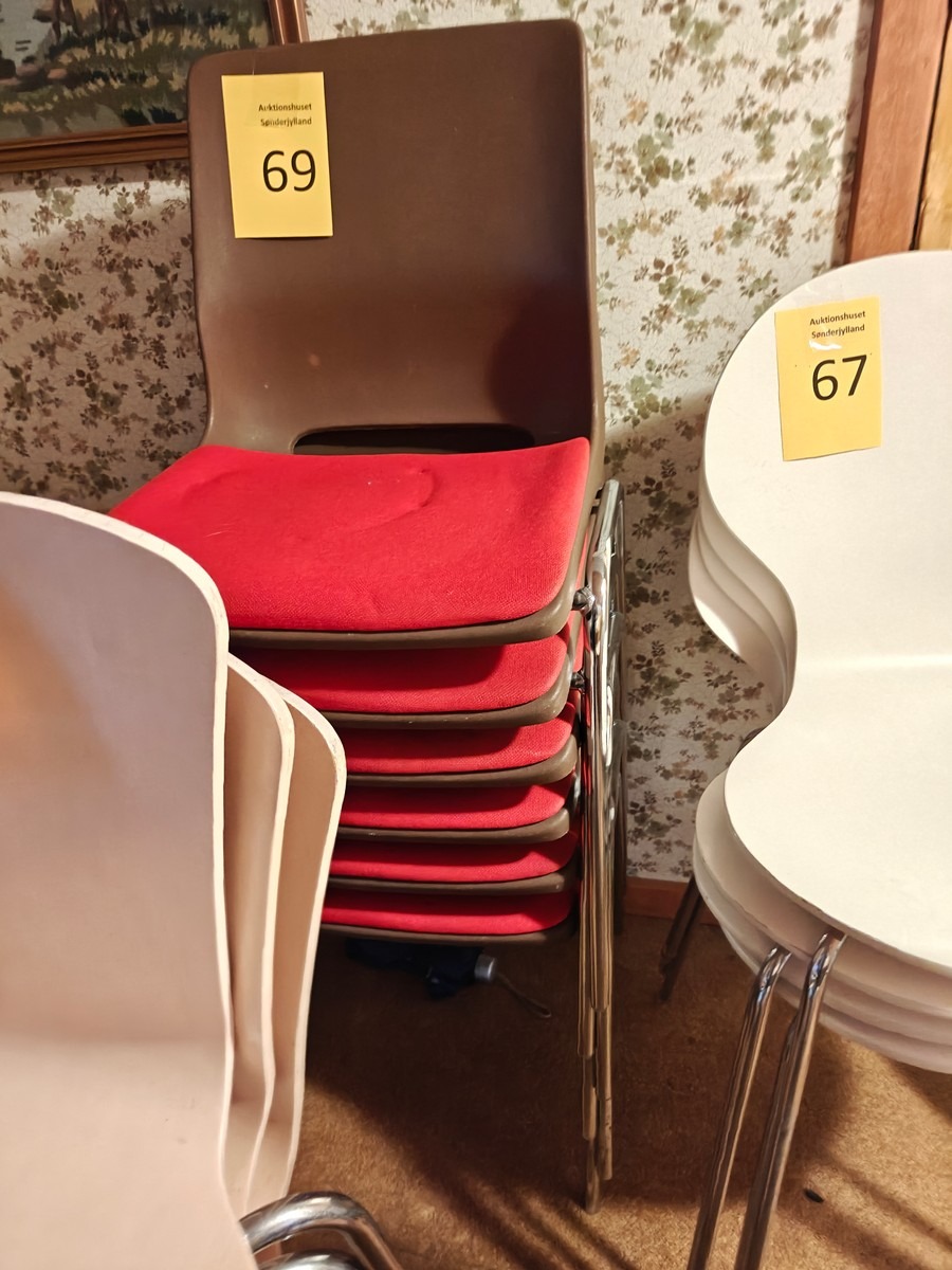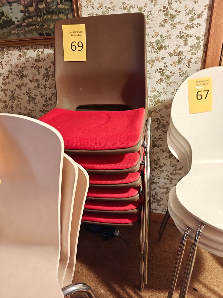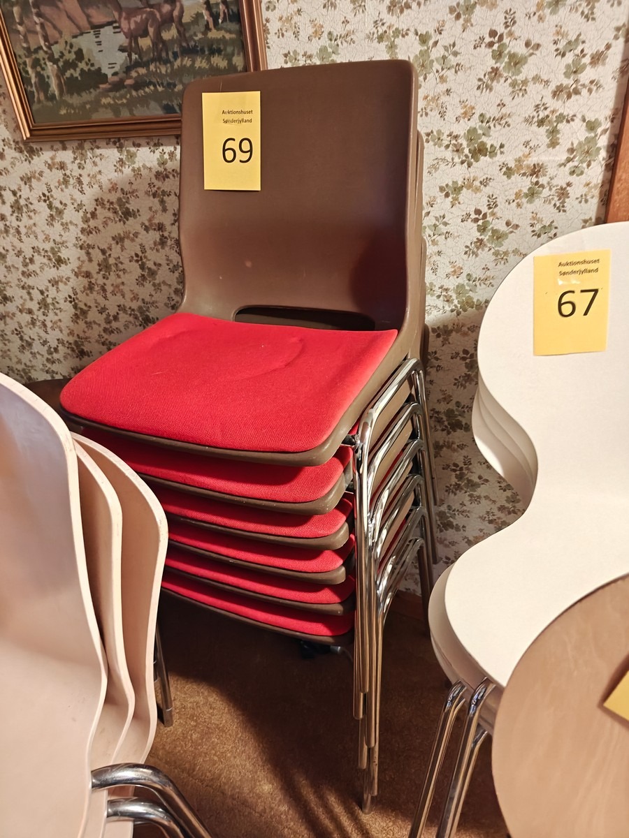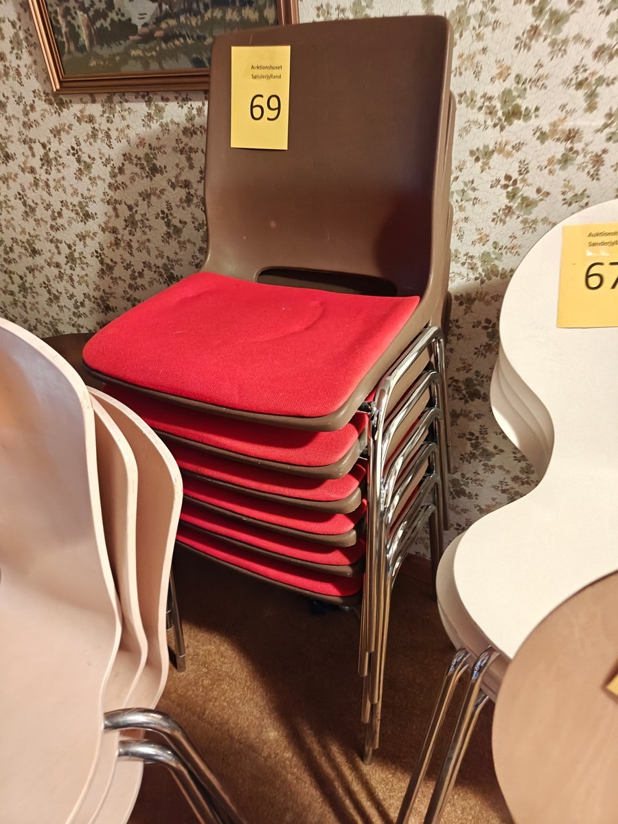 6 stabelstole med kromstel og brune plastsæder. Sædepude med rødt betræk. Aldersbetinget slid. Sædepuder med trykmærker.