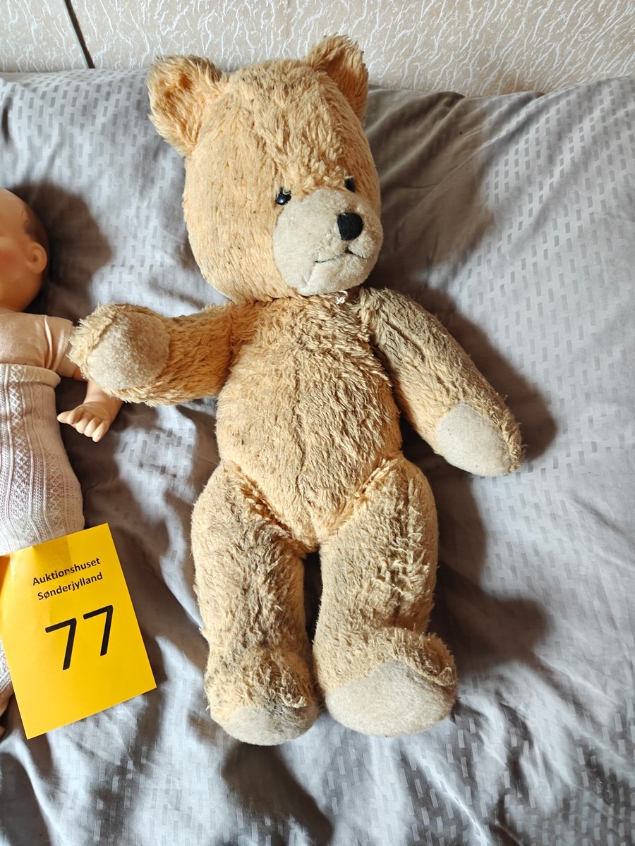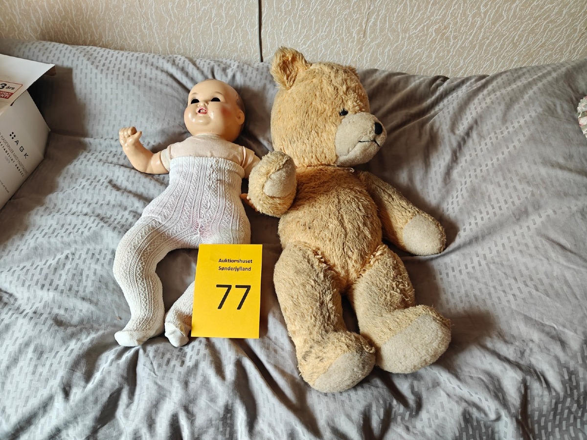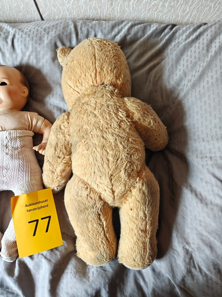 Ældre dukke og bamse. Dukke med hoved af porcelæn og arme og ben af komposit. Øjnene er løse inde i hovedet. Bamse i gul plys. L. 77 cm. Fremstår med patina og lidt smuds.