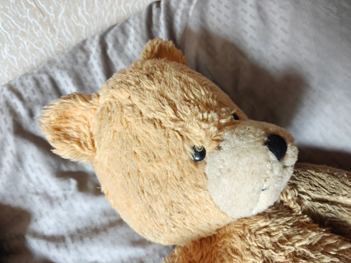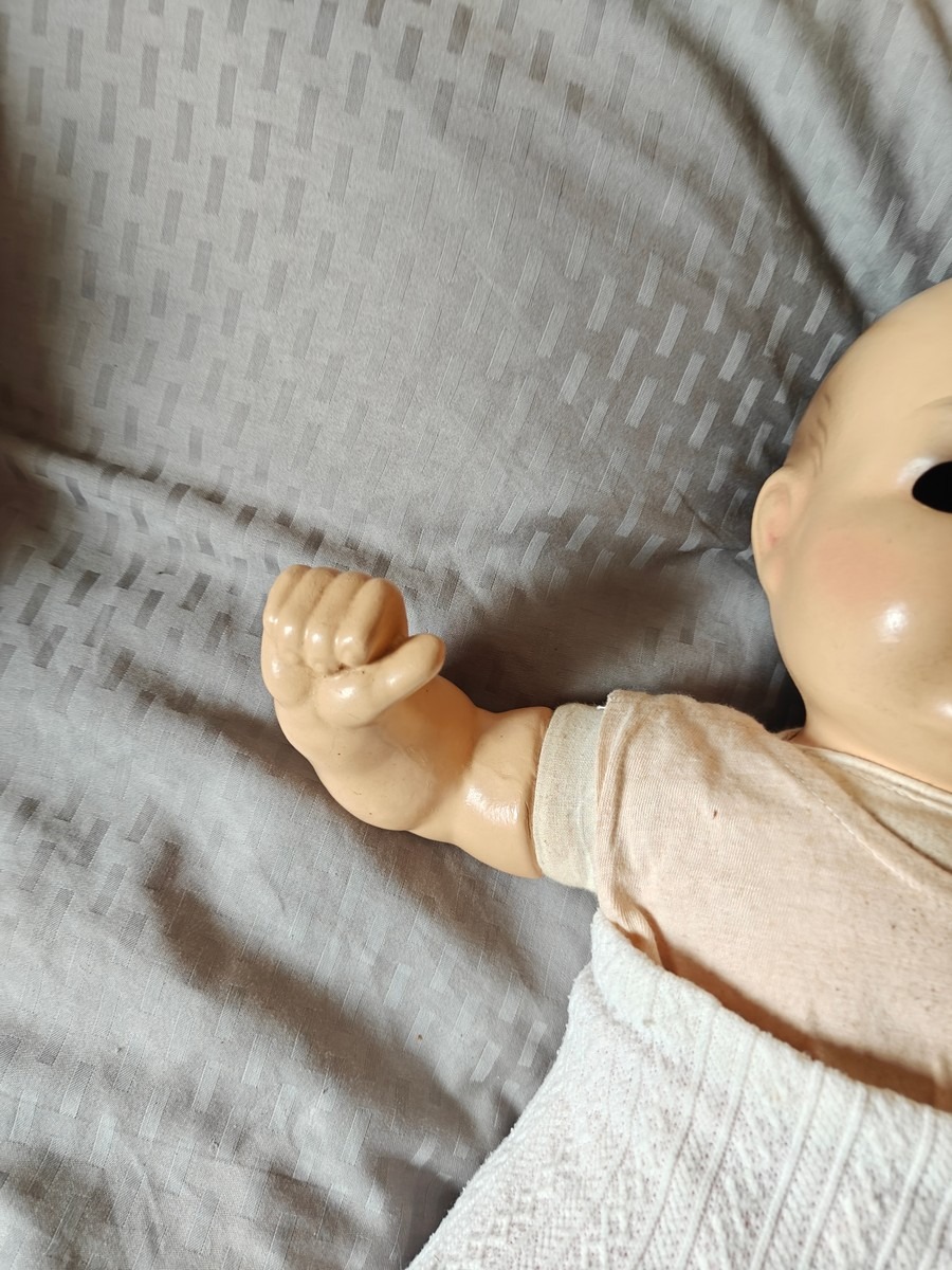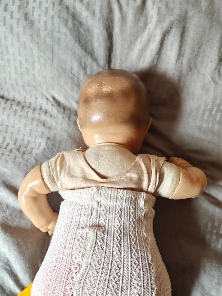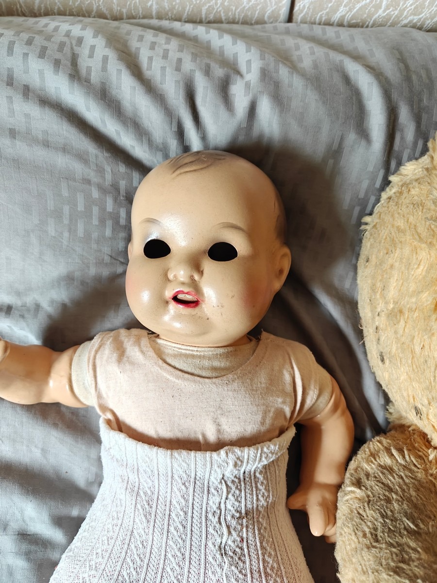 Ældre dukke og bamse. Dukke med hoved af porcelæn og arme og ben af komposit. Øjnene er løse inde i hovedet. Bamse i gul plys. L. 77 cm. Fremstår med patina og lidt smuds.