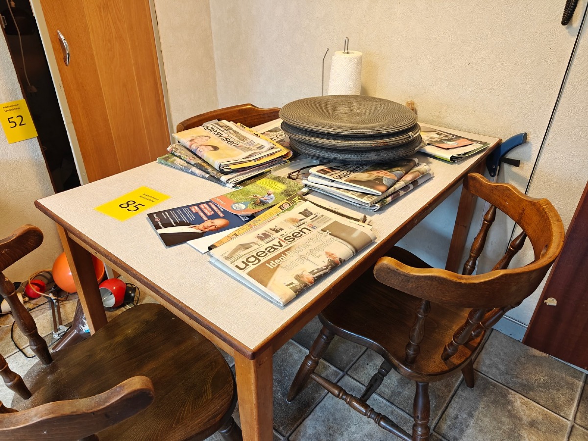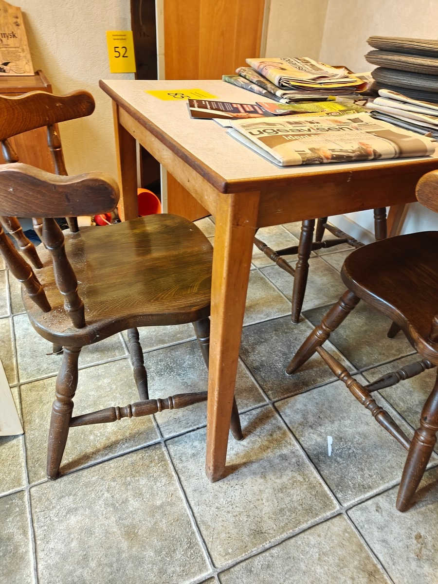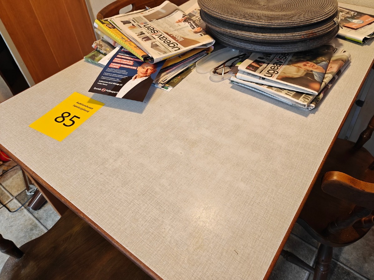 Ældre køkken-spisebord af bøg med lamineret bordplade. H. 75, B. 120, D. 72 cm. Aldersrelateret slid.