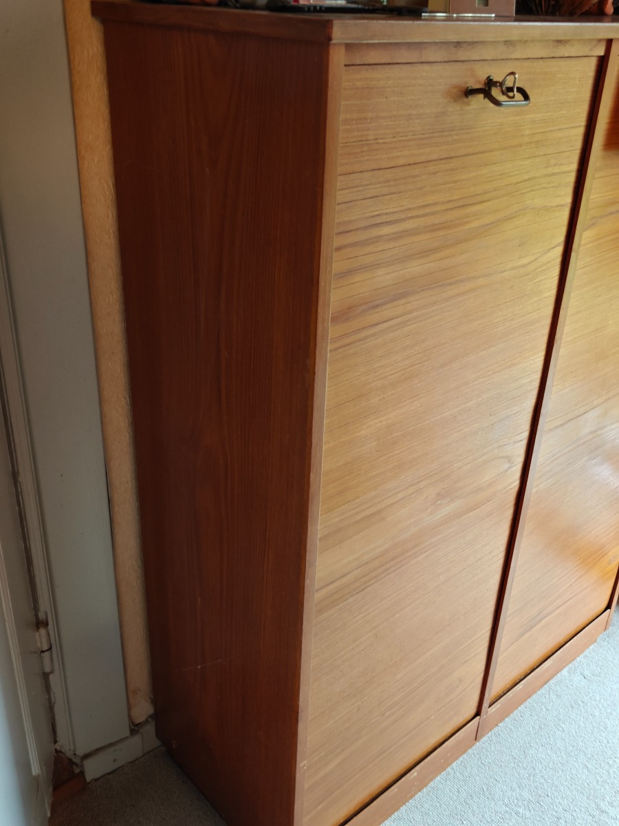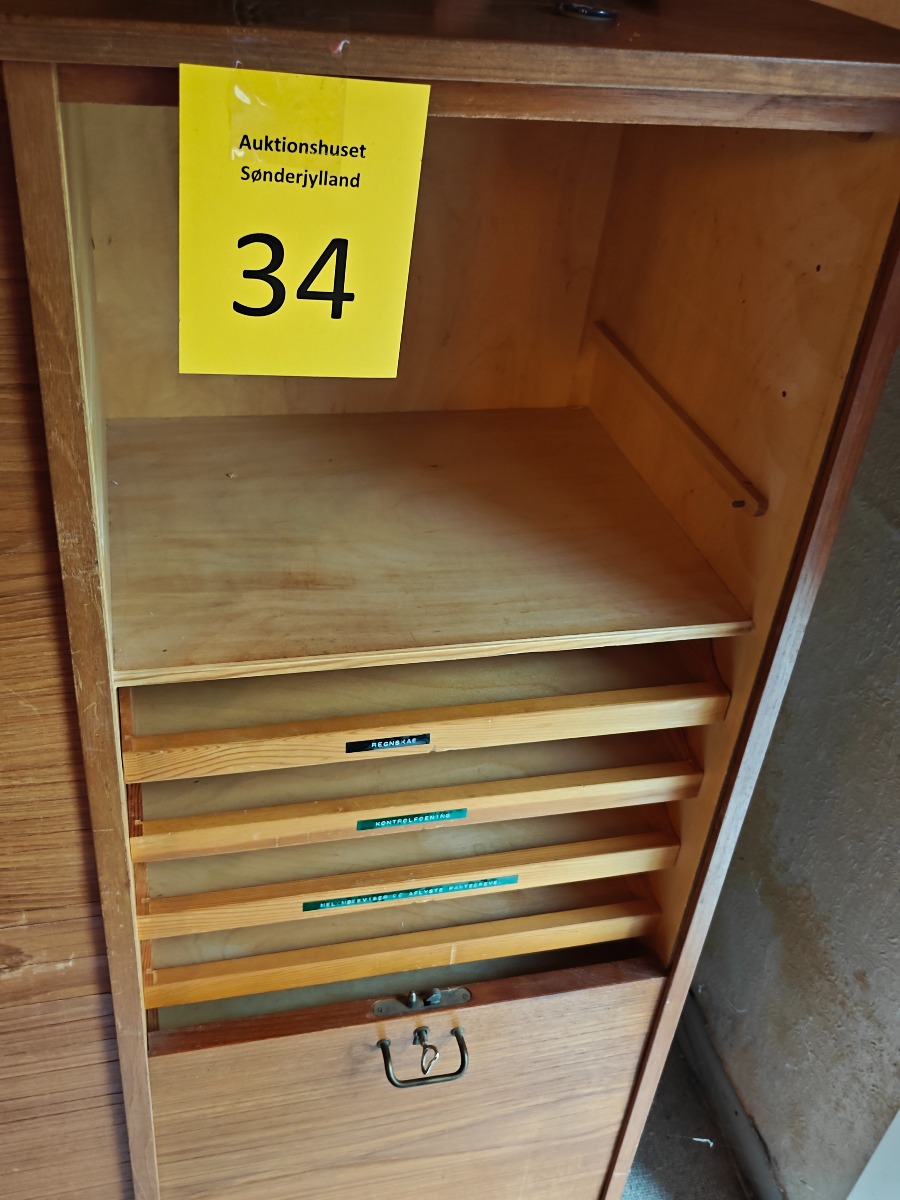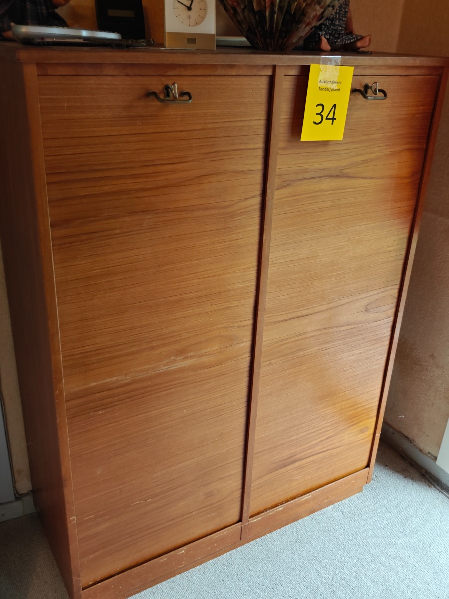 Dobbelt jalousiskab af teak med skuffer og hylder. H. 120, B. 90, D. 40 cm. Skjolder på topplade.