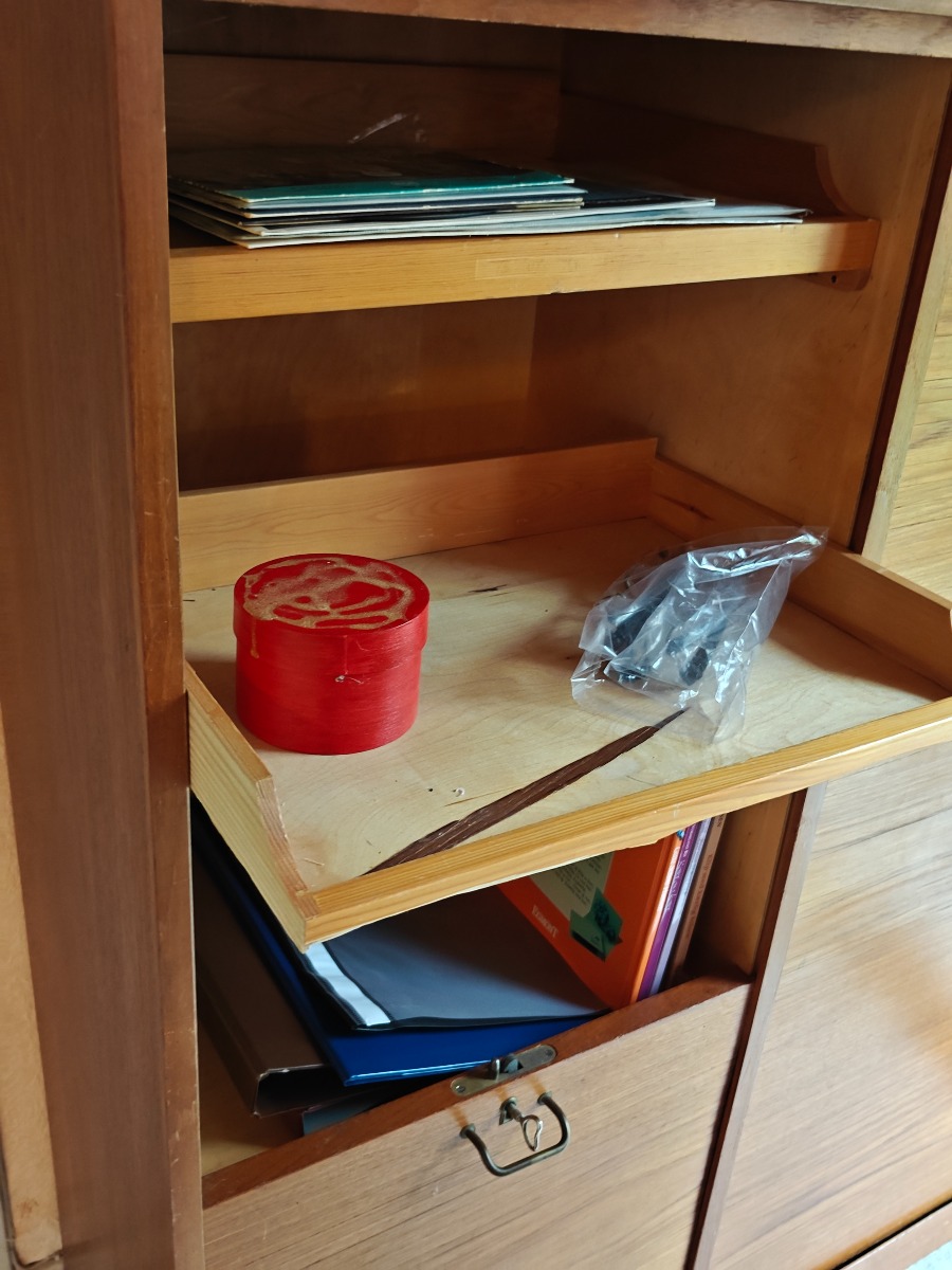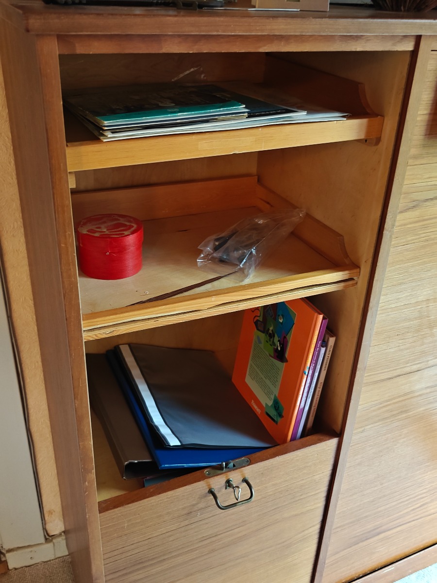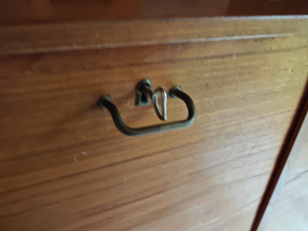 Dobbelt jalousiskab af teak med skuffer og hylder. H. 120, B. 90, D. 40 cm. Skjolder på topplade.