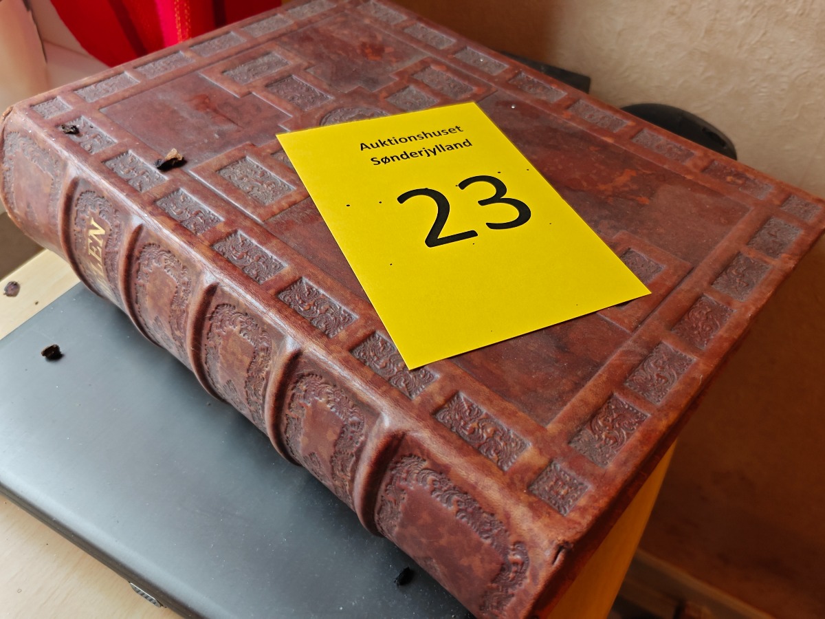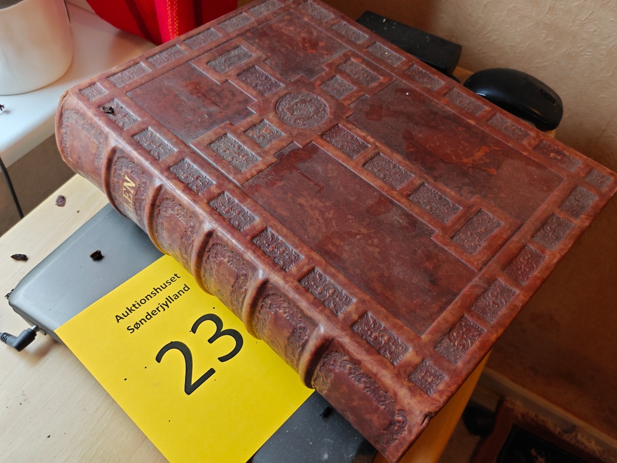Familliebibel i hellæder med præget dekoration.