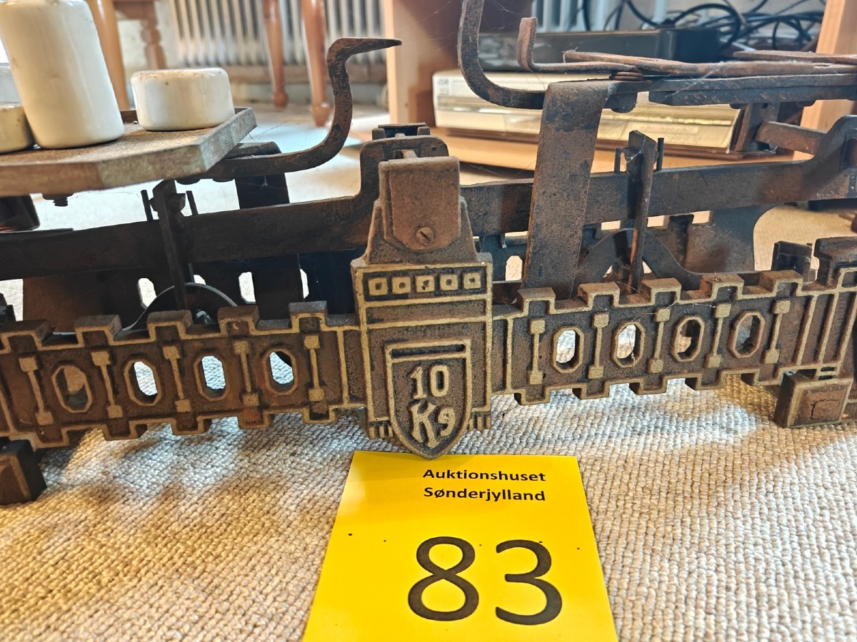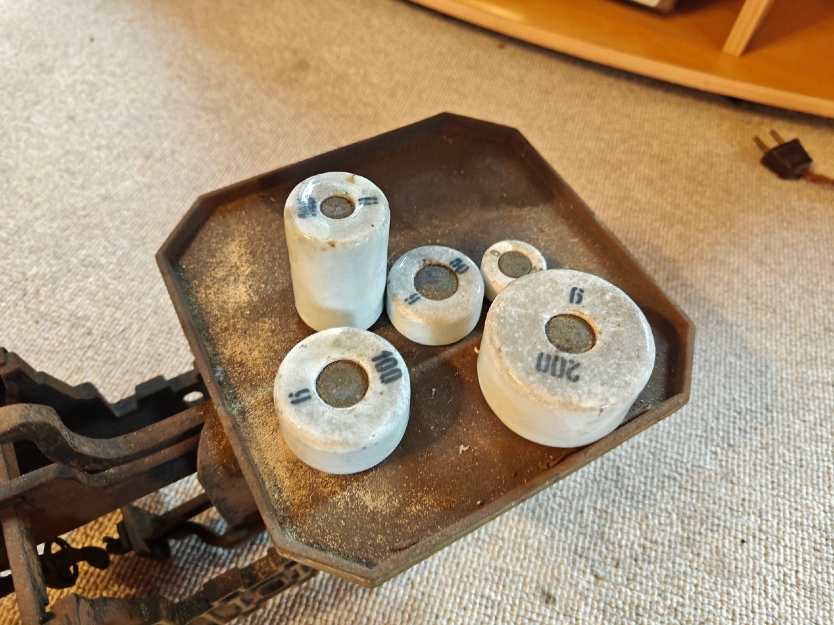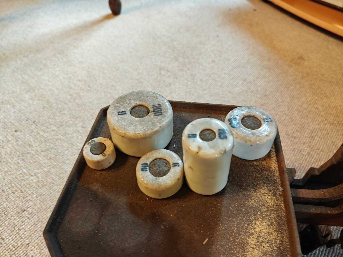 Købmandsvægt af jern. Medfølger 5 lodder af porcelæn. Vægtskål mangler.