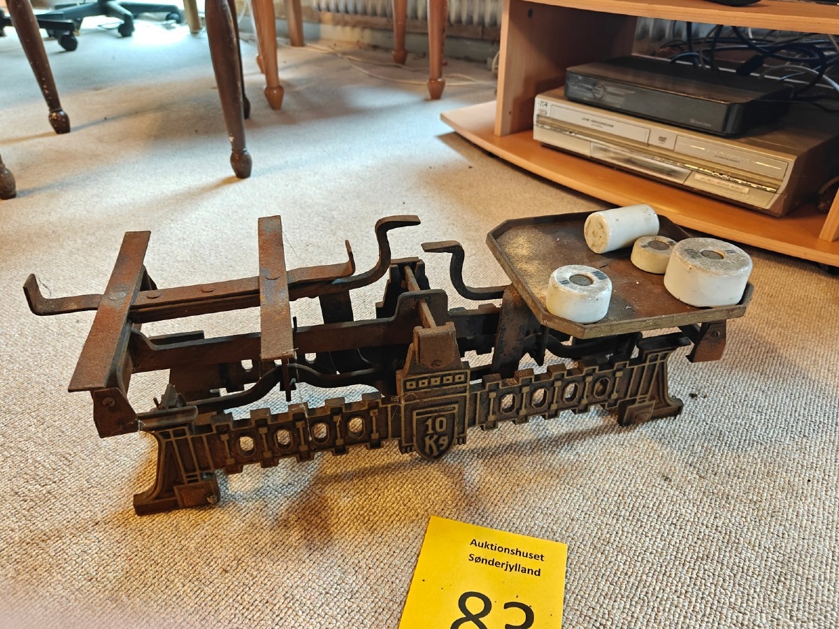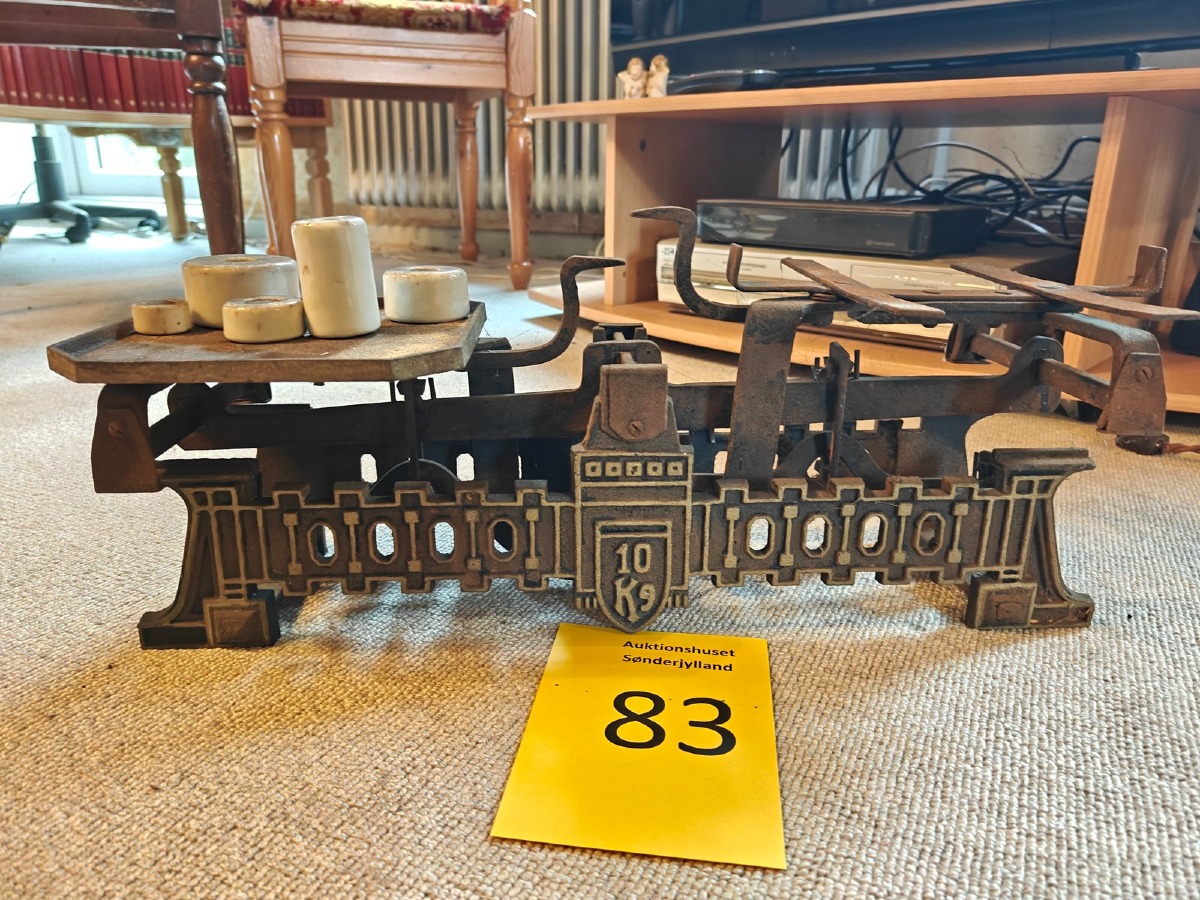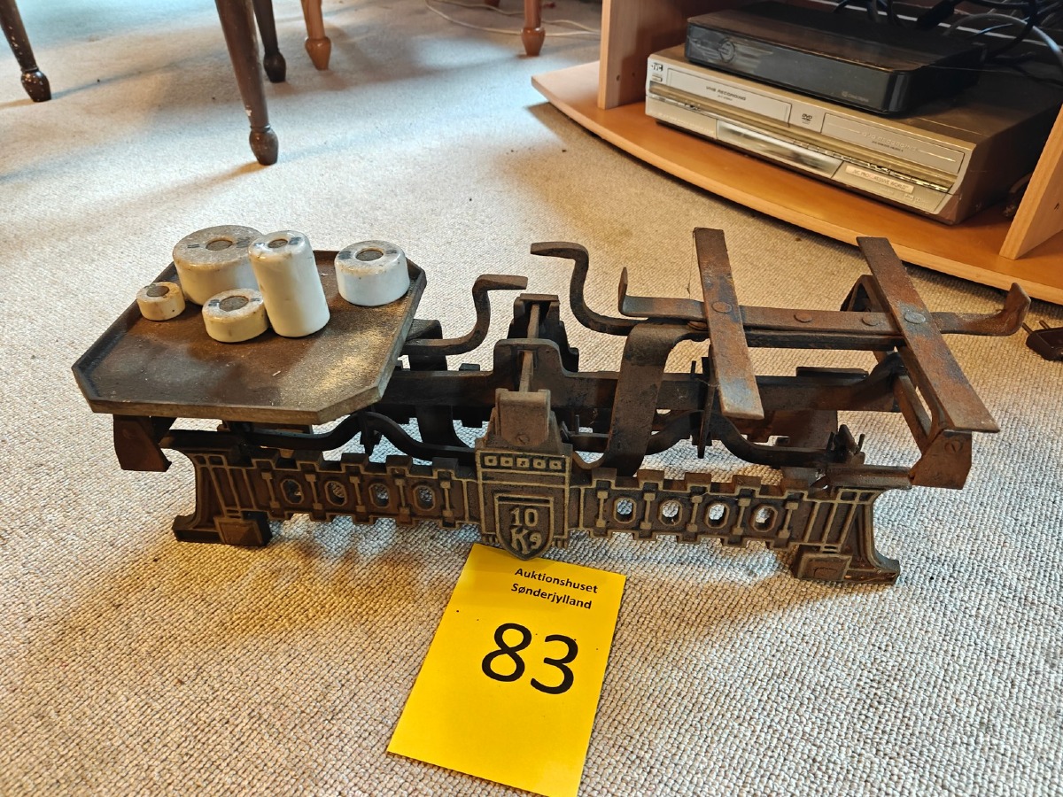 Købmandsvægt af jern. Medfølger 5 lodder af porcelæn. Vægtskål mangler.