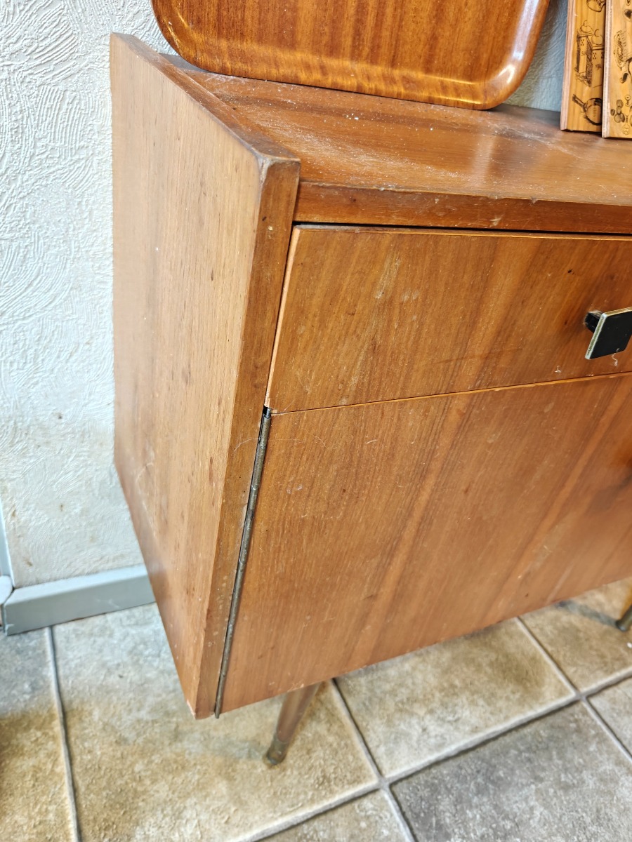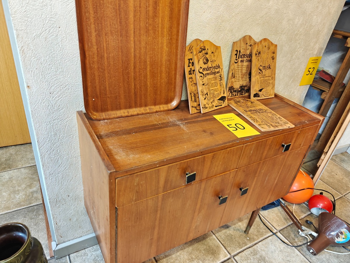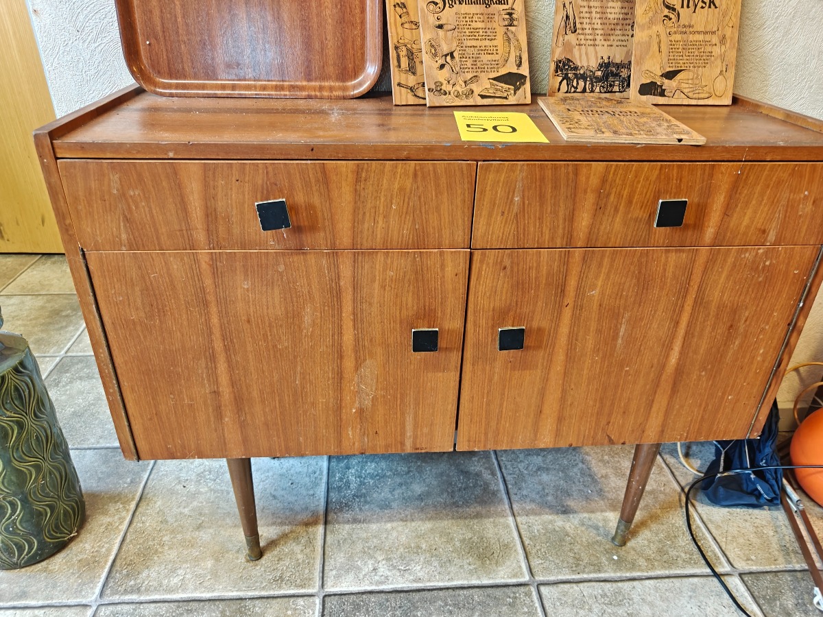 Lille skab på ben af fineret teak. Fødder af messing. 2 låger og skuffer. Femstår med slid. Hertil teak-bakke samt smørrebrætter med opskrifter.