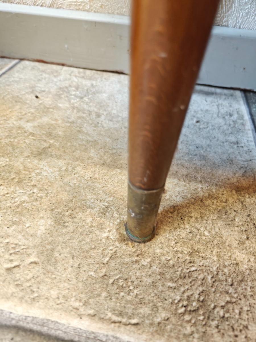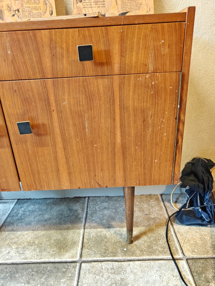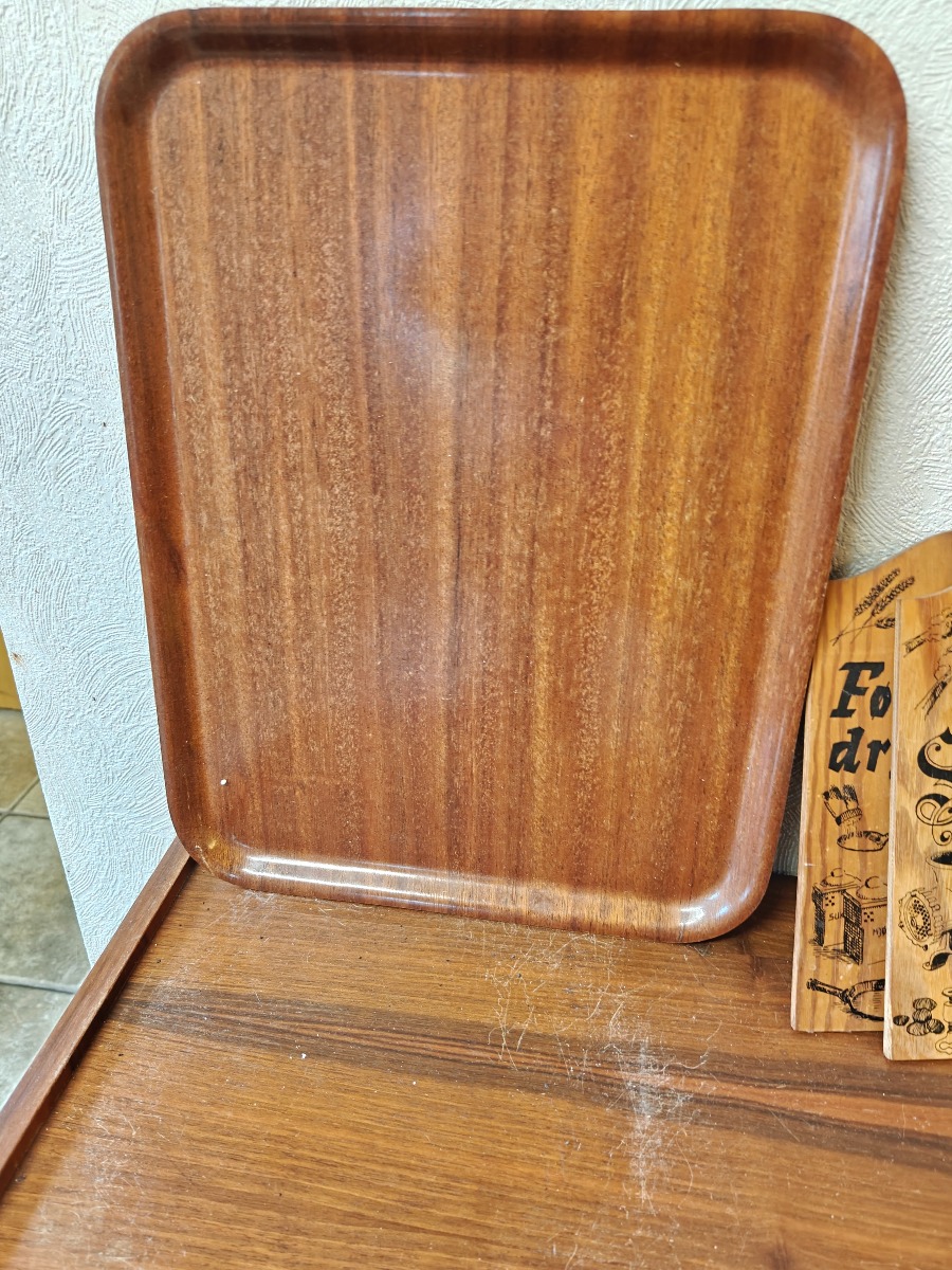 Lille skab på ben af fineret teak. Fødder af messing. 2 låger og skuffer. Femstår med slid. Hertil teak-bakke samt smørrebrætter med opskrifter.