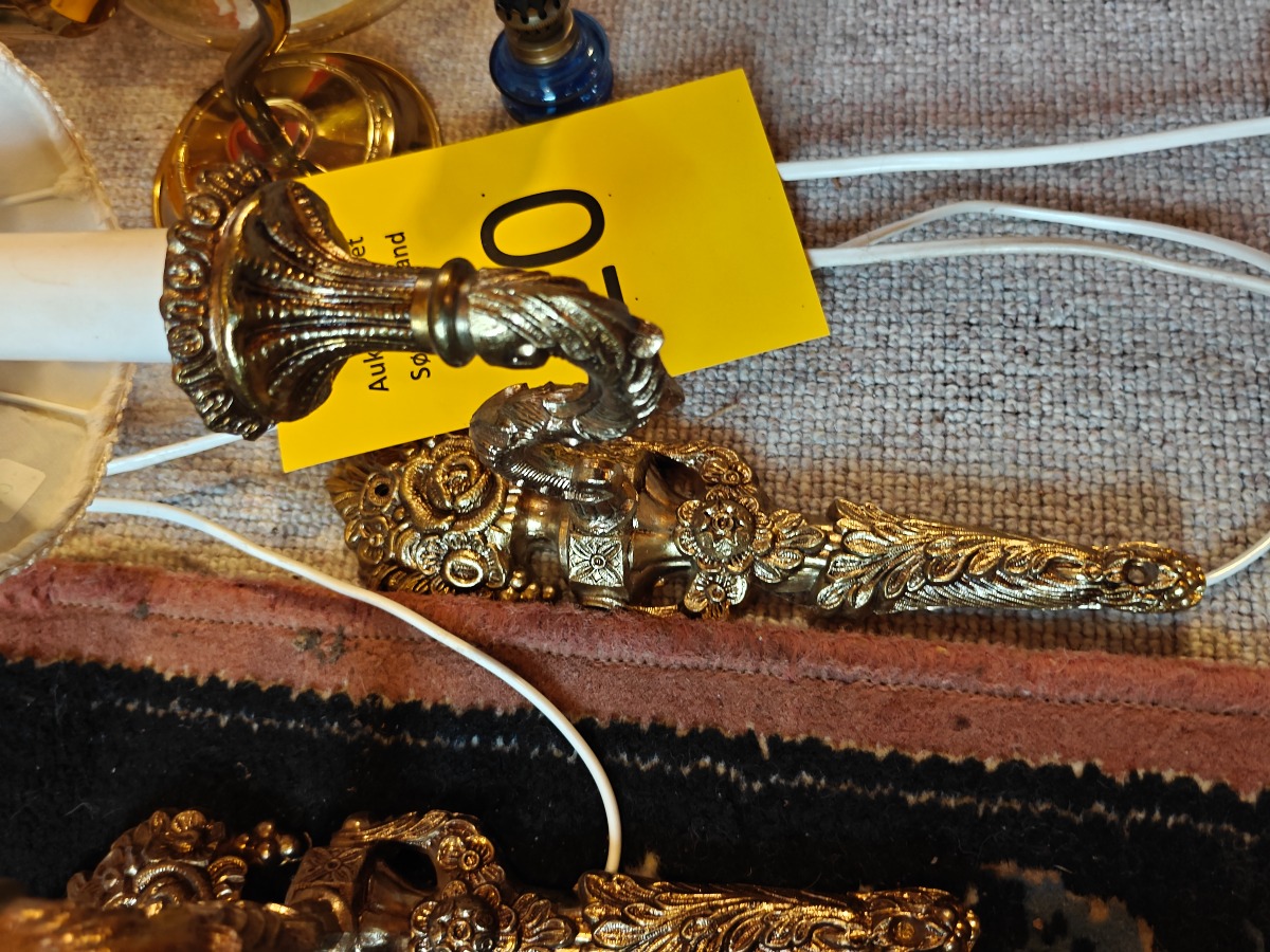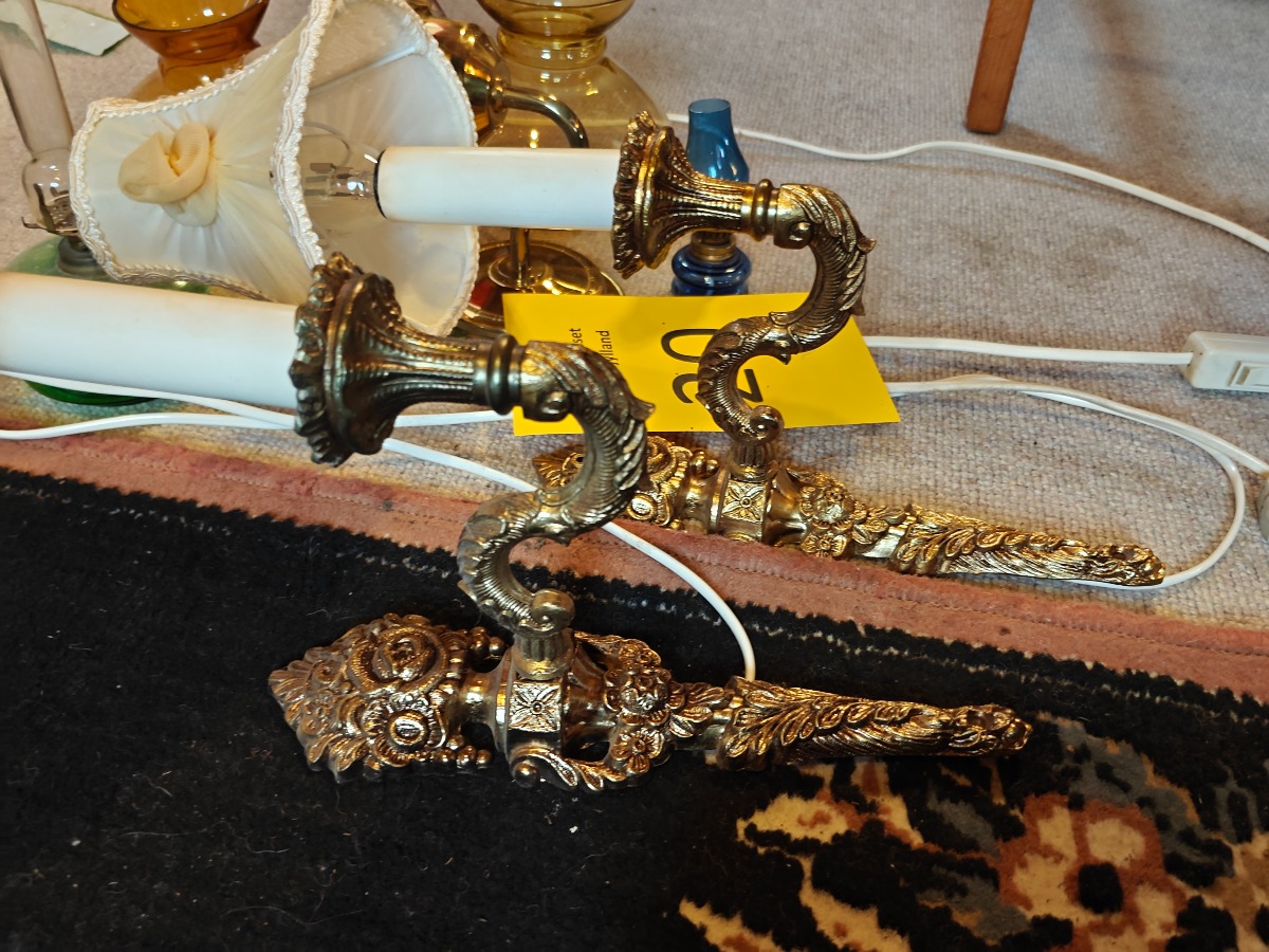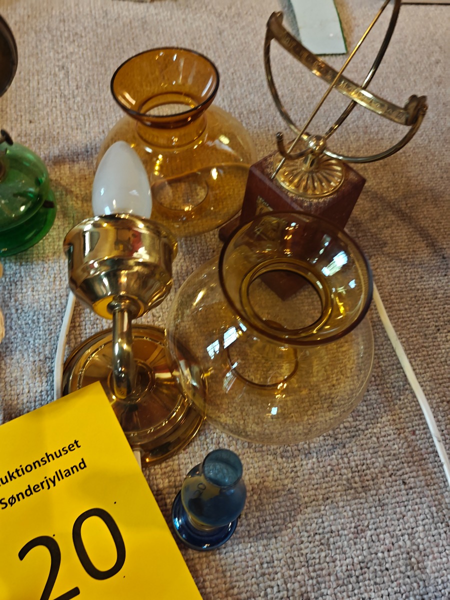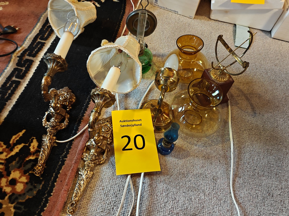 Lot. lamper. 2 lampetter af messing, petroleums væglampe m.m. H. for lampetter 30 cm.