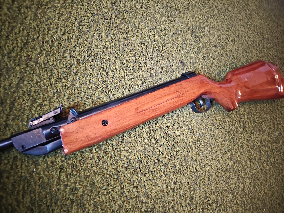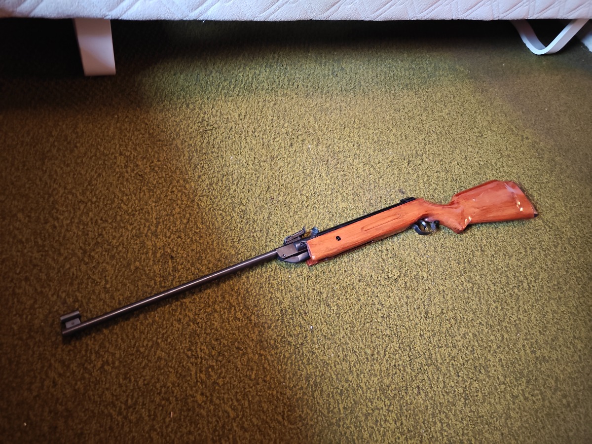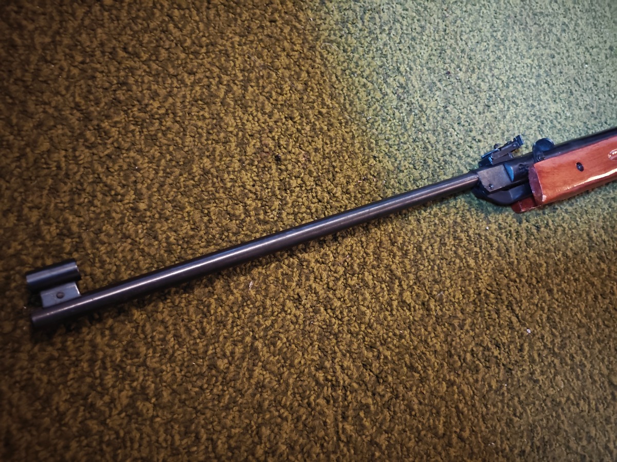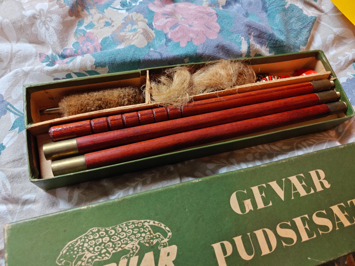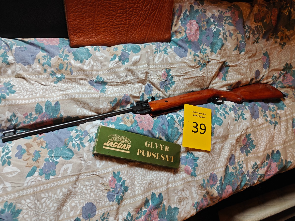 Luftgevær, ukent fabrikat kal. 4,5 og Jaguar pudsesæt til gevær. L. for gevær 105 cm.