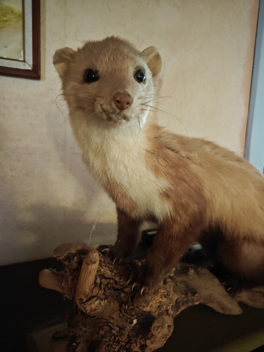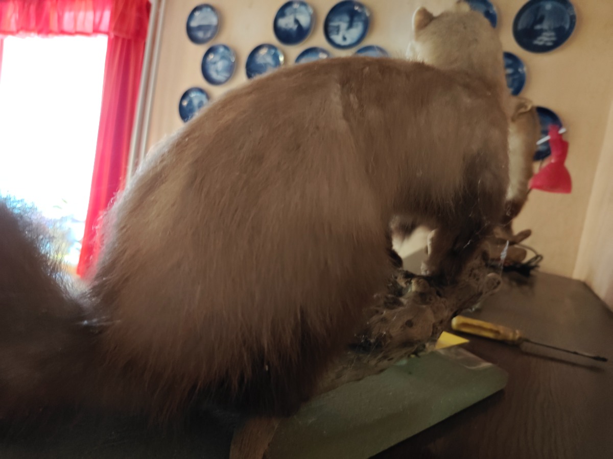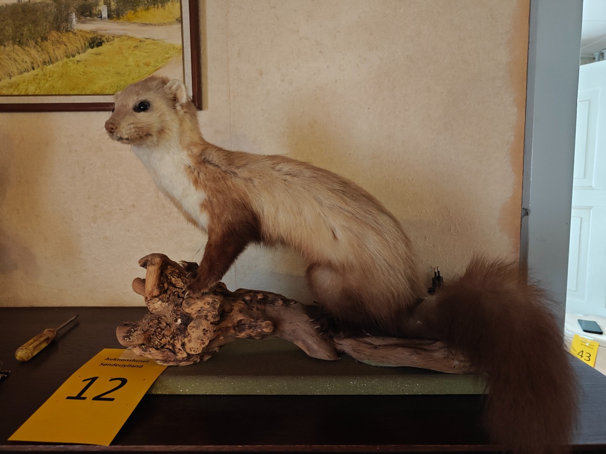 Udstoppet husmår. 42 x 18 x 35 cm. I umiddelbart pæn stand.