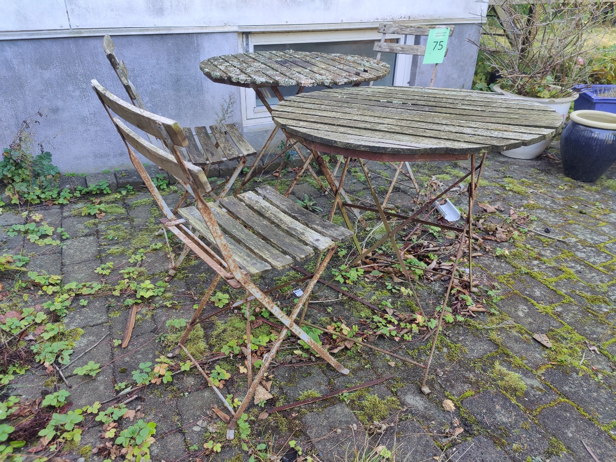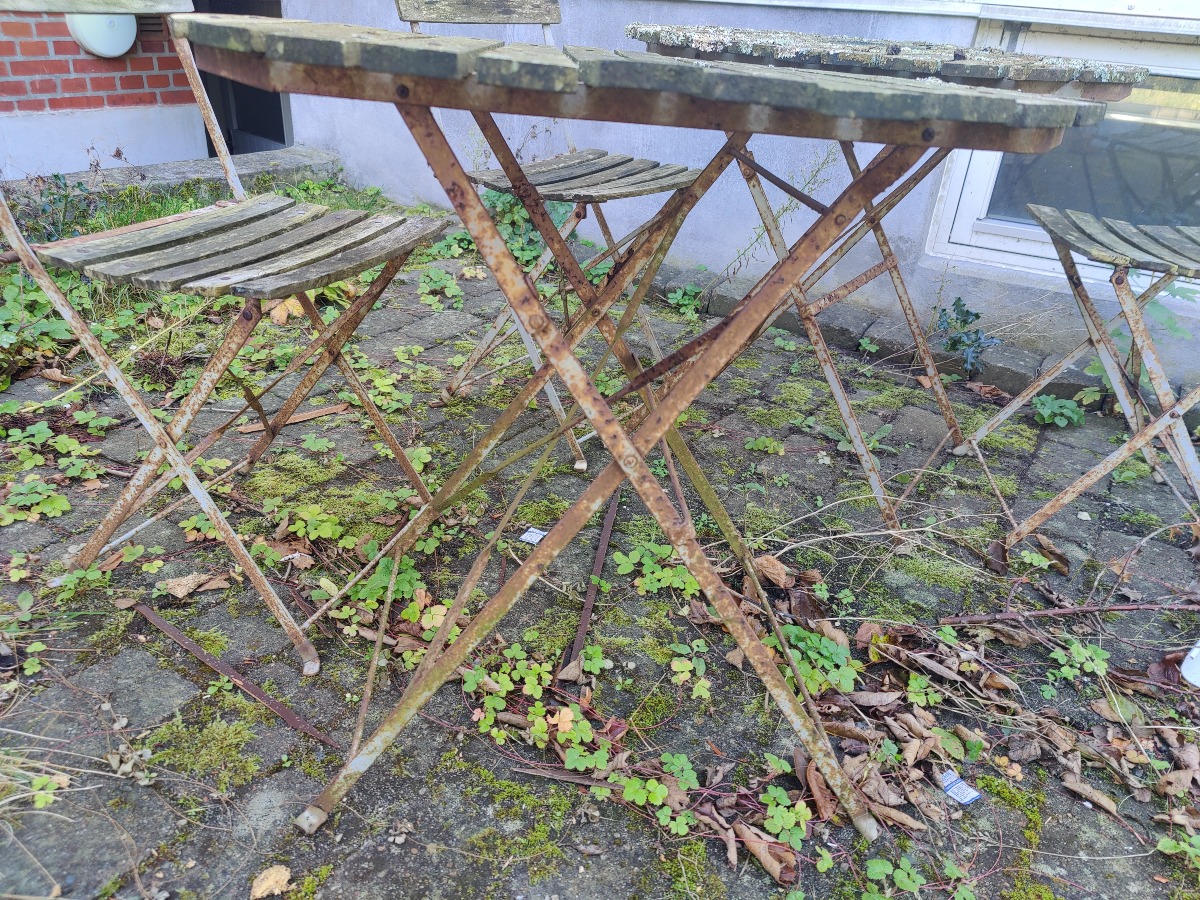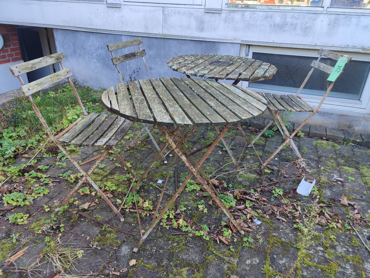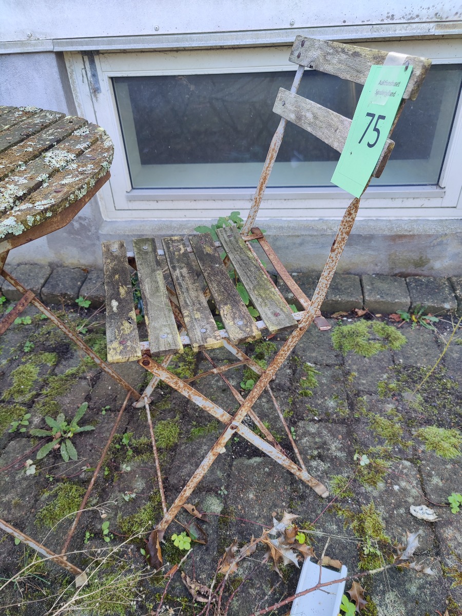 Cafémøbler i fransk stil. Metalstel træmontering. Fremstår vejrbidt og kræver renovering.