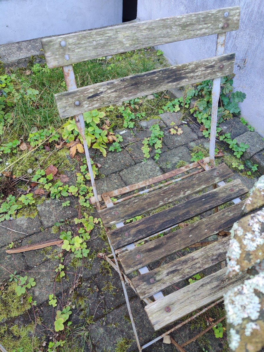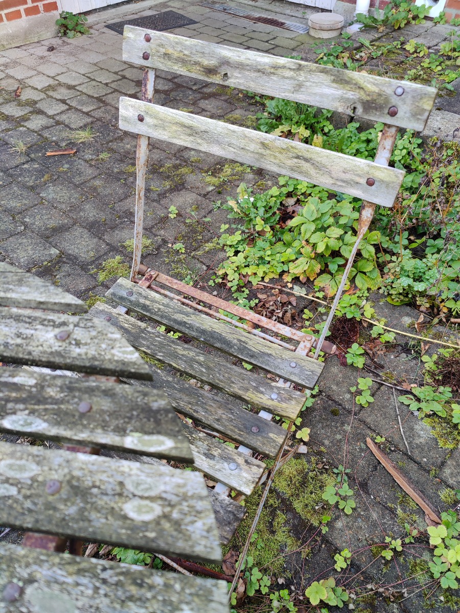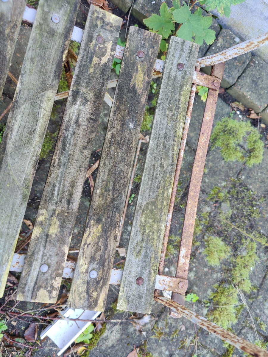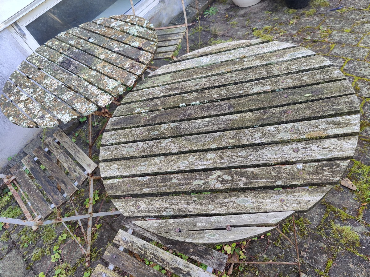 Cafémøbler i fransk stil. Metalstel træmontering. Fremstår vejrbidt og kræver renovering.