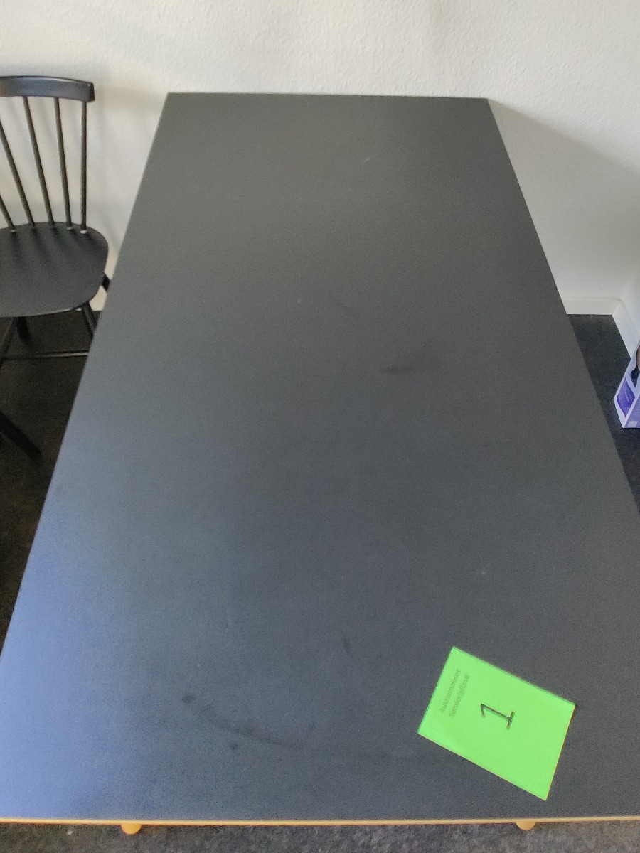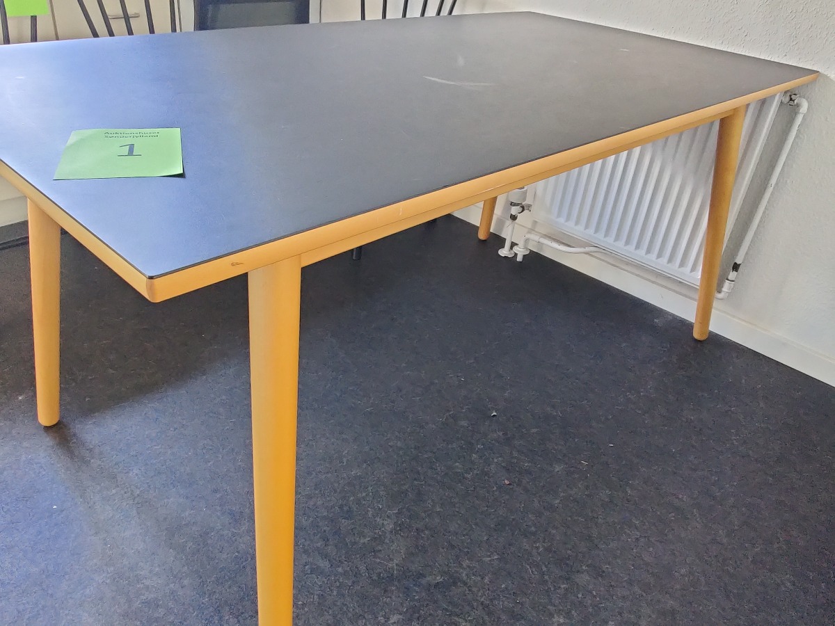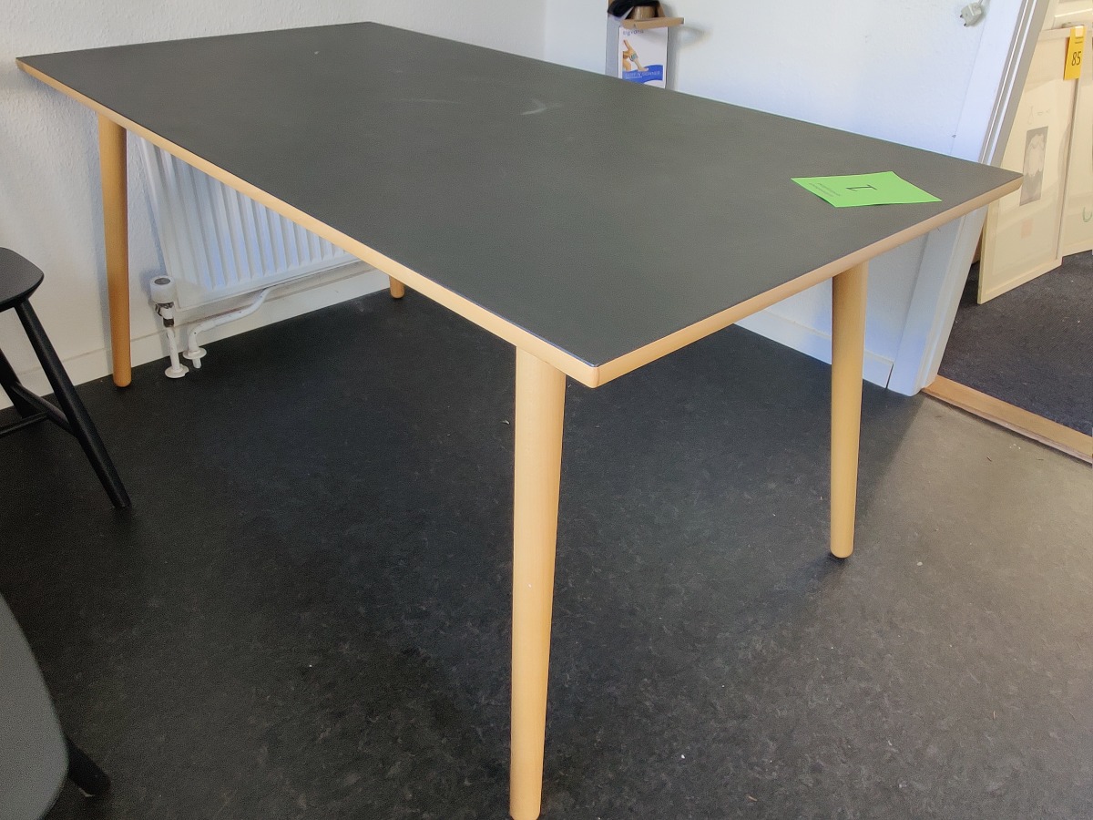 Poul M. Volther for FDB C35B spisebord i egetræ med linoleums bordplade i sort. Det måler 160 x 82 cm. Med alm. bruggspor.