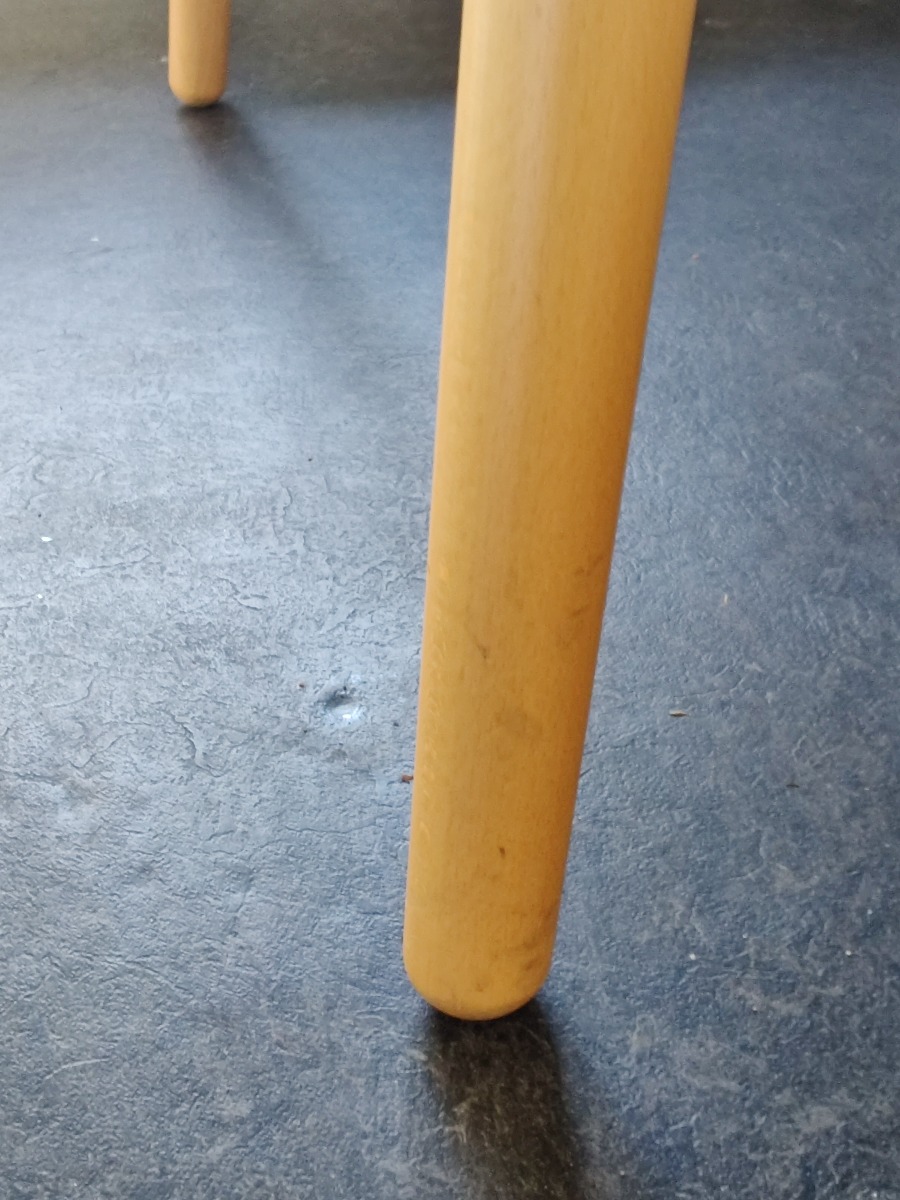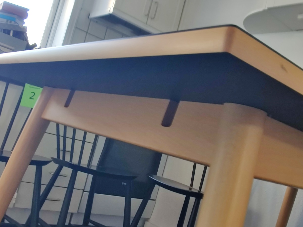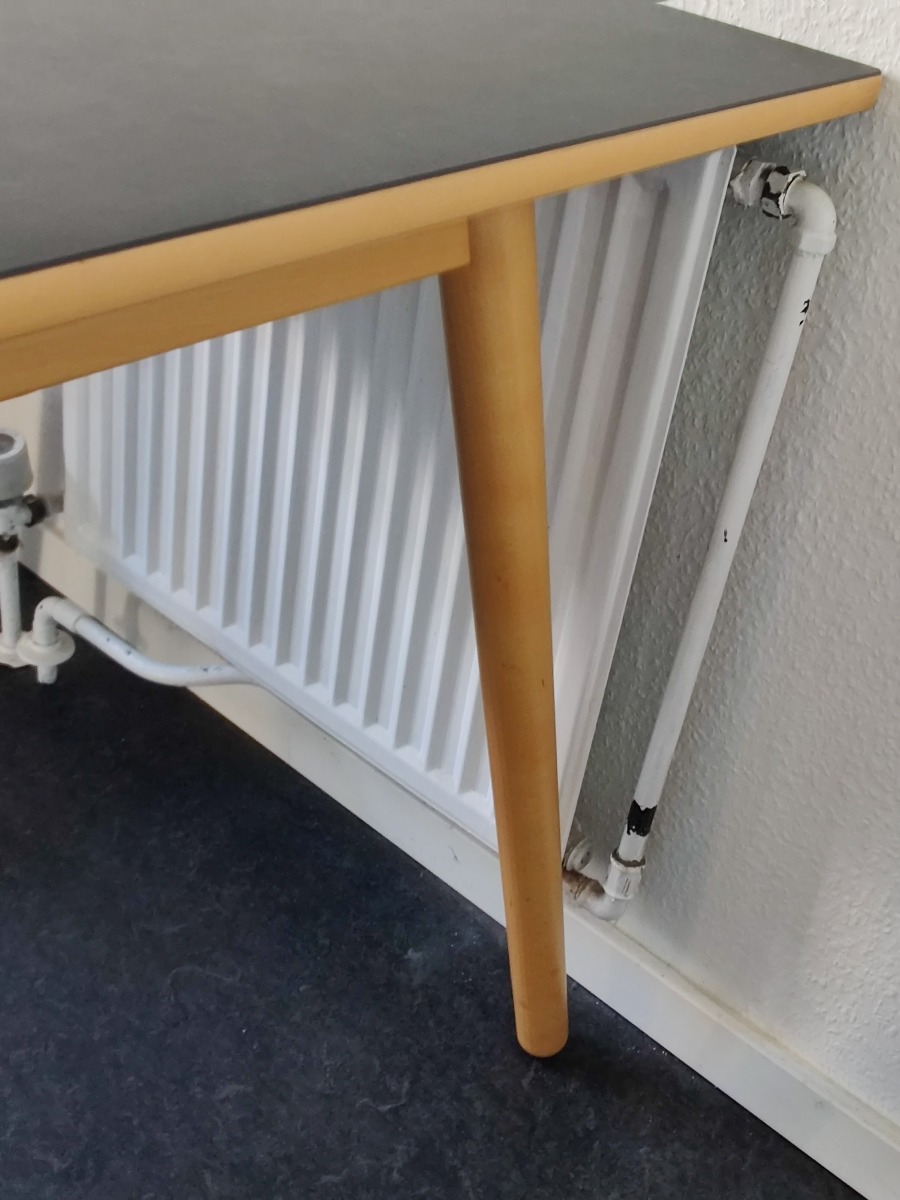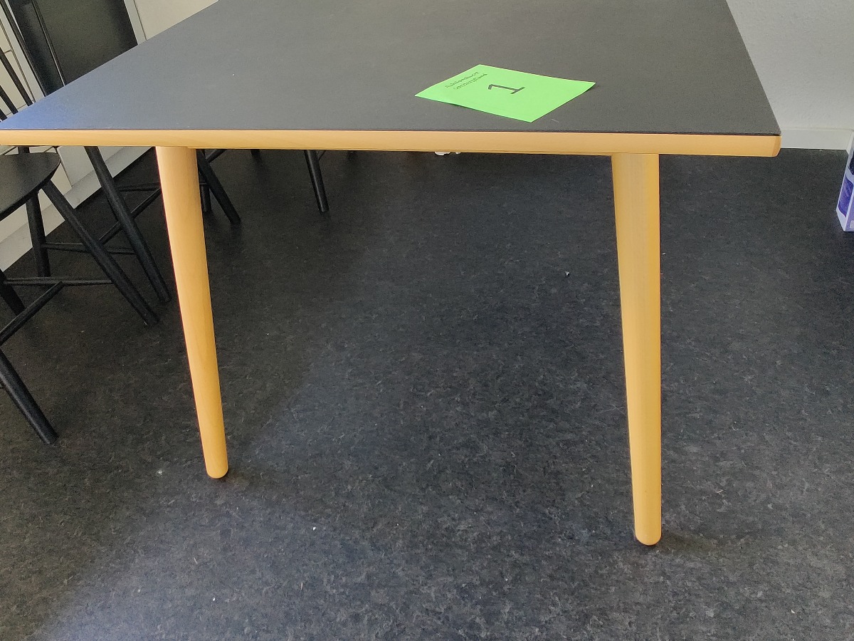 Poul M. Volther for FDB C35B spisebord i egetræ med linoleums bordplade i sort. Det måler 160 x 82 cm. Med alm. bruggspor.