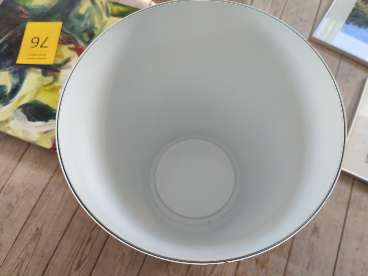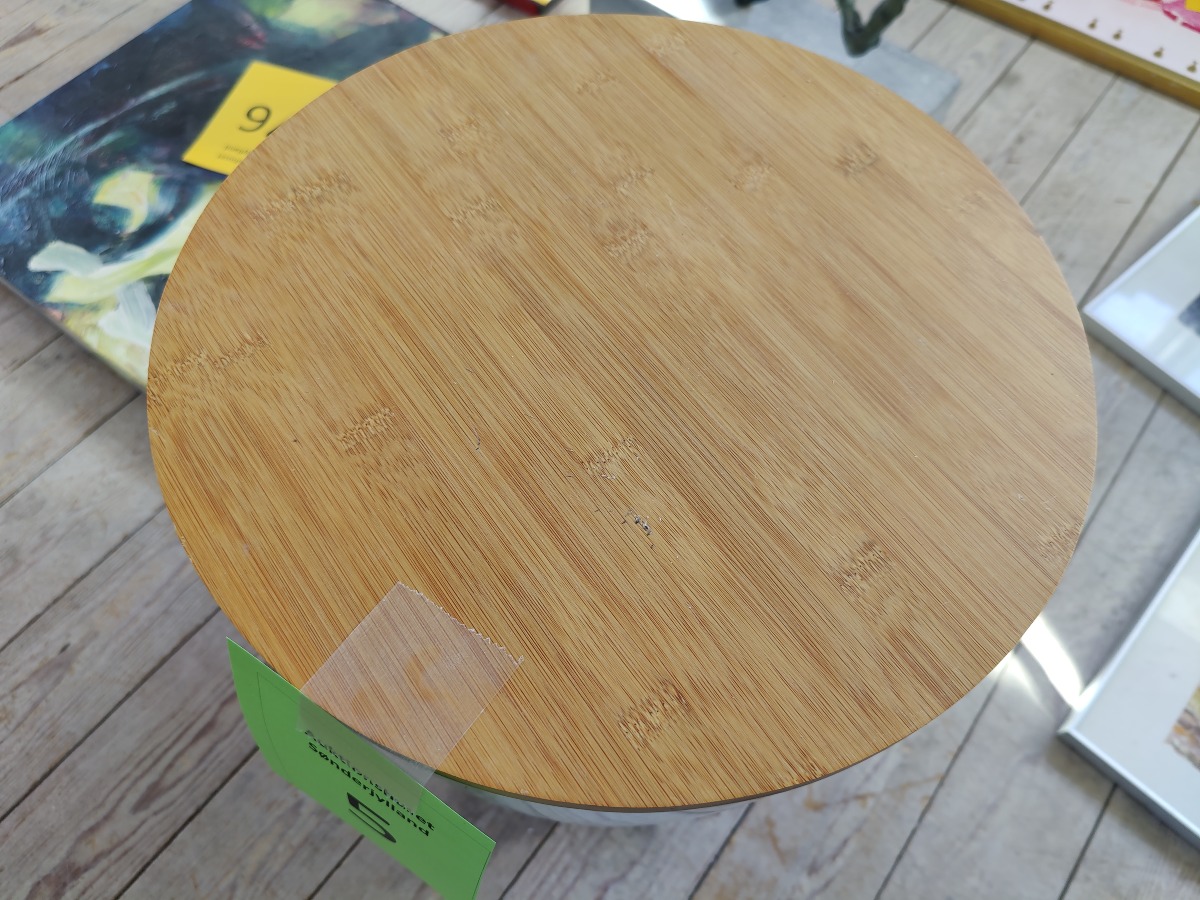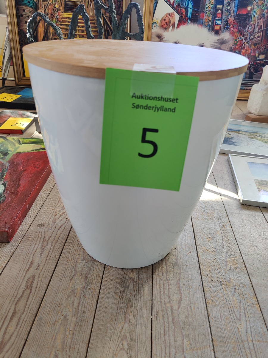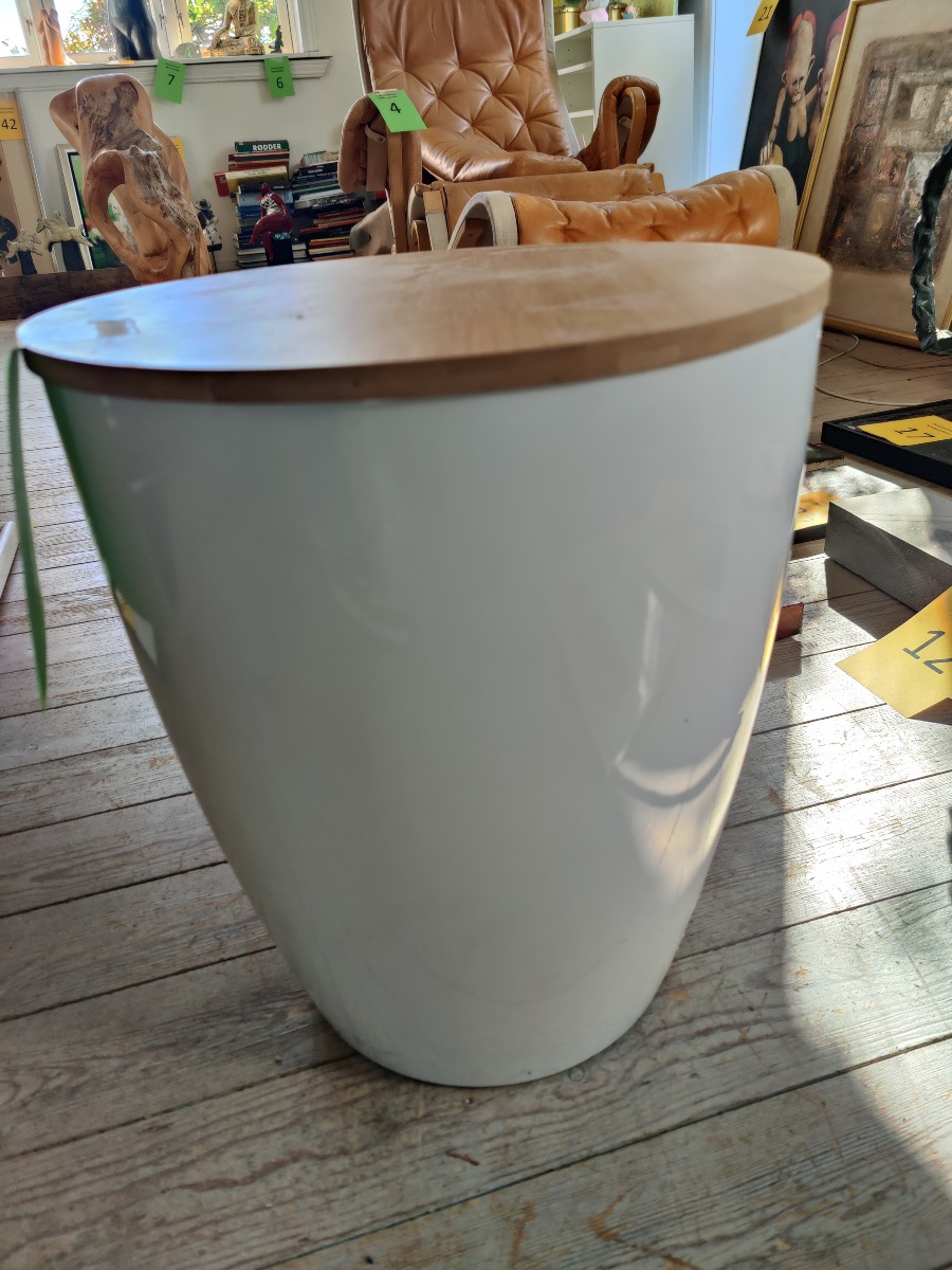 Opbevaringsskammel / bord i opal hvid med træ. Mål: H: 37 cm. Ø: 30 cm. Med alm. bruggspor, men pæn stand.