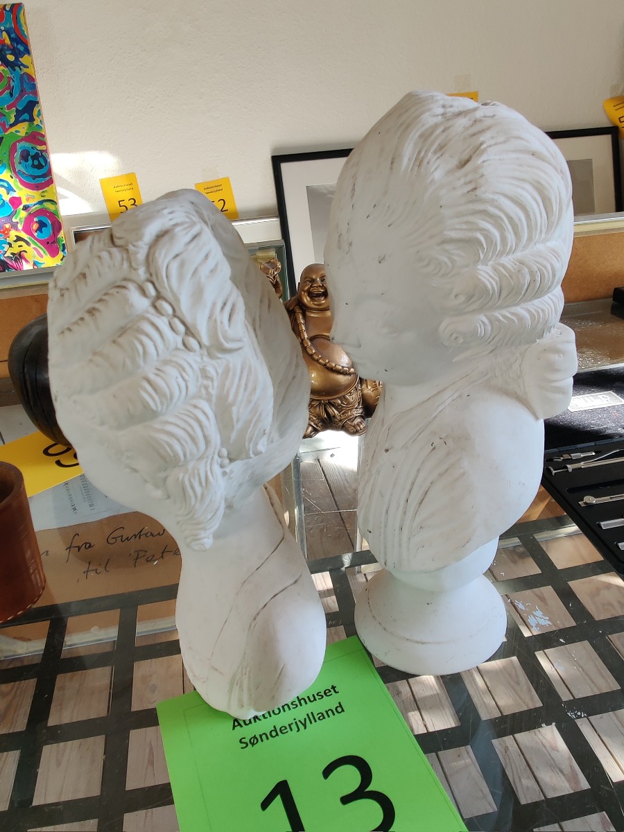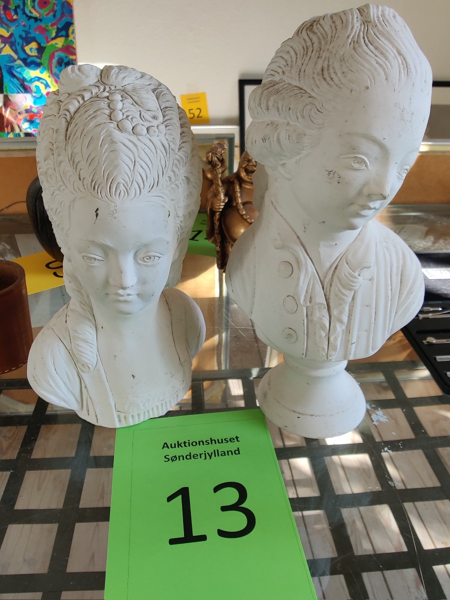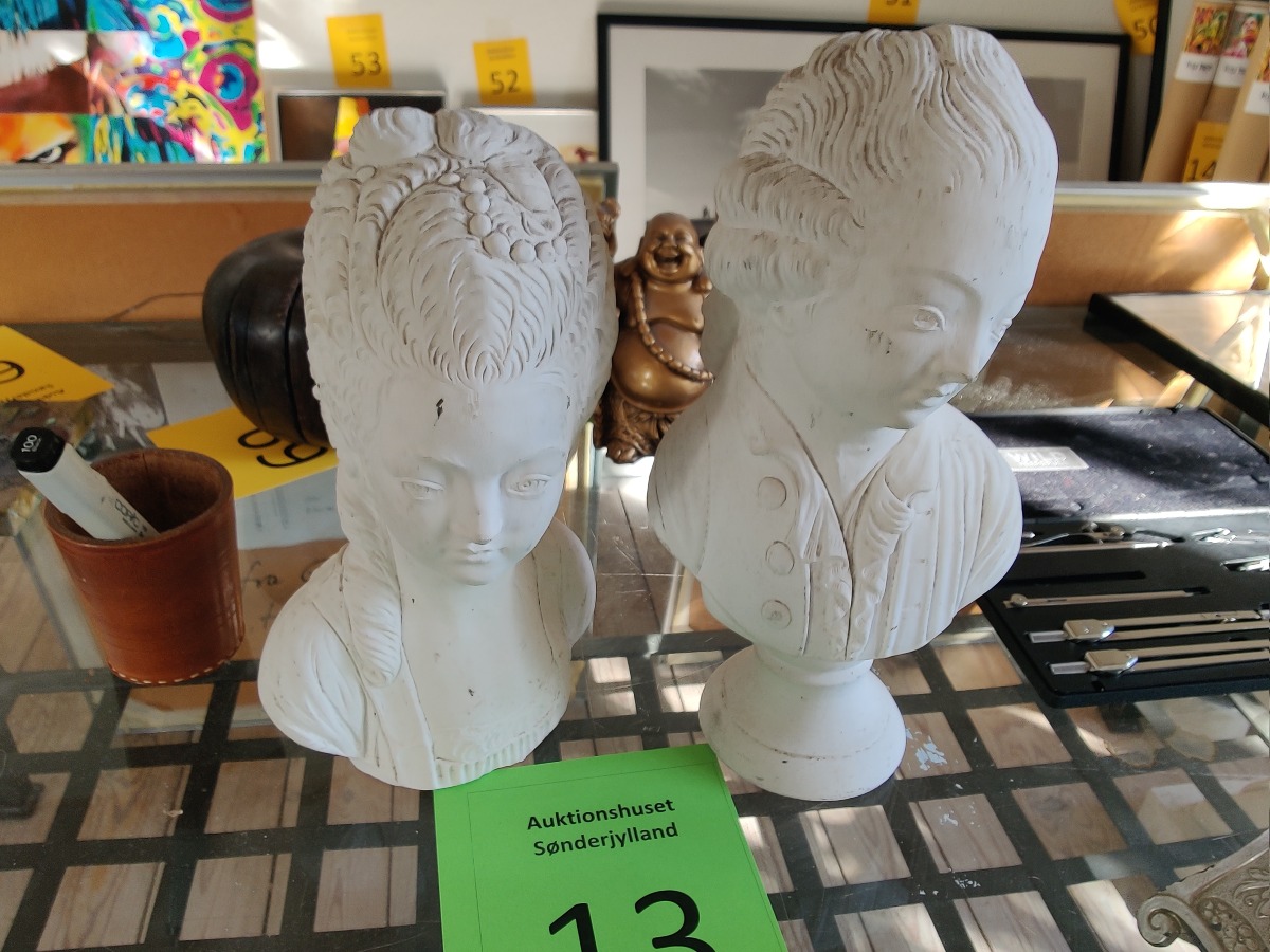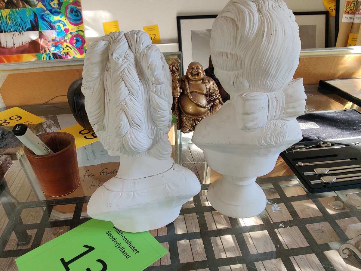 2 stk. Buster i gips / cement. Mand og kvinde 25 cm i højden. Med alm. bruggspor.