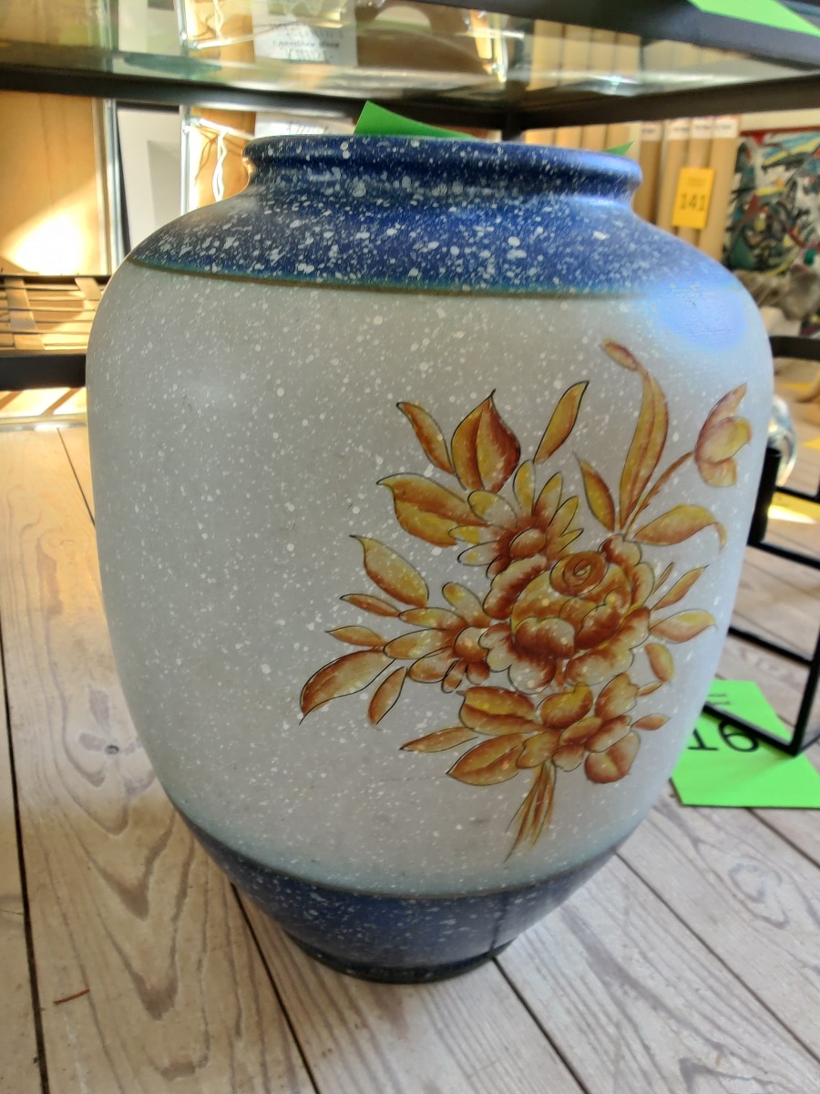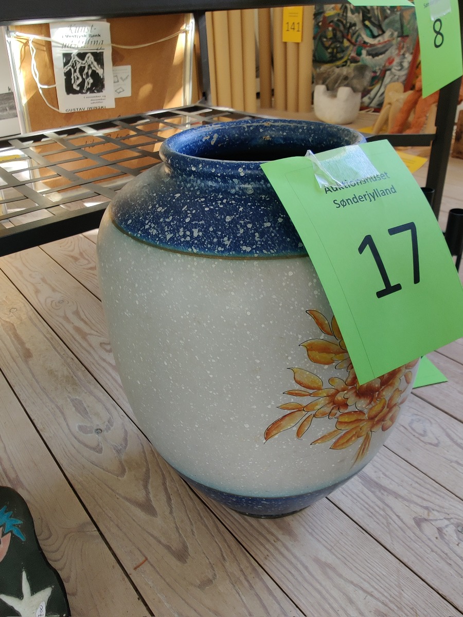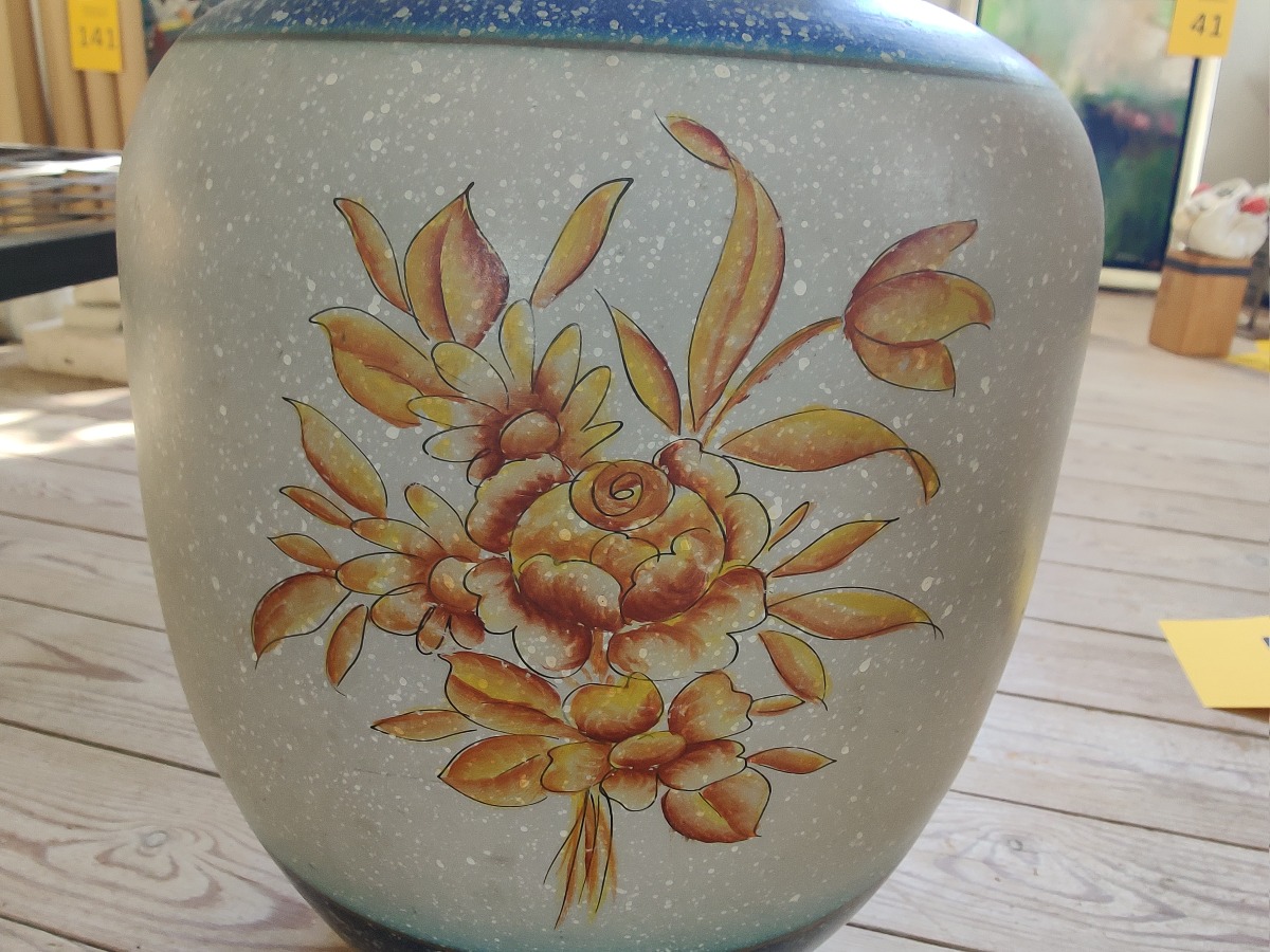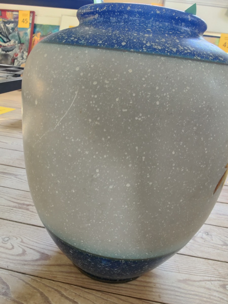 Ældre gulvvase i blå og grå med gylden blomst. Ca. H: 33 cm. Ø: 25 cm. Med alm. bruggspor.